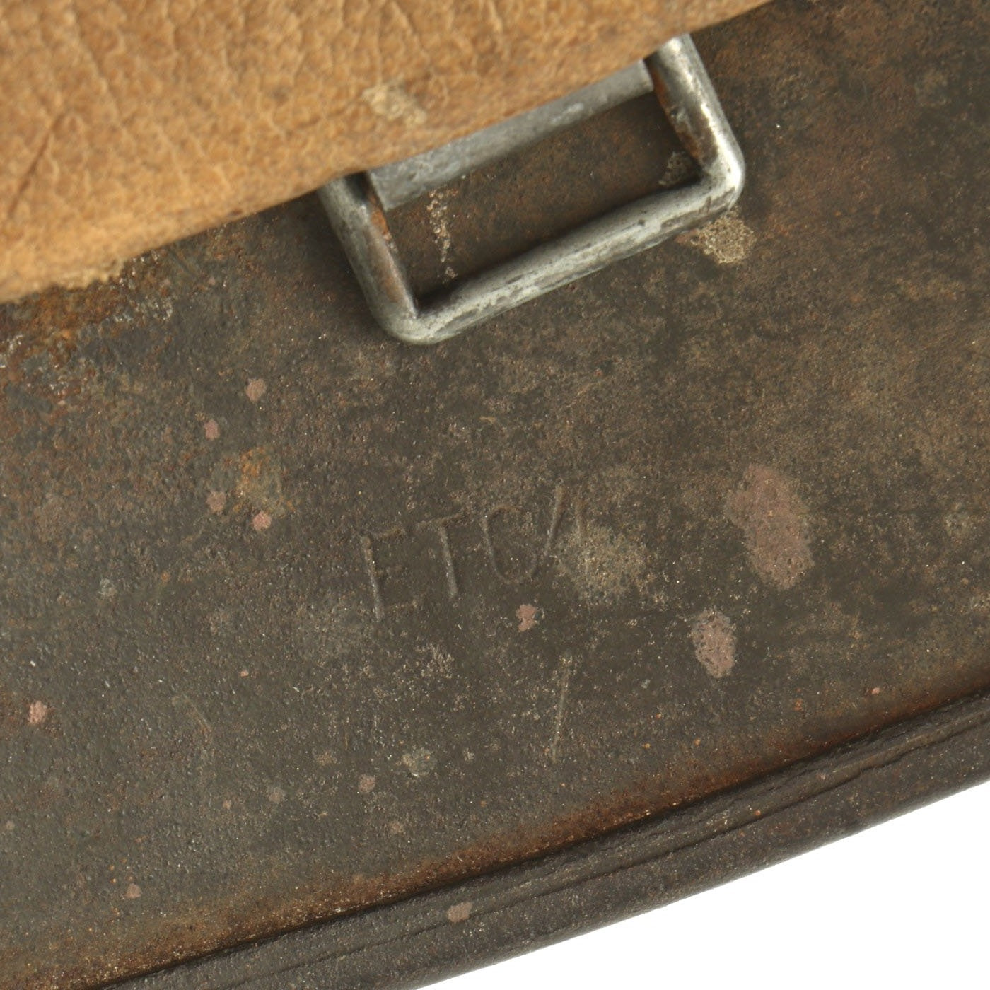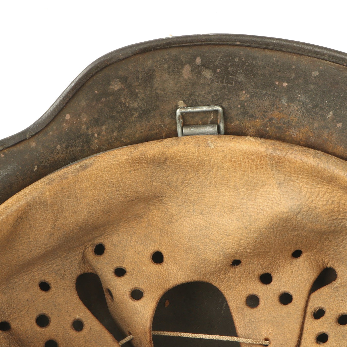 The reverse, interior, neck guard apron is heat lot number stamped 971, and the interior, left side, apron has the stamped manufacturer's code and size, ET64 indicating that it was manufactured by Eisenhuttenwerk AG of Thale, located in the Harz district in Saxony, Germany. Size 64 is a nice medium size that can accommodate liners from 56cm to 57cm or US 7 to 7 1/8. Size 64 shells are harder to find and are therefore more valuable to a collector.