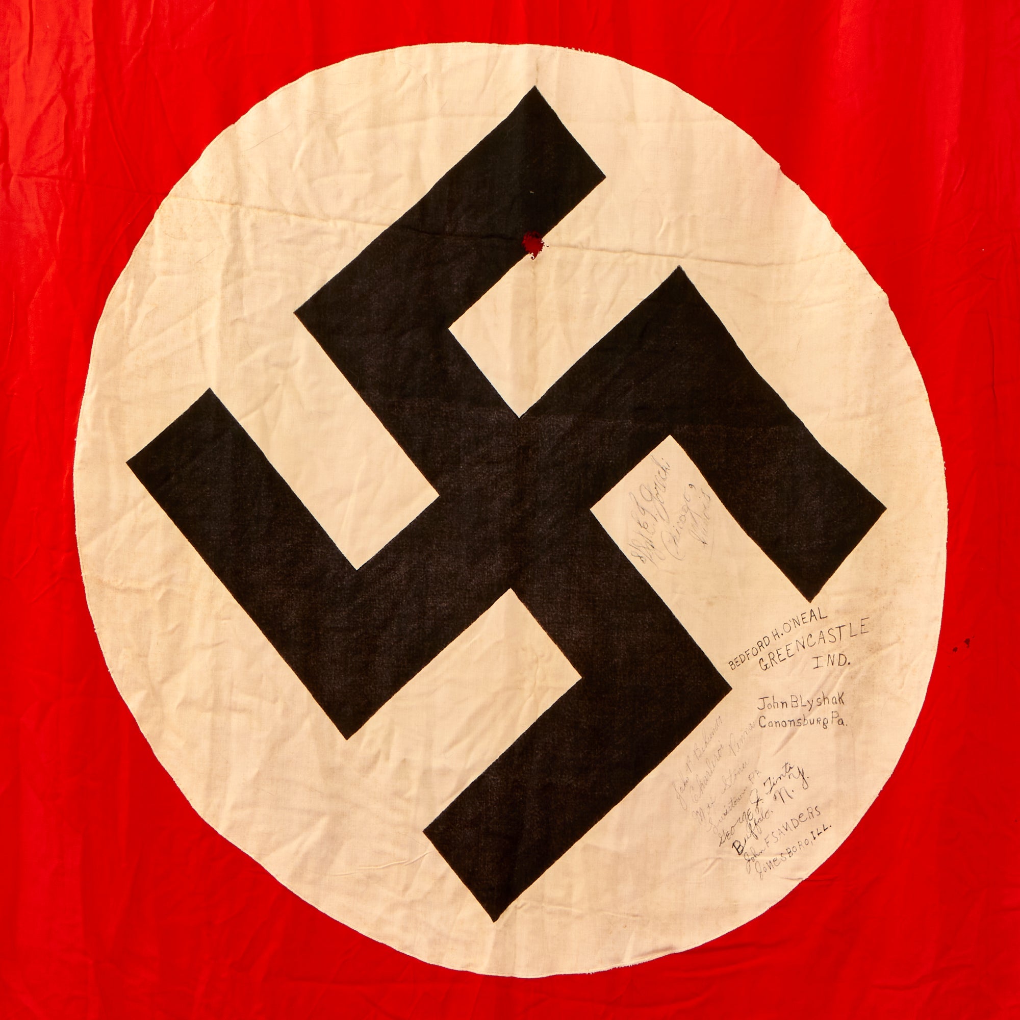 Condition is very good, but does show wear from use in service and possibly afterwards, with some tears, small holes, and other condition issues. The colors are very well retained, with light age toning to the white circles, and a vibrant red field. No maker markings are visible, and it features a folded over header sleeve for hanging the banner.
