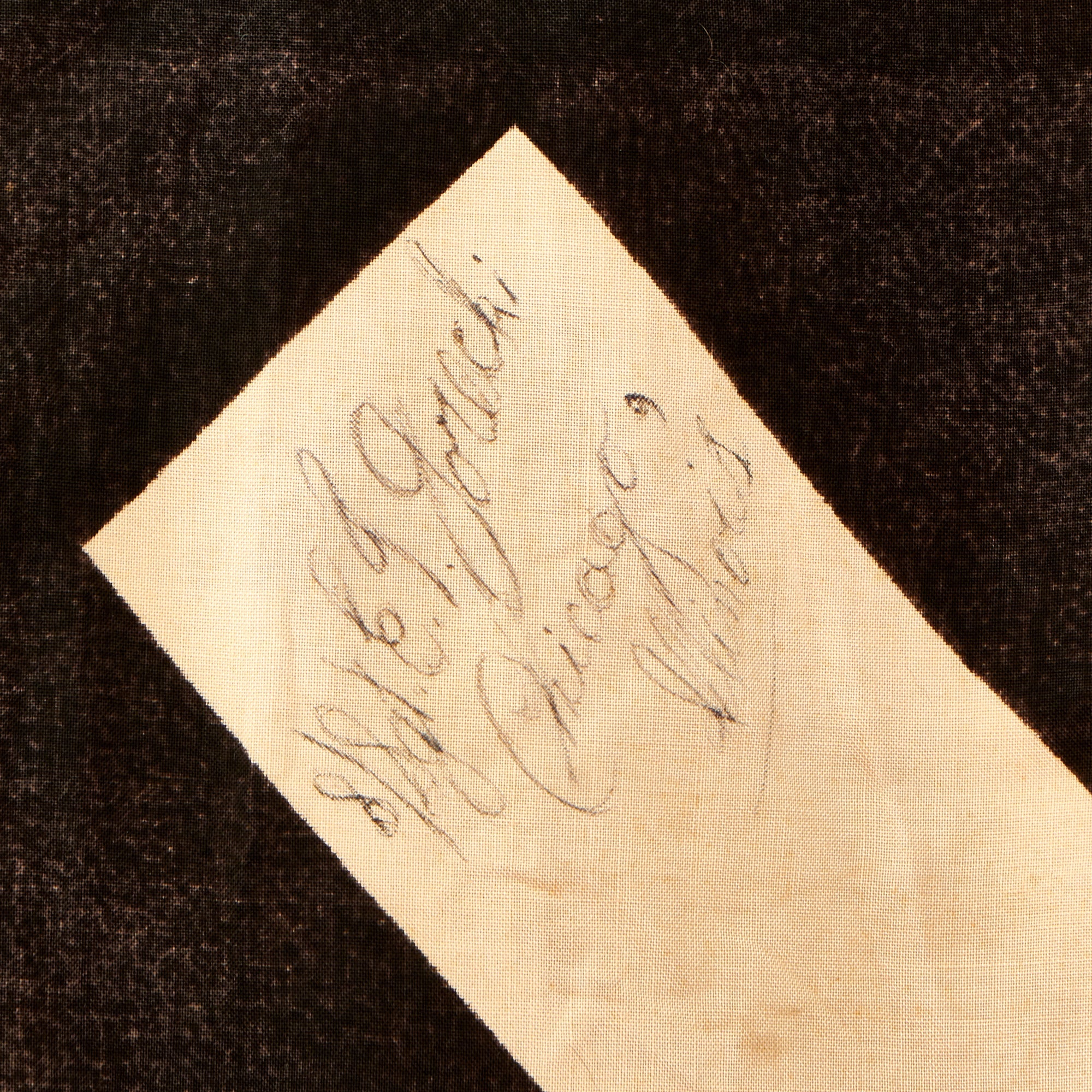 The most notable aspect of this flag are the USGI names on the flag, added after it was captured during the war. These signatures look to have been written by several different people., and as best we can tell, the names / locations read as follows: