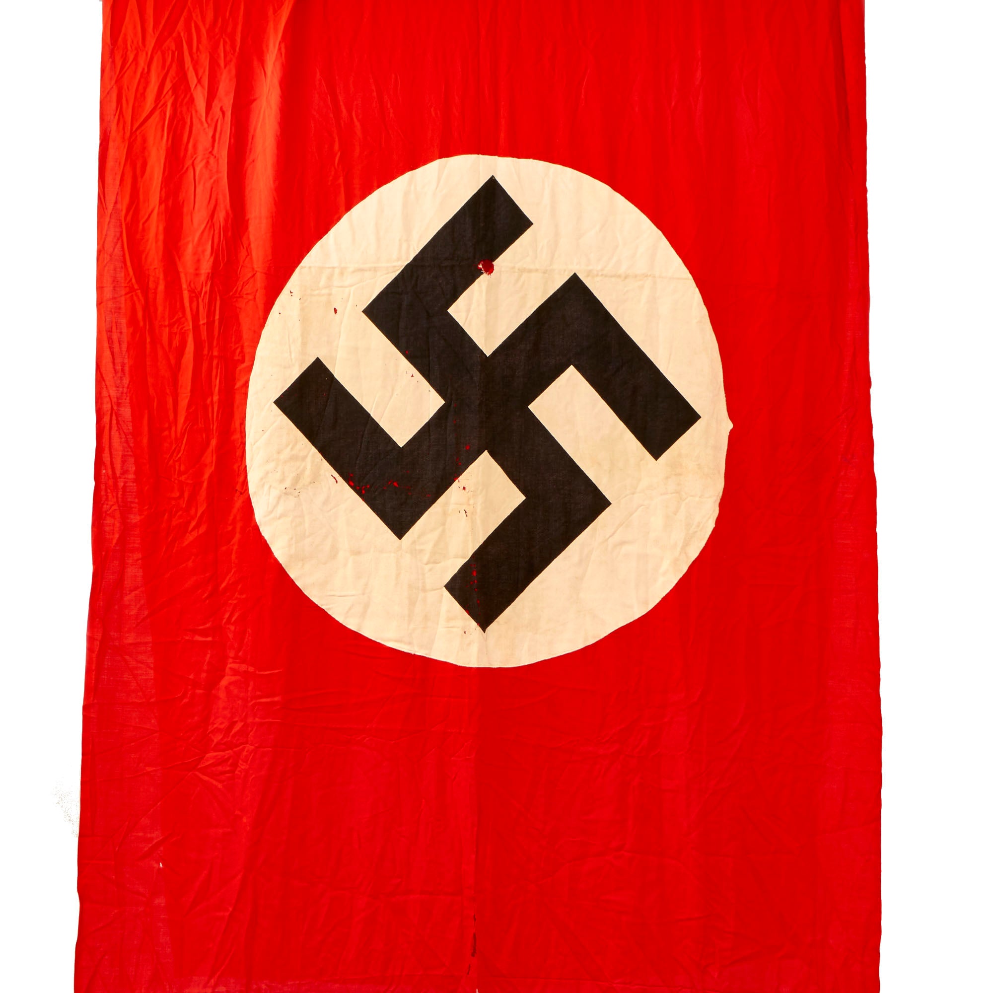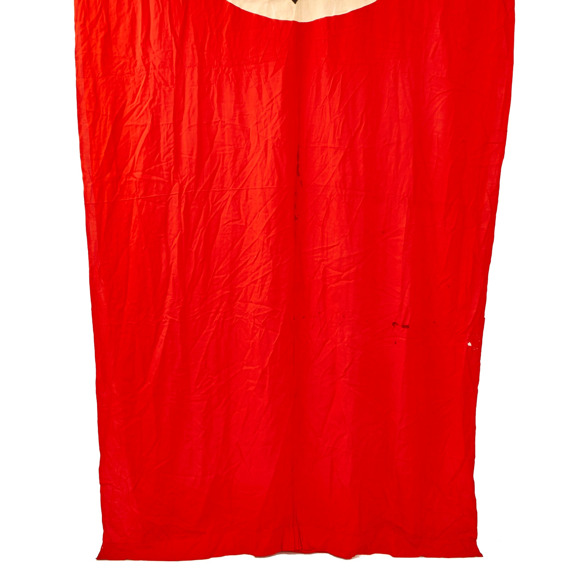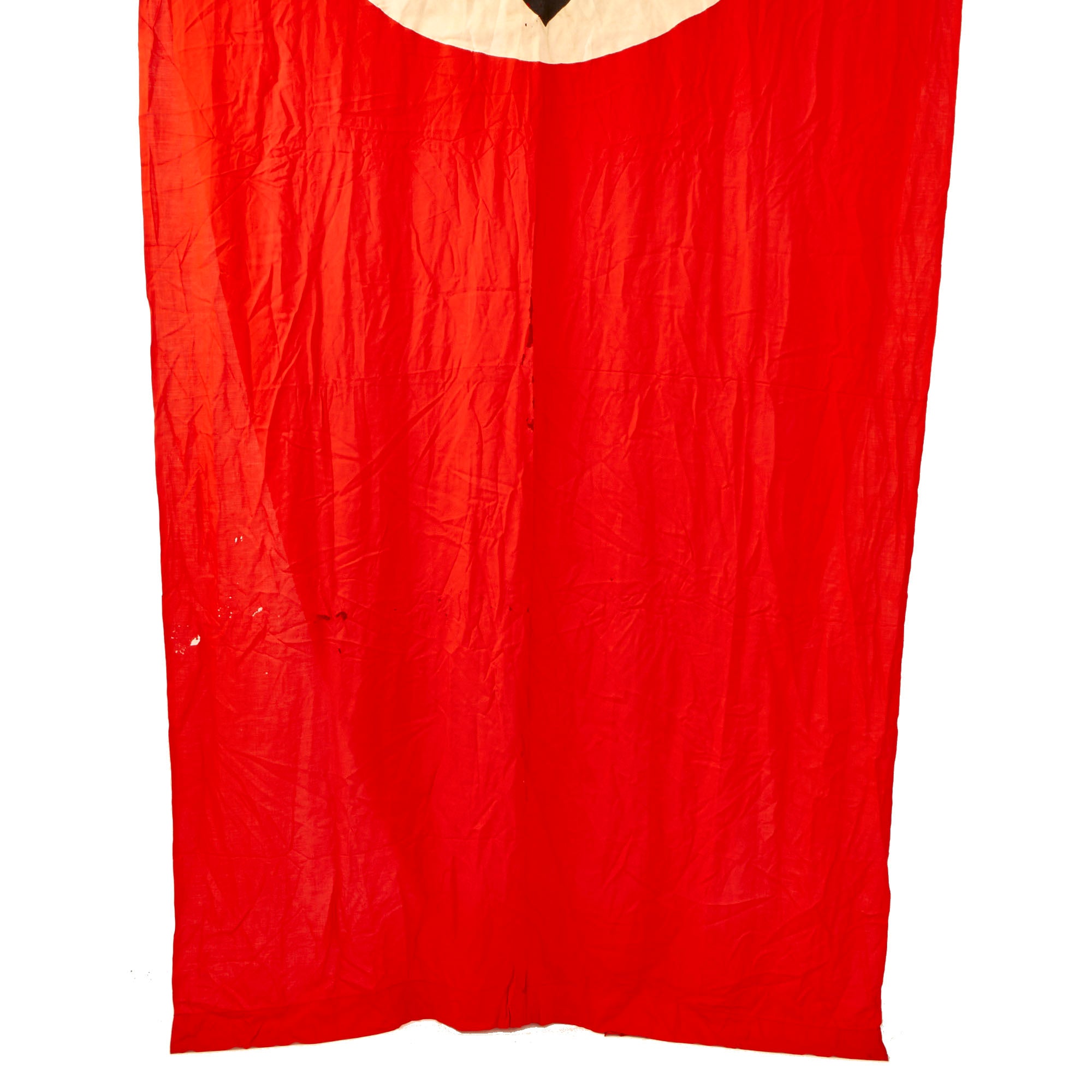 Original Item: Only One Available. This is a very nice condition WWII German National Banner, which measures a very large 148 inches long by 44 inches wide, or 12.33 ft. by 3.67 ft. These were used inside buildings, or possibly on podiums during speeches. It is of all cotton construction, and is double sided with a single piece cotton white circles with dyed black Swasses (Hook Crosses) sewn onto both sides.