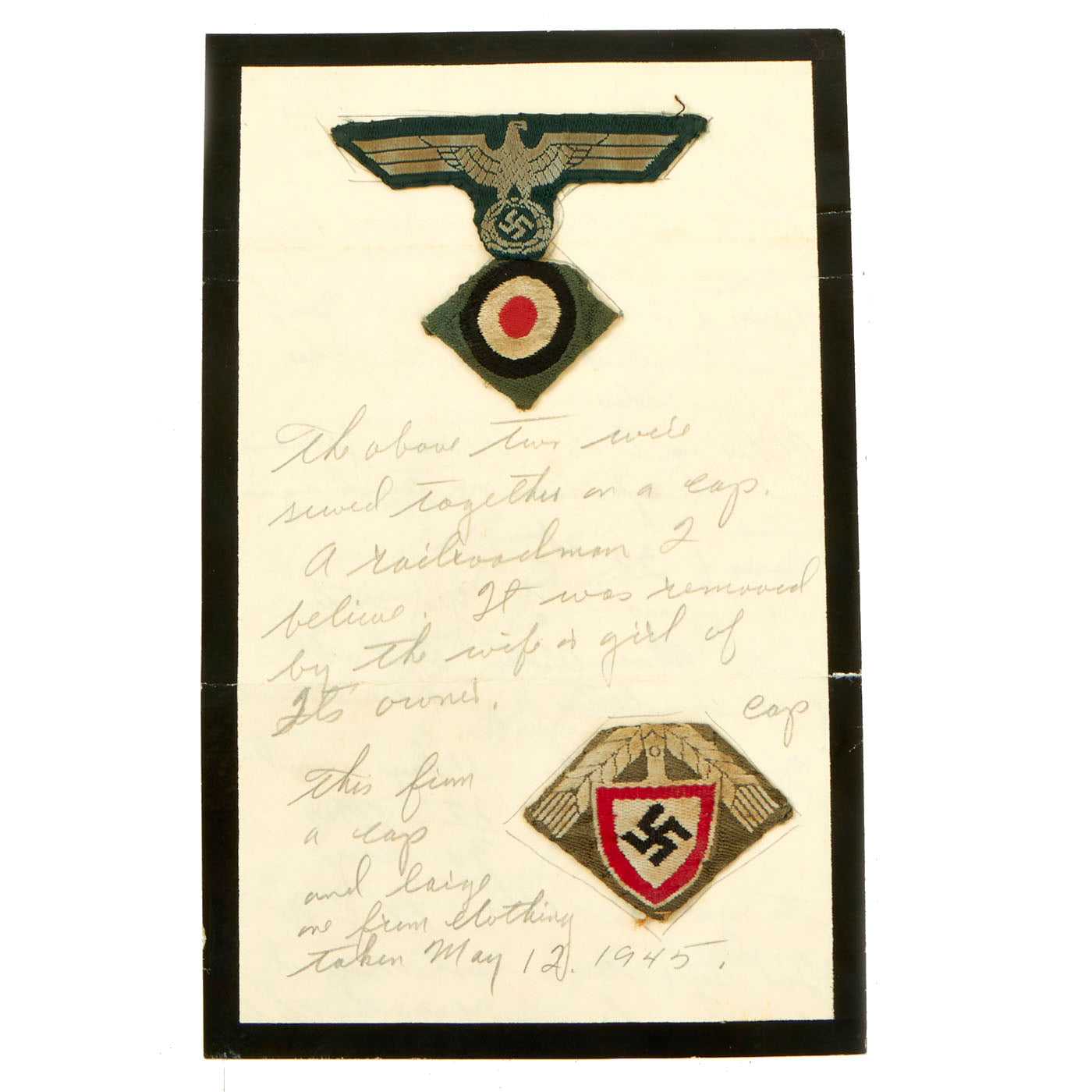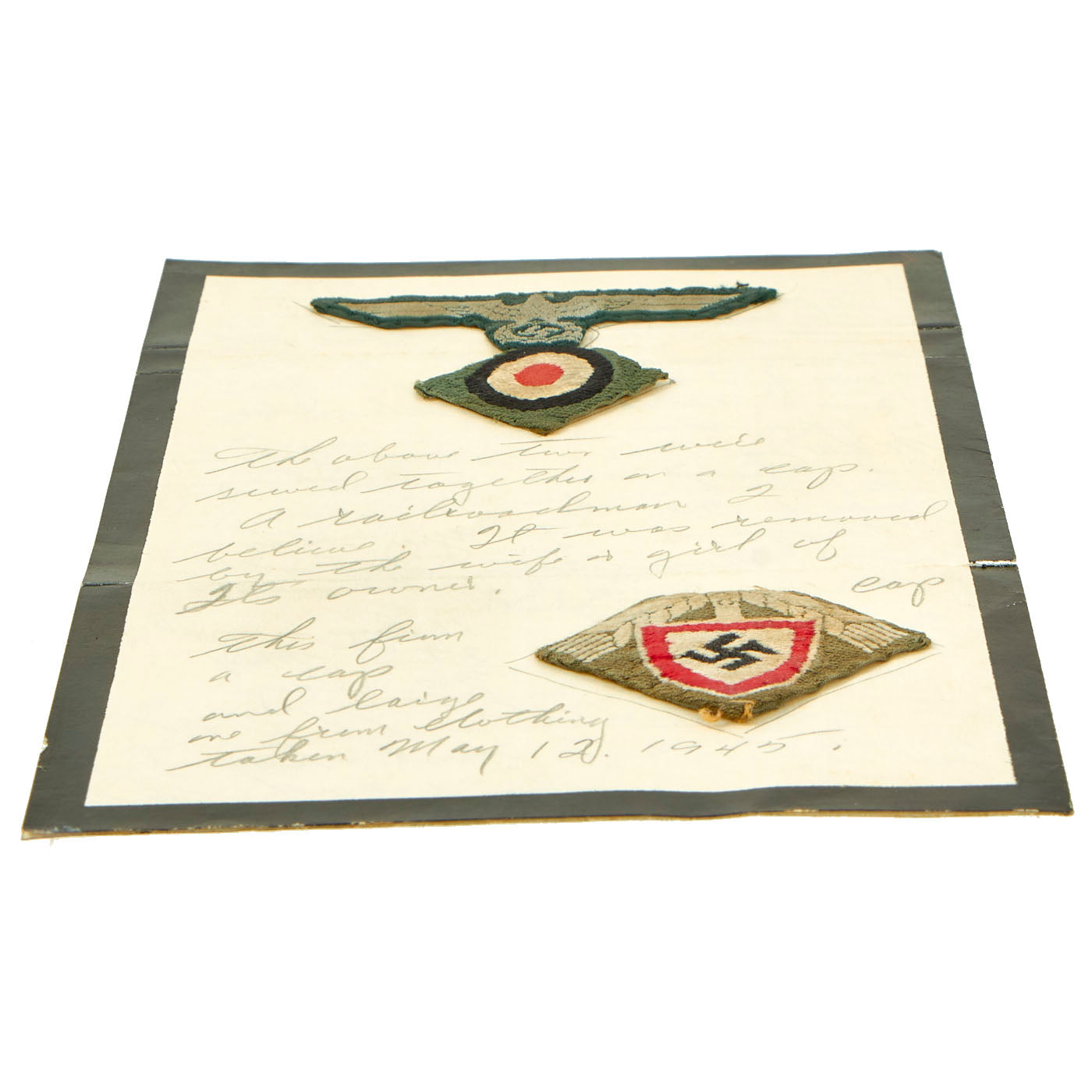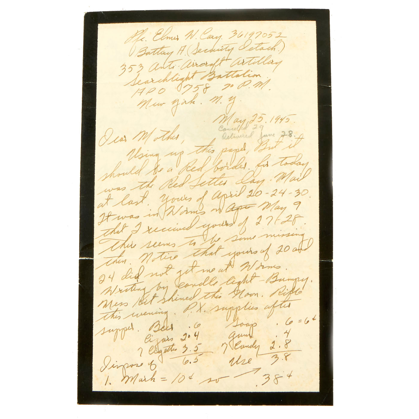 Original Item: One-of-a-Kind Set. This is a fantastic "Mailed Home" grouping, consisting of some German WWII cap insignia glued to a letter mailed home to his mother by Pfc. Elmer W. Cary, ASN 36197052. Per NARA records, Cary was born 1919 in Michigan, and enlisted in the U.S. Army in Kalamazoo, Michigan on April 21st, 1942. The letter itself id dated May 25, 1945, and indicates that at the time Cary's posting was: