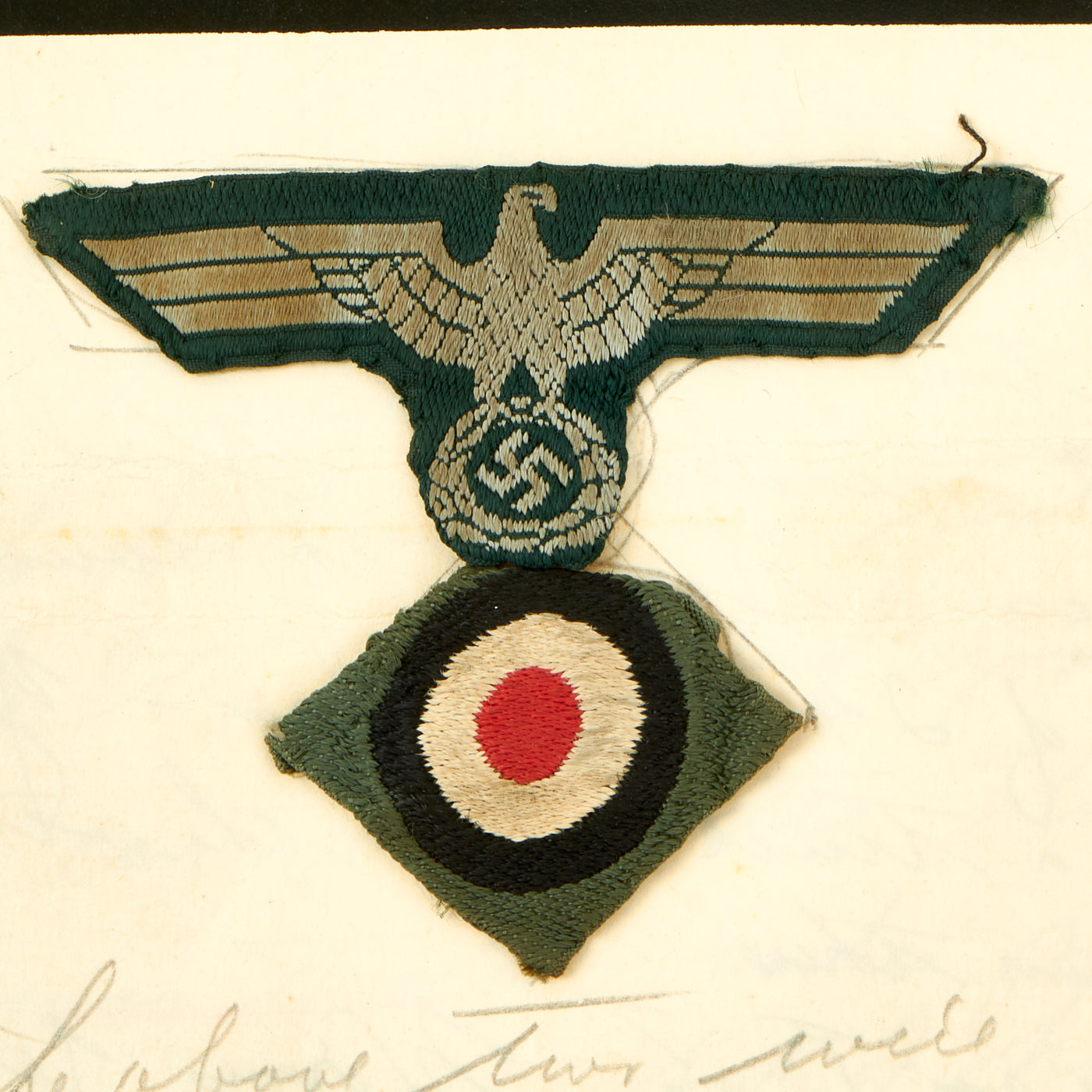 On the back of the letter, there are some German WWII cap insignia attached, complete with captions describing them. The upper set is a standard late war BeVO Reichsadler Eagle and Cockade set, as would be used on M38 or M42 Field caps. The caption on this one reads: