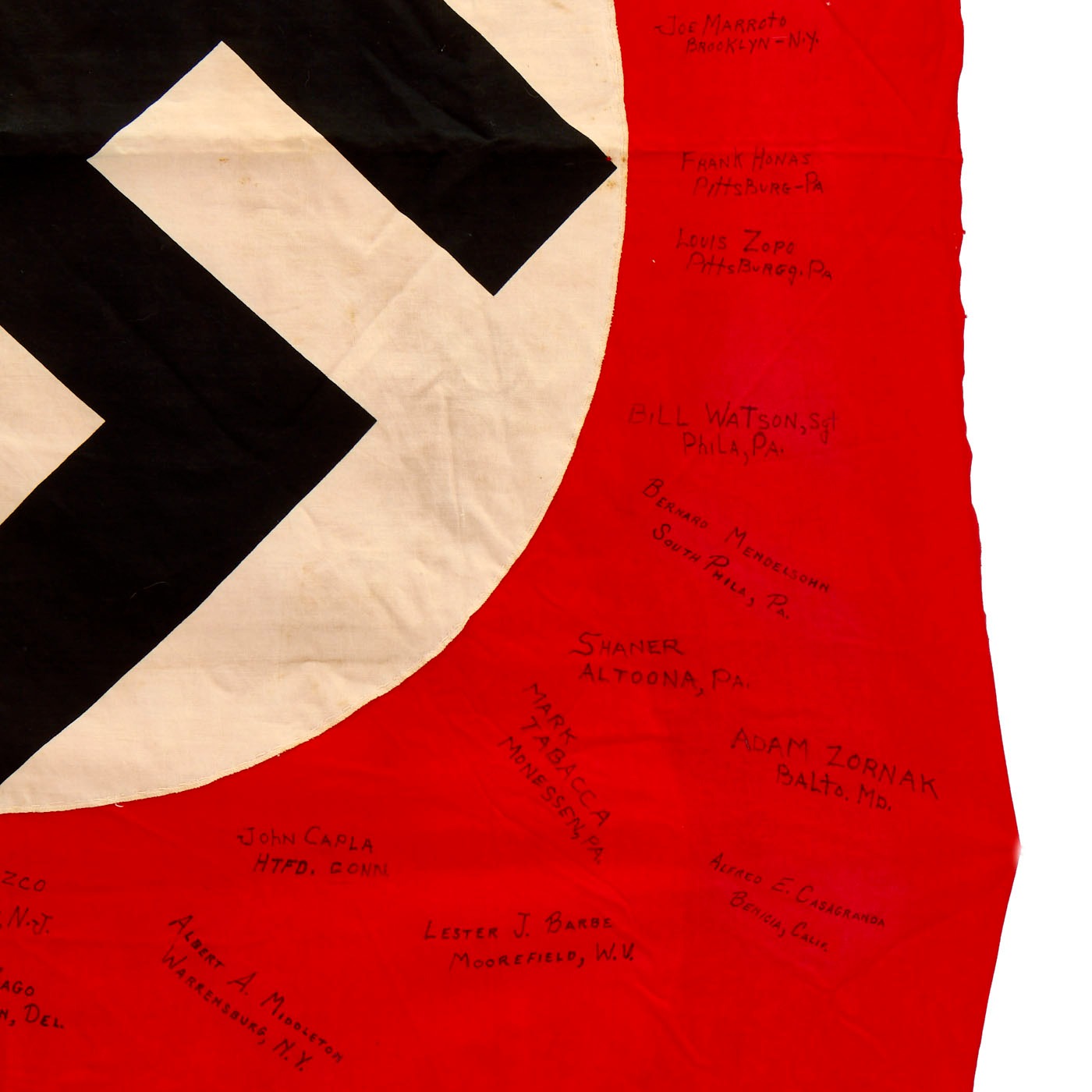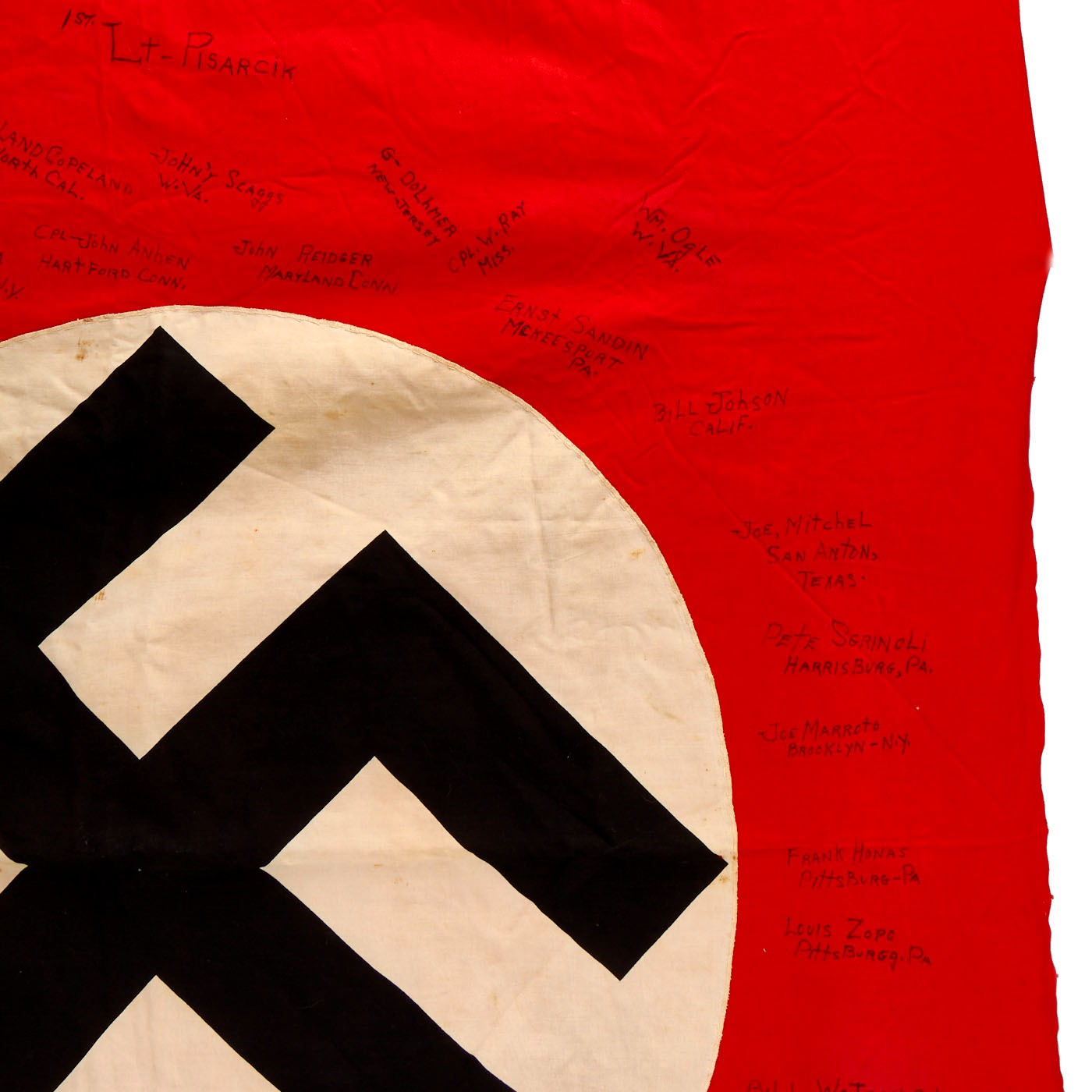 The most notable aspect of this flag are the numerous USGI names on the flag, which look to have been written by several different people. When these flags were made it was common for whoever had the best / fastest handwriting to add the names. These read as follows: