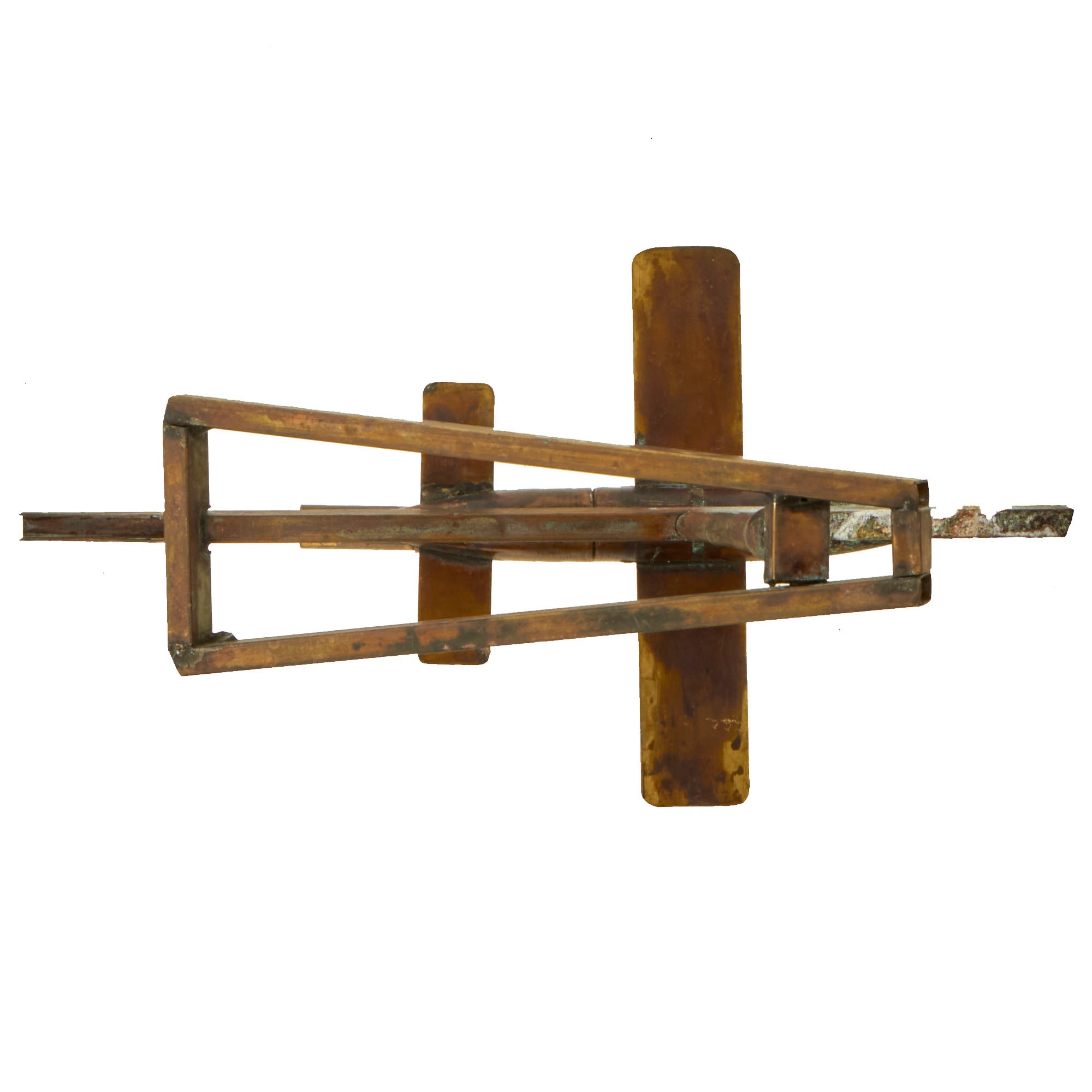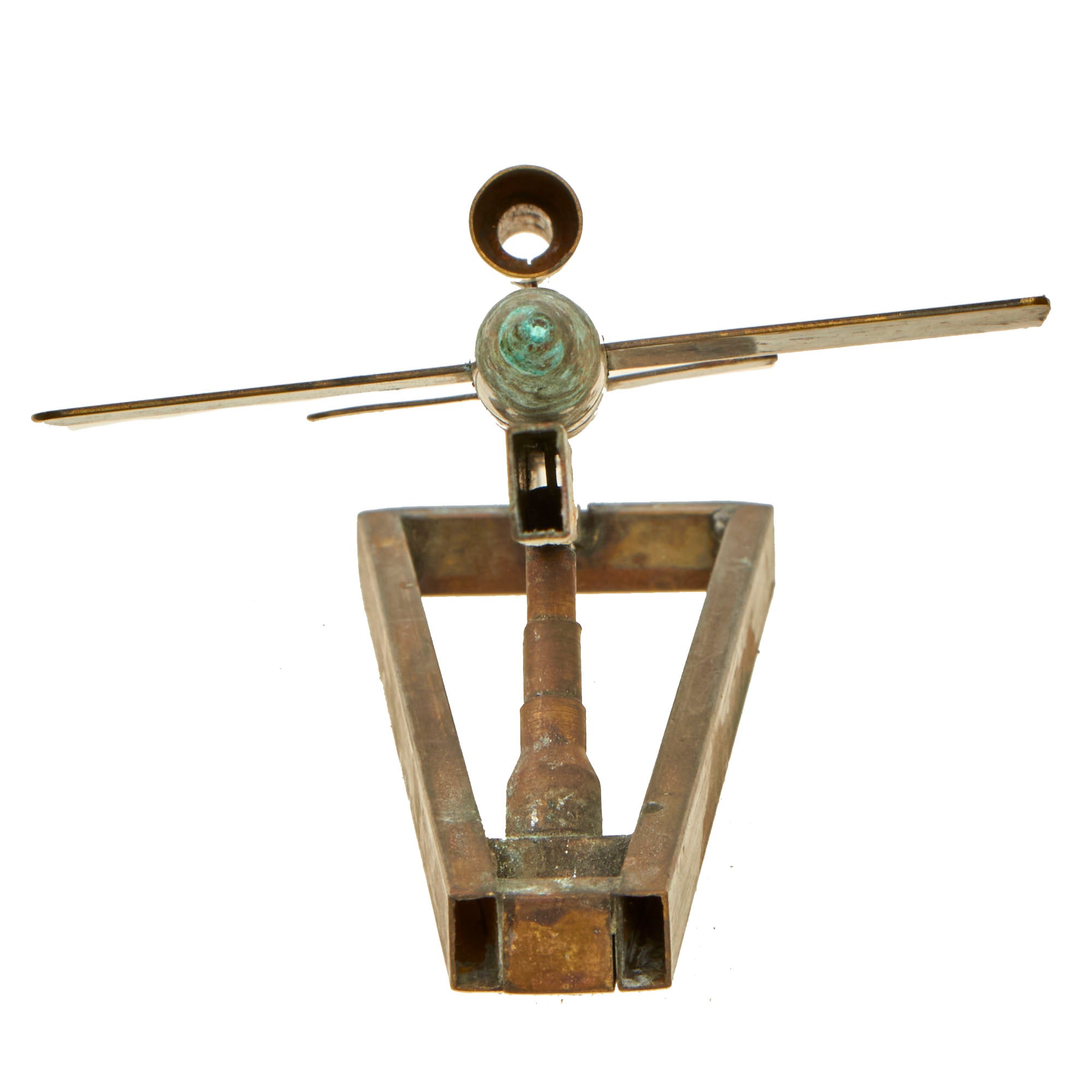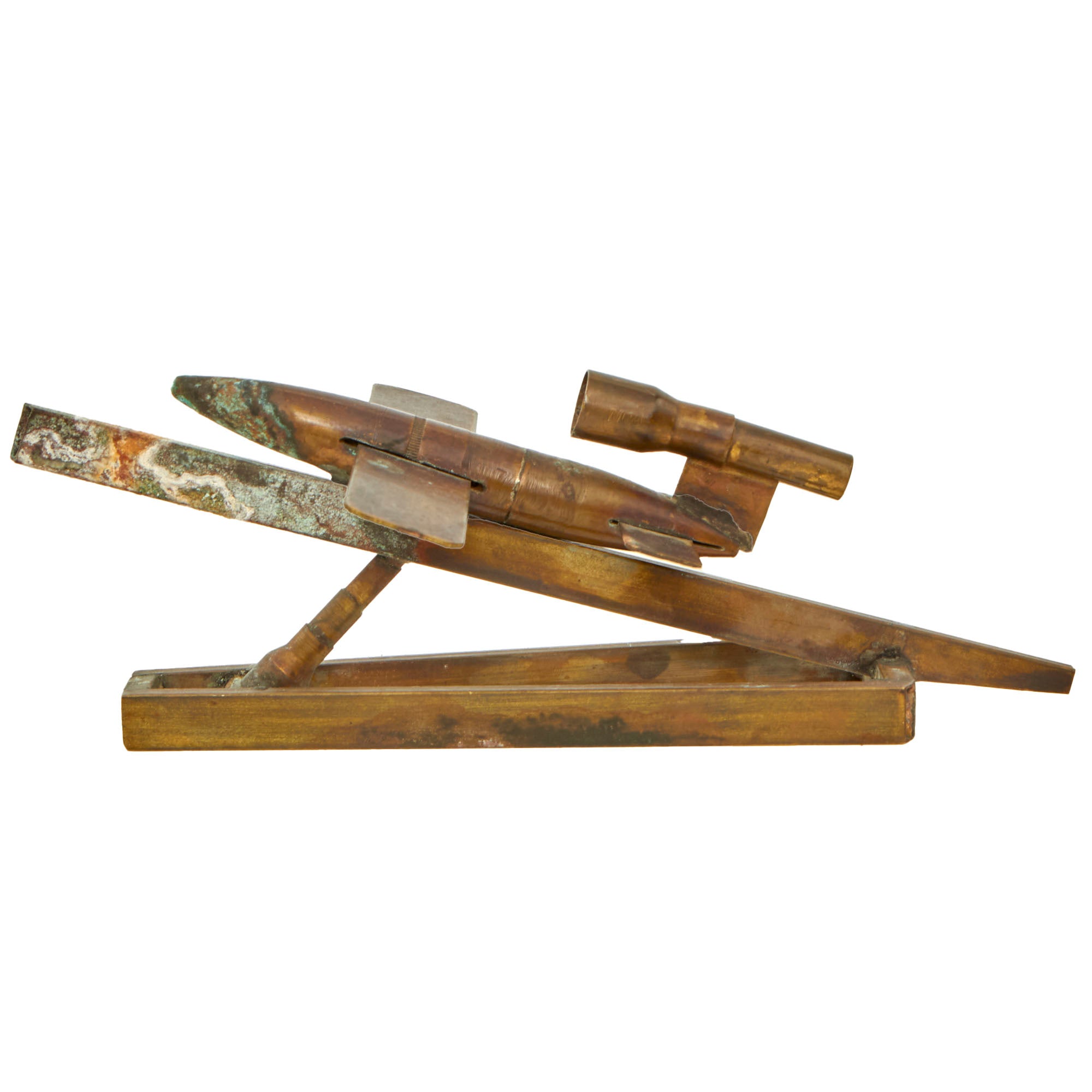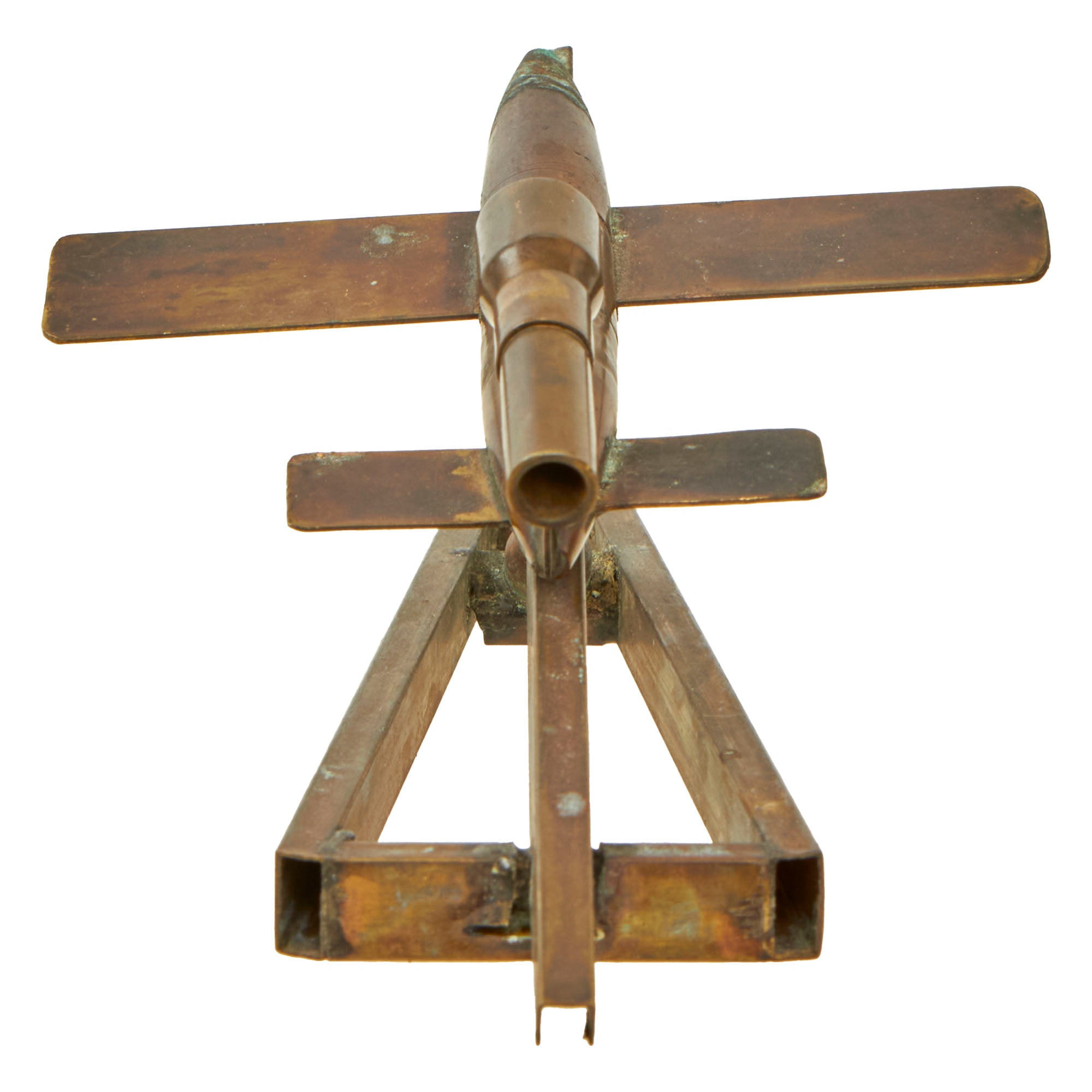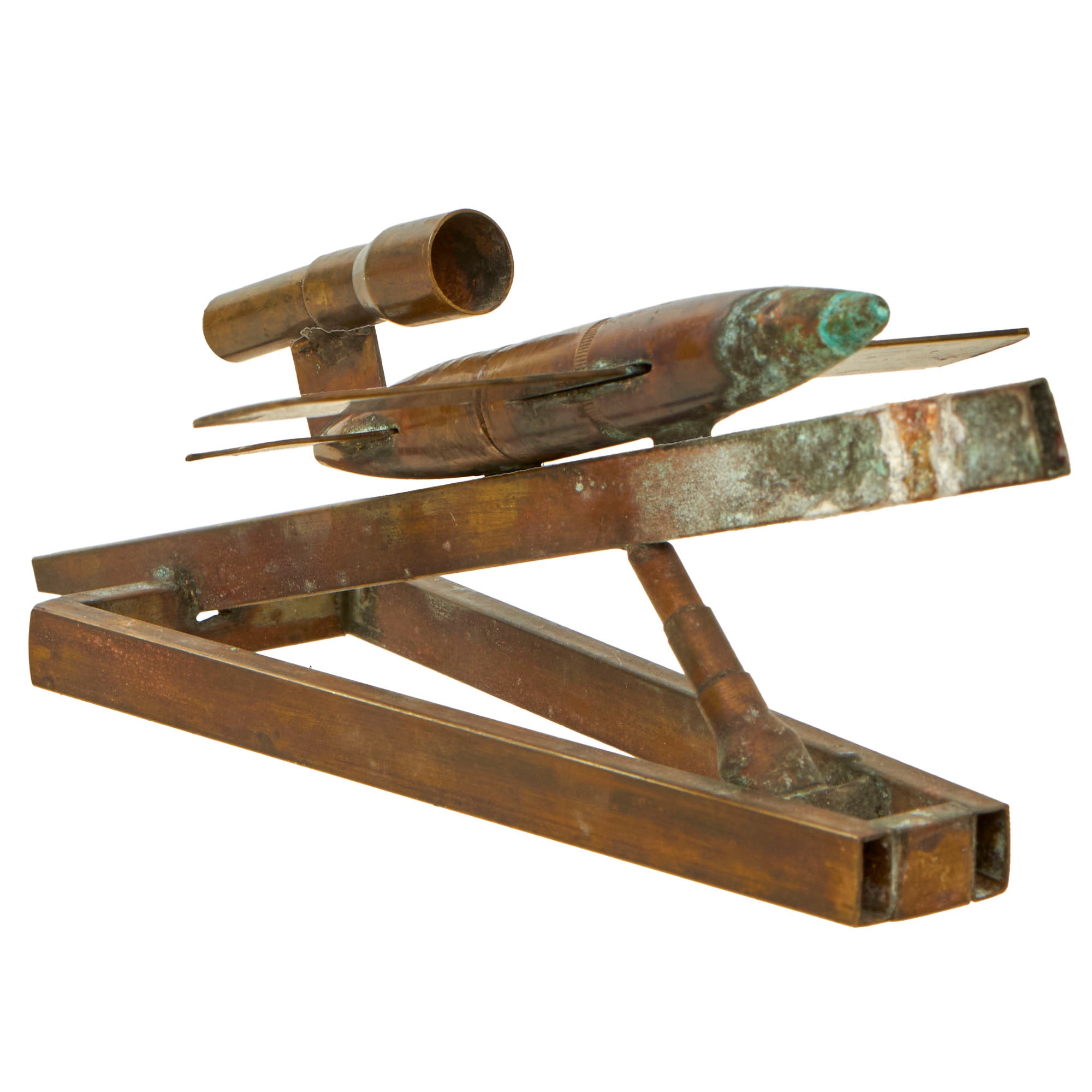 This is a scarce piece of Trench art modeled directly after the V1 Flying Bomb. It sits on a ramped stand and the entire piece measures roughly 6¾ x 4 x 2½”. The front end of the stand and the tip of the rocket shows heavy oxidation. A very interesting piece of trench art modeled after a very well-known piece of technology developed during the war. Comes ready for further research and display.