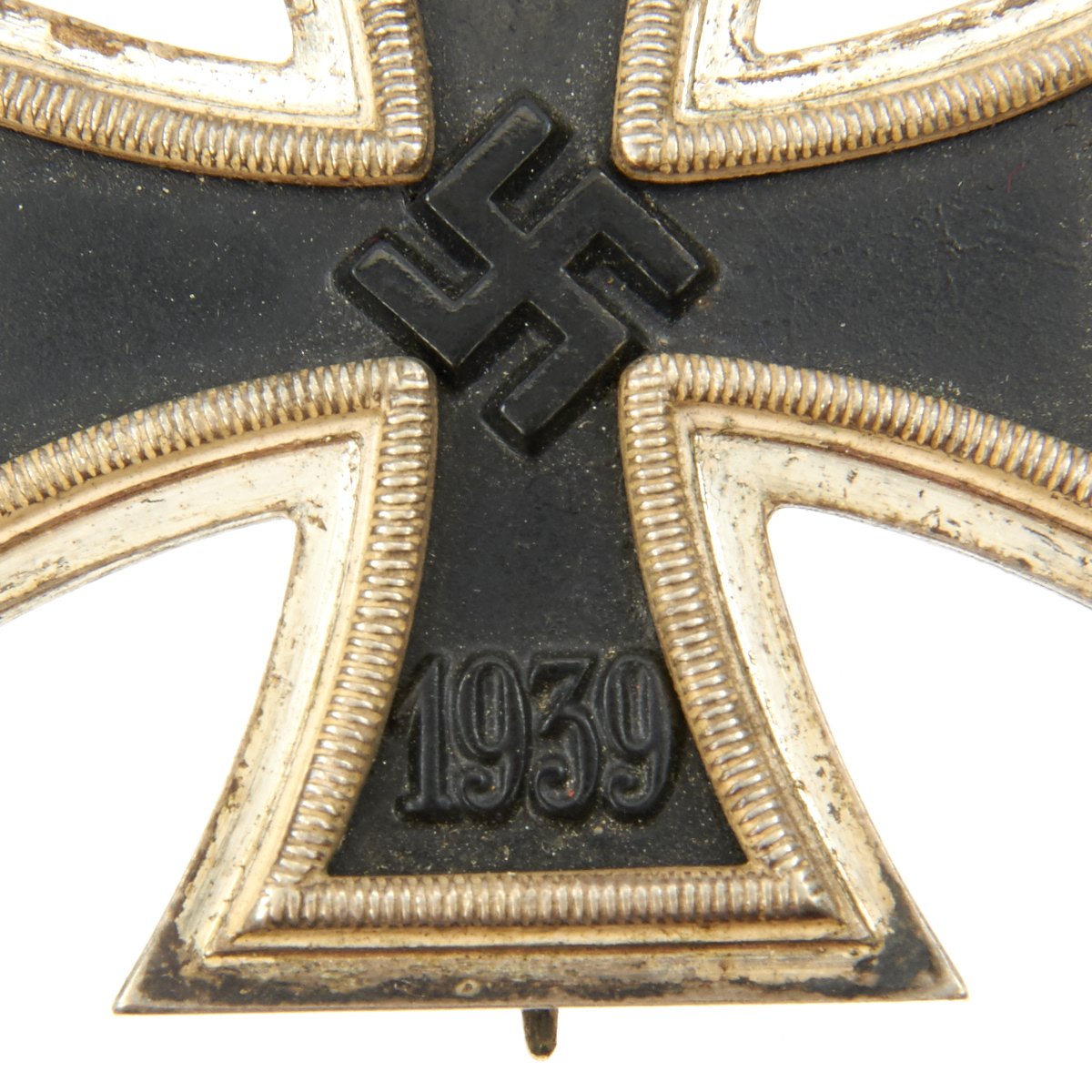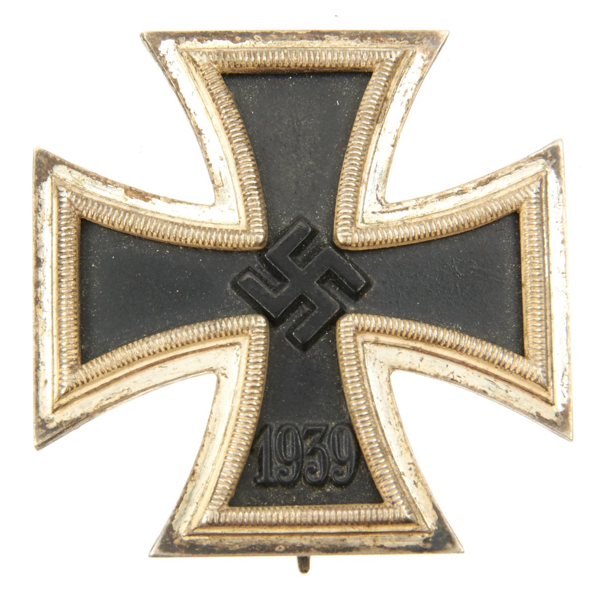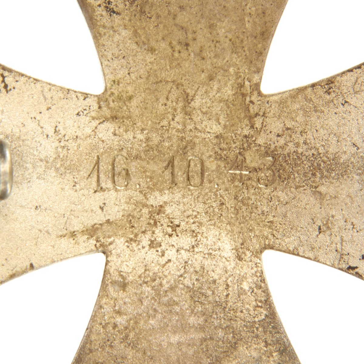 Original Items: Only One Available. This a nice example of a WWII Iron Cross First Class 1939, with a Magnetic core, vaulted design, and back clip attachment. It is maker marked 26 on the pin for maker Klein & Quenzer of Idar-Oberstein a.d. Nahe. The reverse of the medal is inscribed 16.10.43 which stands for October 16, 1943 and represents the day the award was earned. This iron cross is in very fine condition, with a lovely patina on the silver, and the black on the cross is excellent.