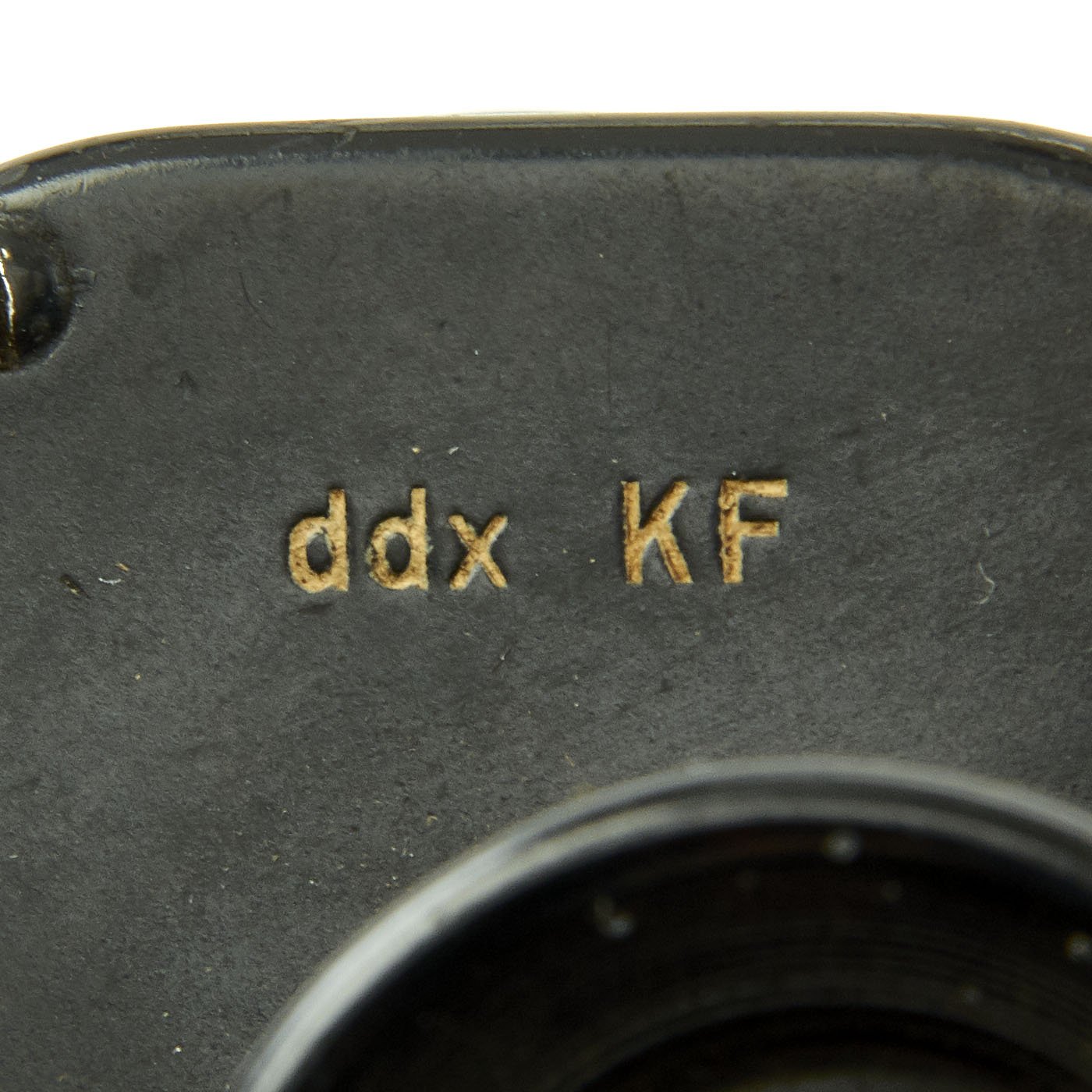 "ddx" is the German three letter code for maker Voigtländer & Sohn AG of Braunschweig, a maker of optical equipment. KF is apparently a symbol for the type of grease to be used. The use of a three letter code indicates that these were made after 1940. Both diopter adjustments work correctly, and there is just a bit of haze when viewing. The leather chin strap is present and complete, though it is delicate, and partly torn through around one securing rivet, which has been stabilized with thread.