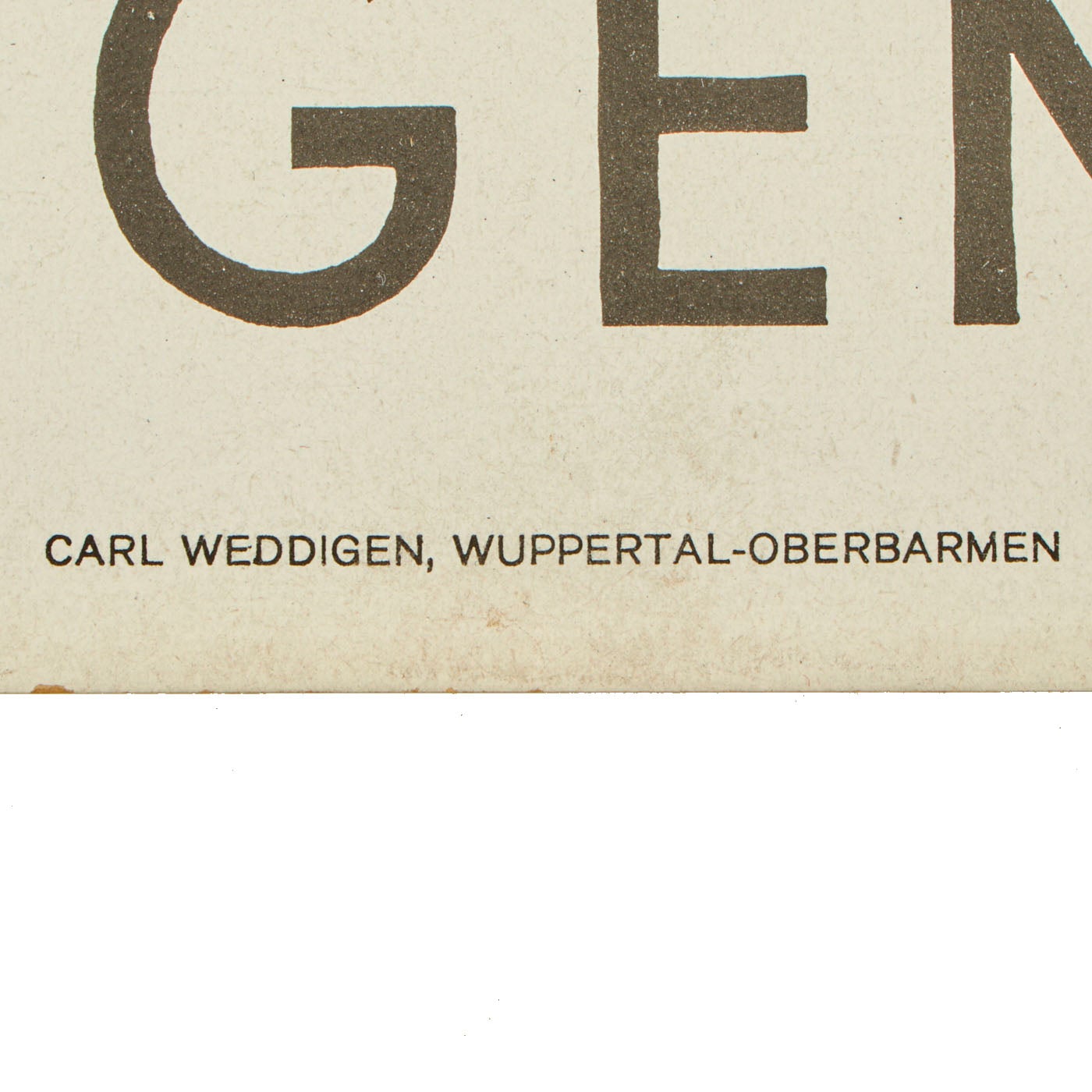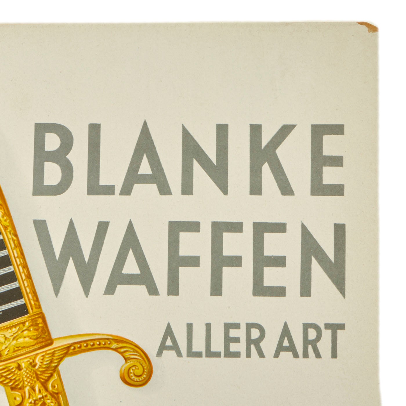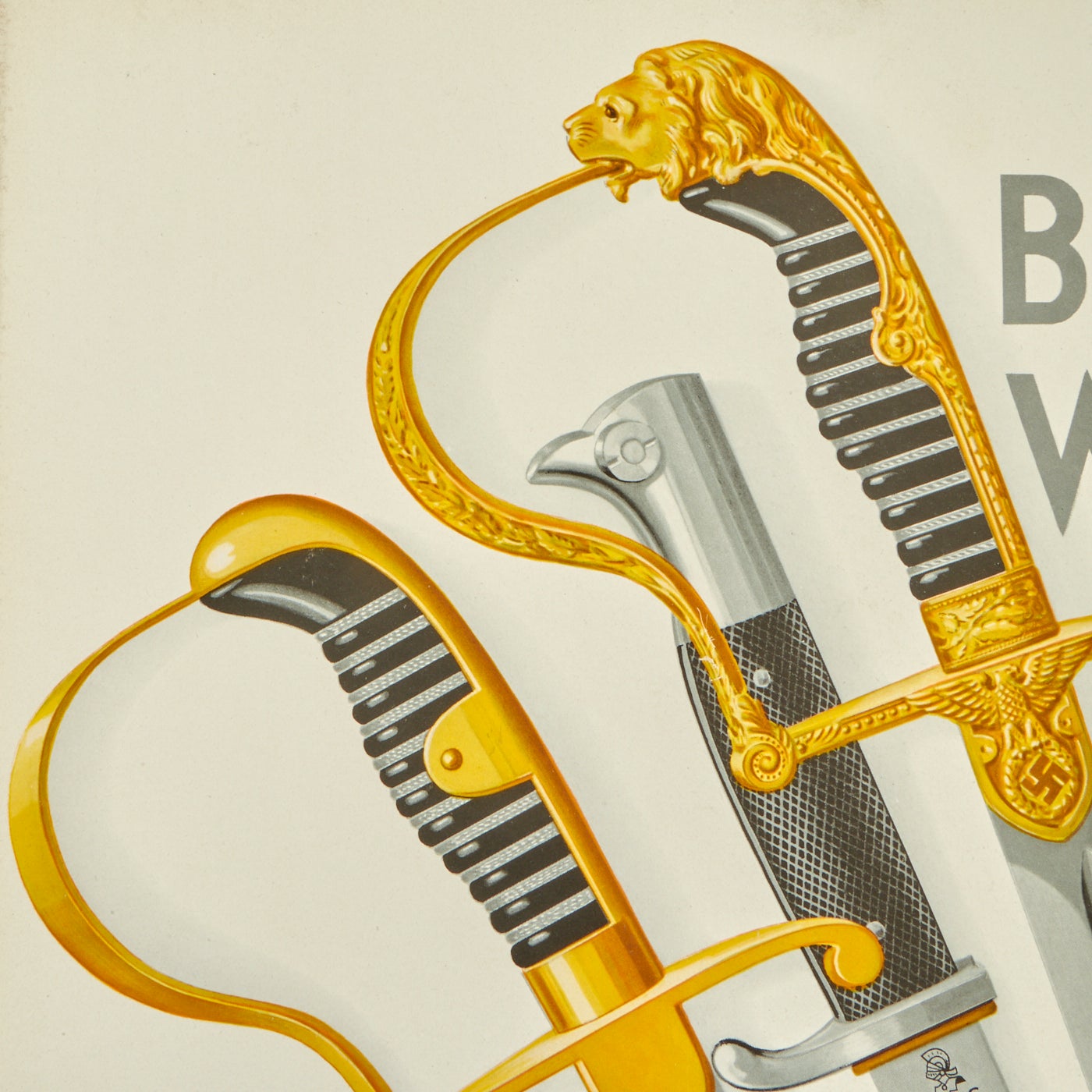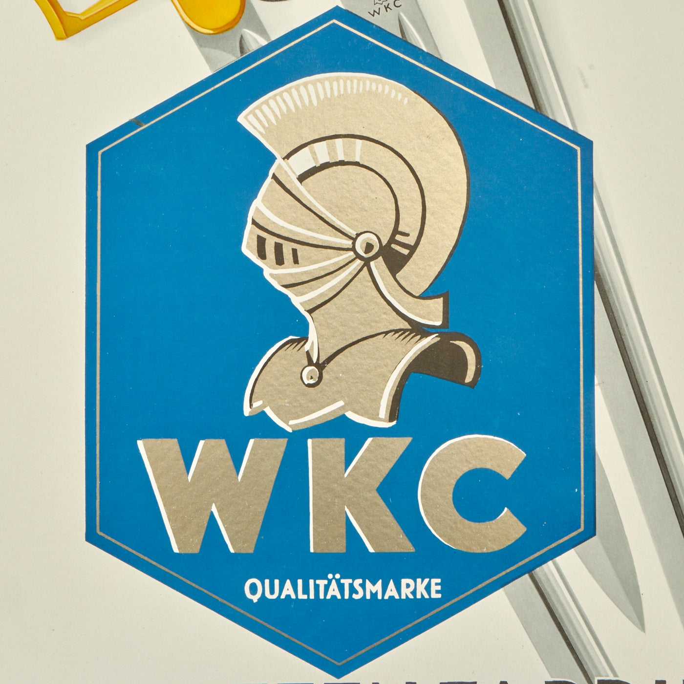 • Original Item: Only One Available. This is a very nice Window Advertisement sign, used by retailers carrying edged weapons made by the Legendary W.K.C. Waffenfabrik (Weapons Factory), otherwise known as Weyersberg Kirschbaum & Cie. The upper right has the statement BLANKE WAFFEN ALLER ART, or "Edged Weapons of all Kinds", so this was an advertisement for their line of dress swords and bayonets. The sign is made of pressed paper cardboard, and measures 19"H x 12 1/2"W.