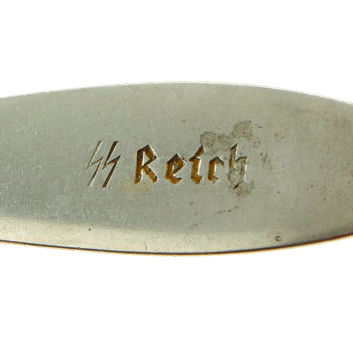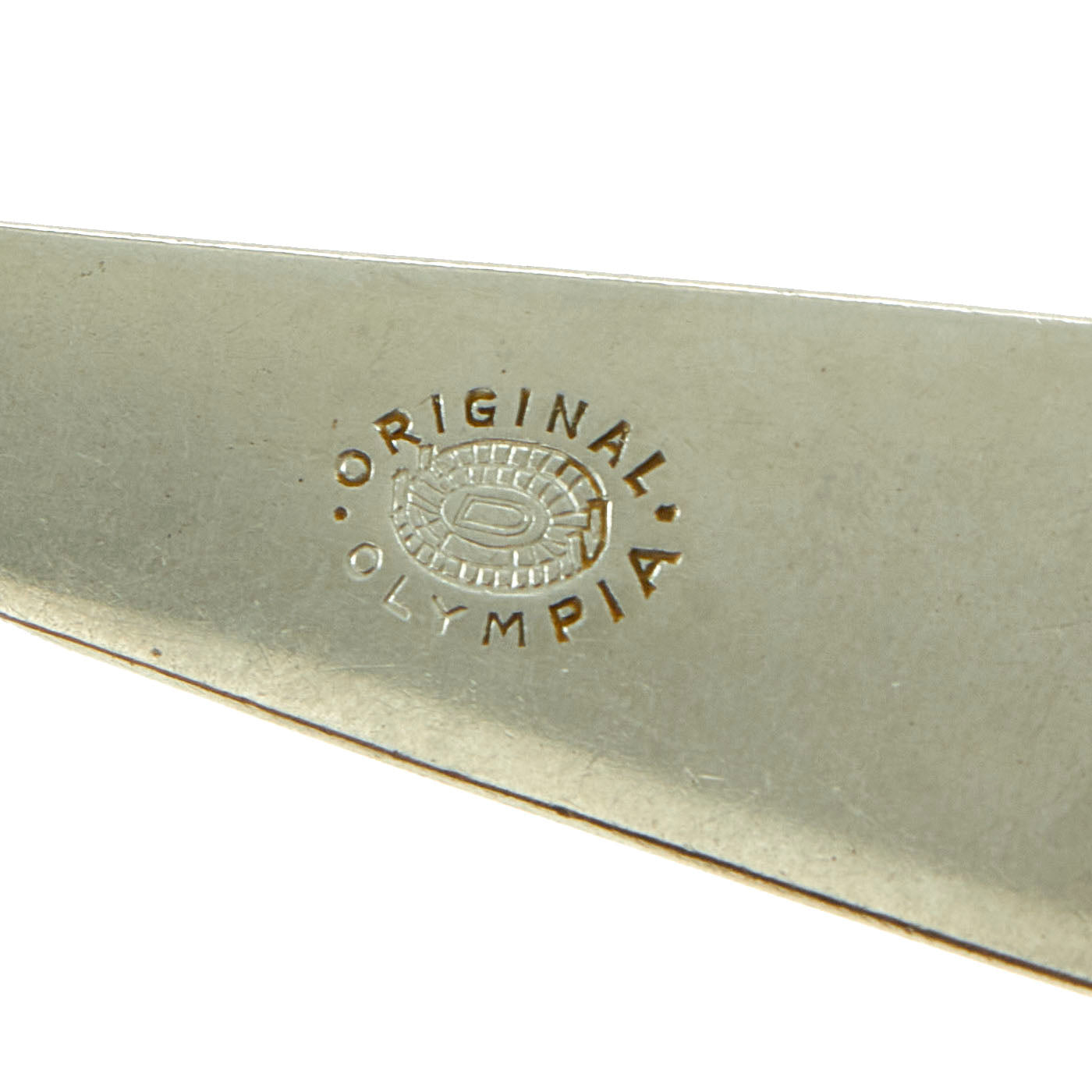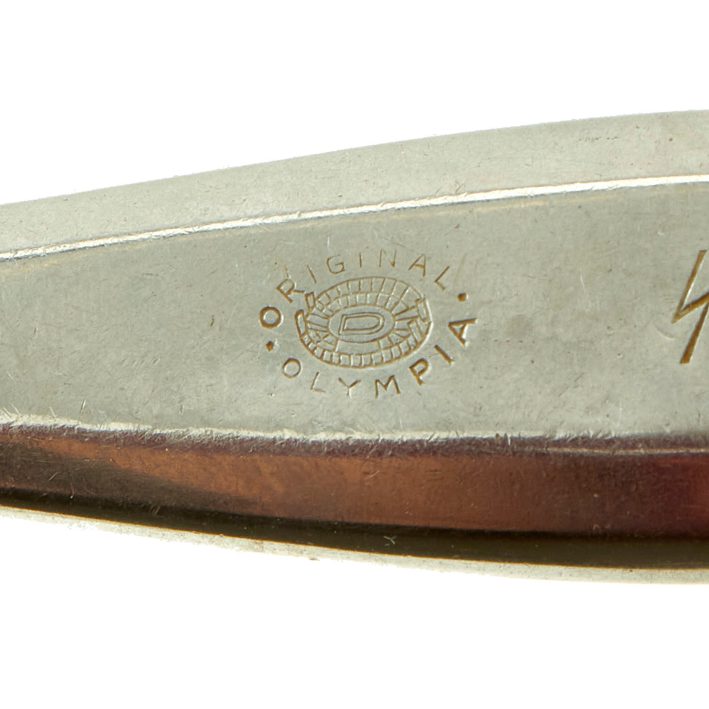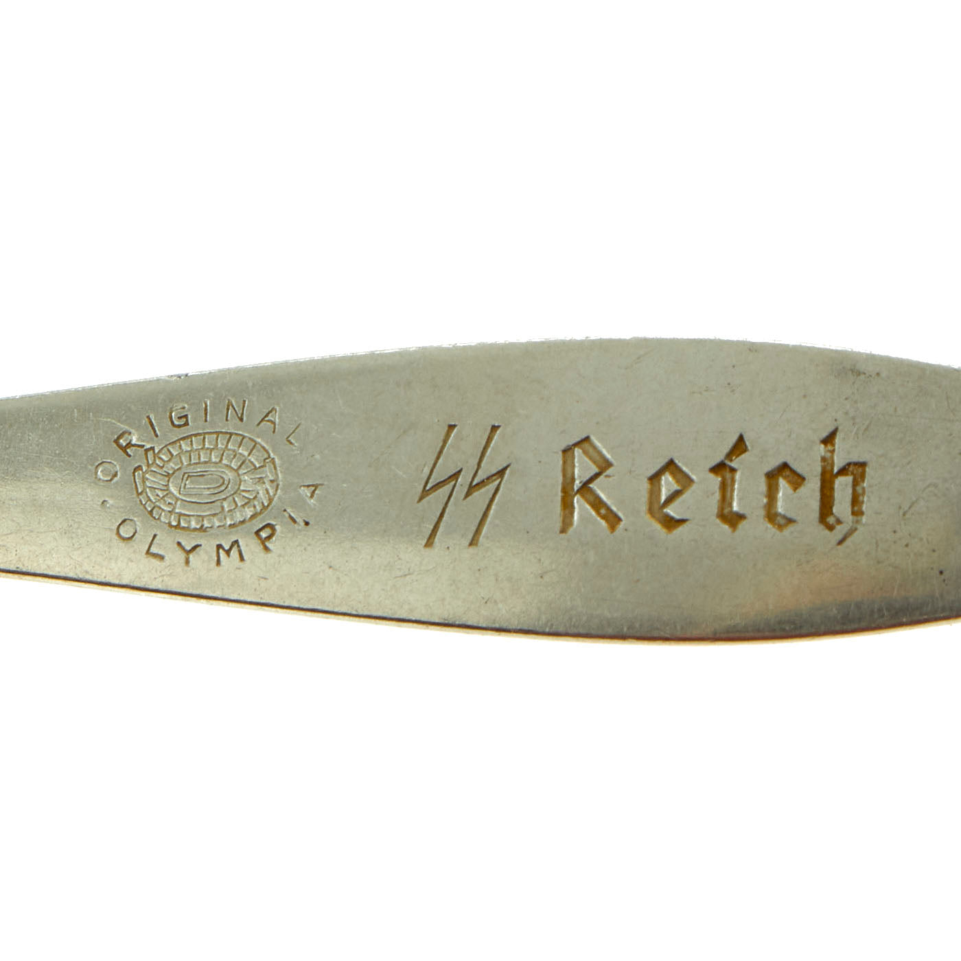 They are also marked ORIGINAL OLYMPIA, and with the ᛋᛋ doppelte Siegrune (Double Sig/Victory Rune) followed by Reich on the reverse. The obverse of the fork and spoon is unmarked, with a sleek and contemporary design along the necks and handles. "SS Reich" marked flatware would have been standard Mess hall/Dining flatware for SS Barracks, Camps and Posts.