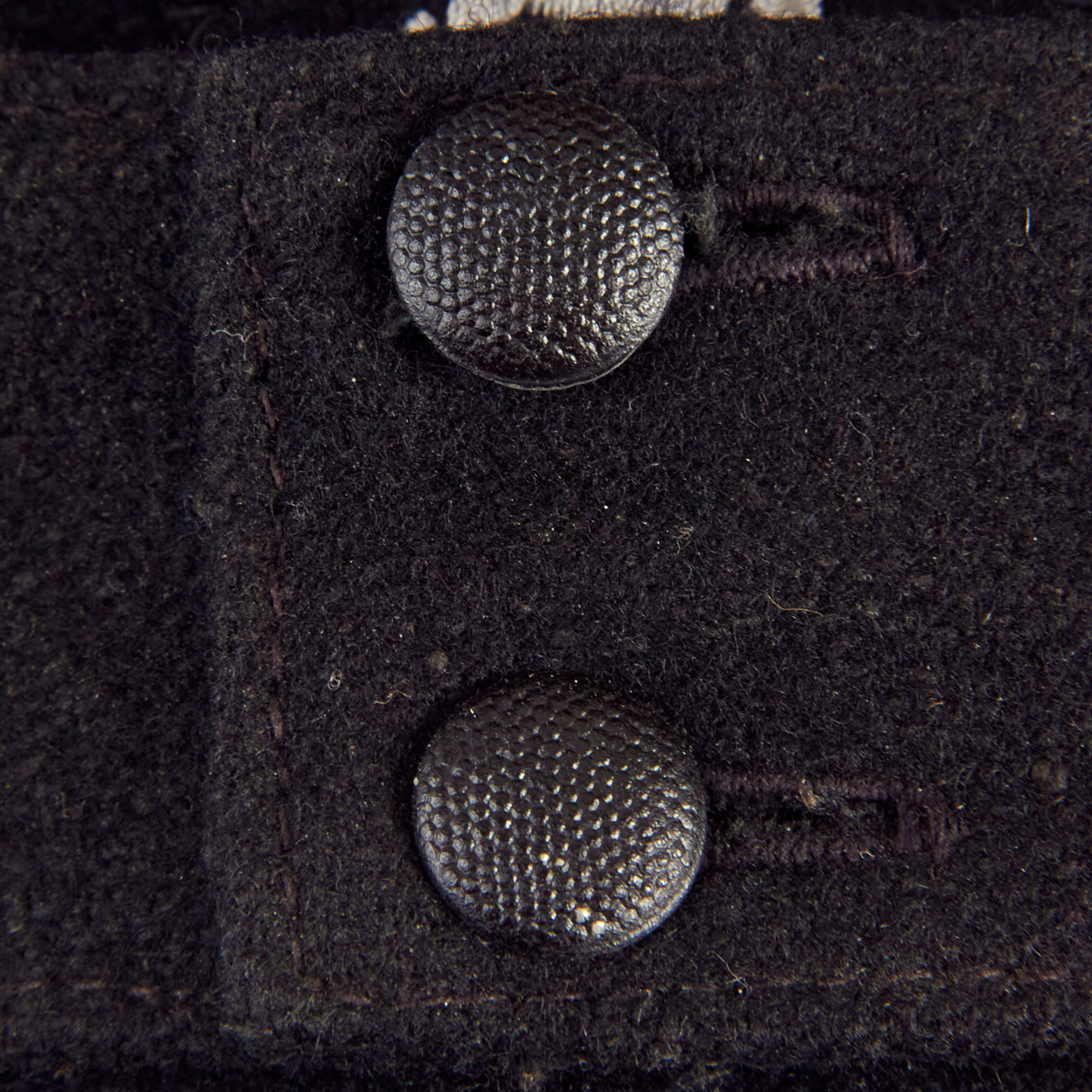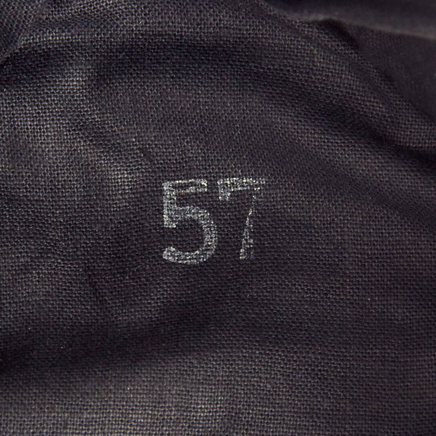 Constructed of black wool with cotton lining, with fold-down panels with squared scallops to the front and forward sides, covering the entire neck on the sides and rear when in use. When not in use, the panels are raised with their ends resting upon the visor, being joined together via two aluminum painted buttons. The visor is reinforced with cardboard, and covered in matching wool cloth.