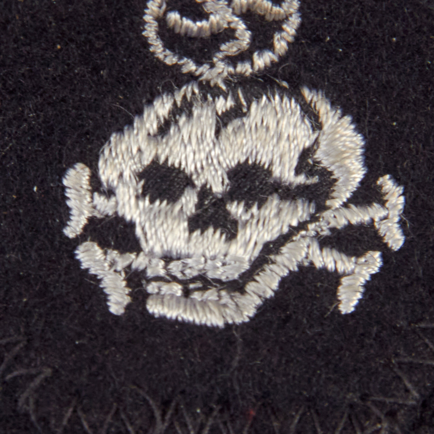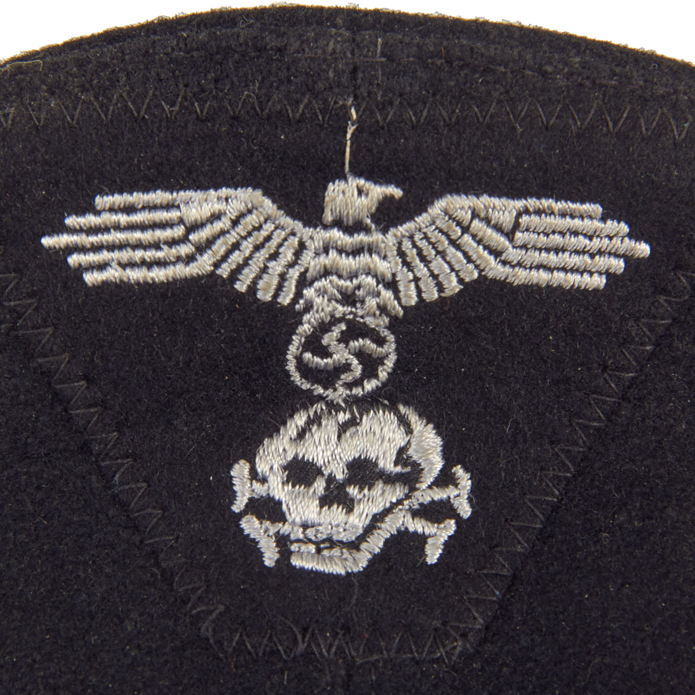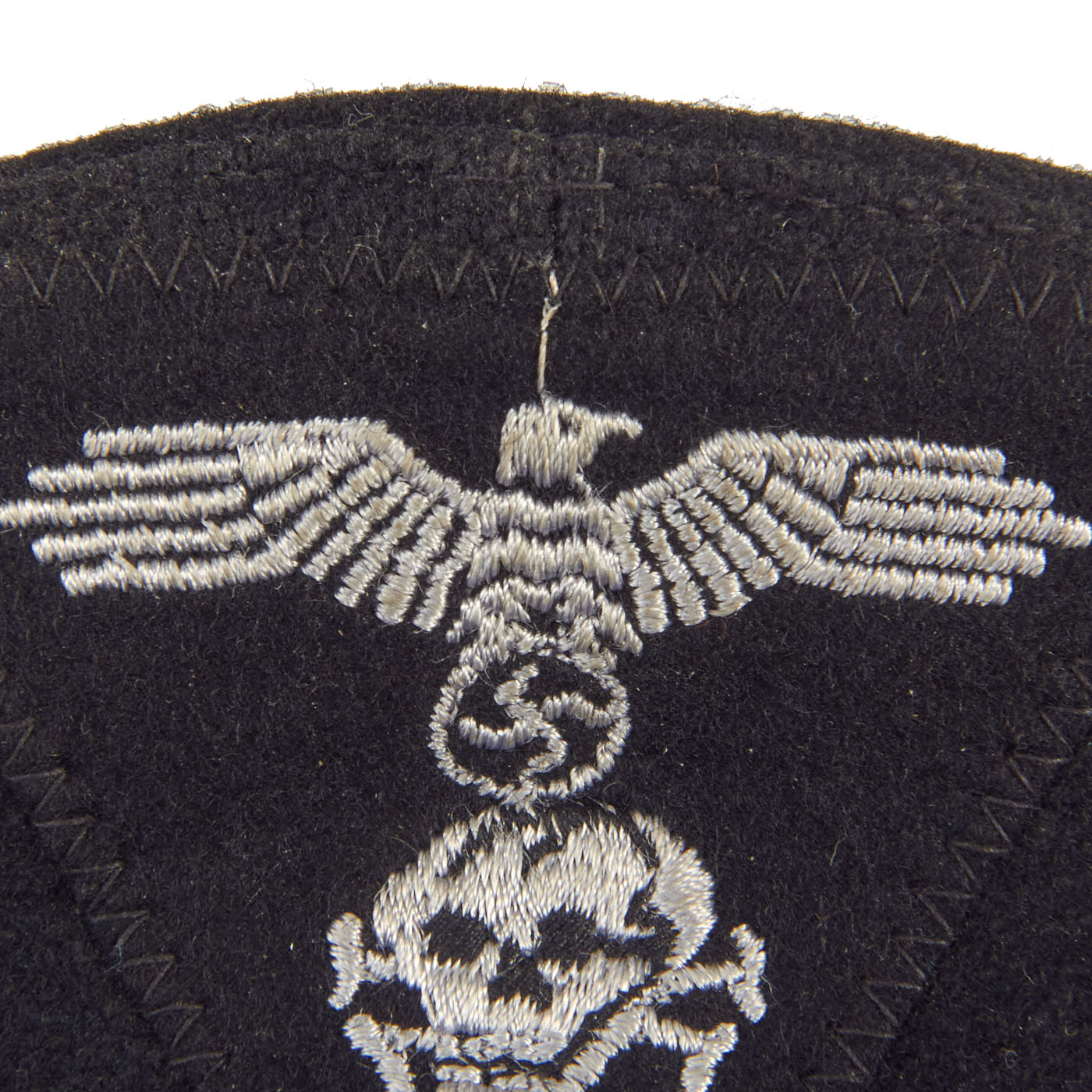 Sewn in place in the front of the cap is a standard style SS Panzer Cap Trapezoid constructed of machine woven white threading in the shape of a standard SS eagle with an SS Skull on black wool backing. It is original to the cap and is machine-sewn to the outside fabric with the telltale German zig-zag stitch as seen on other German WWII garments.