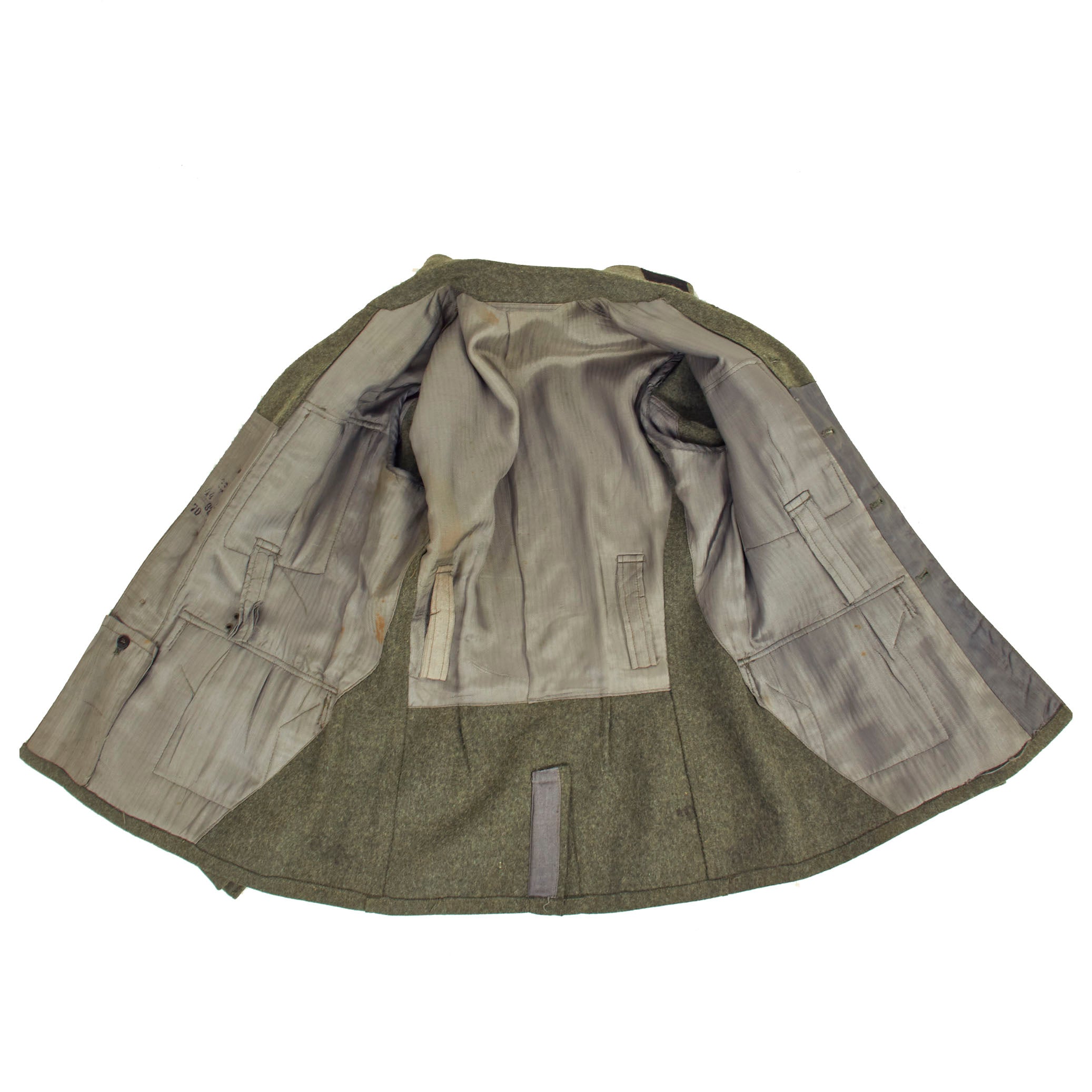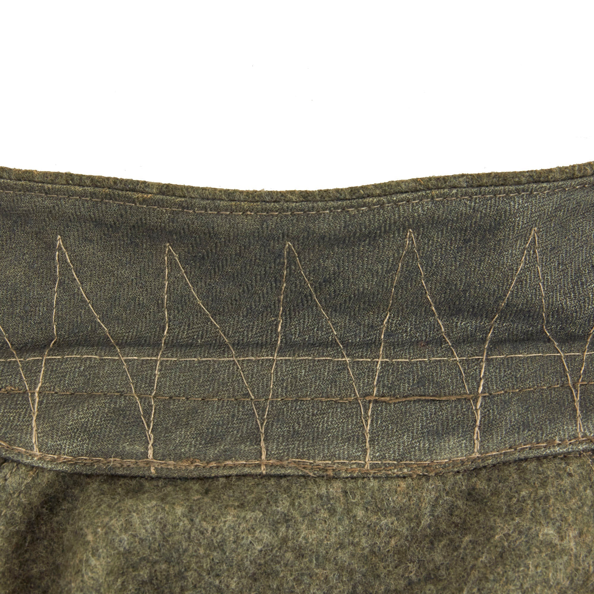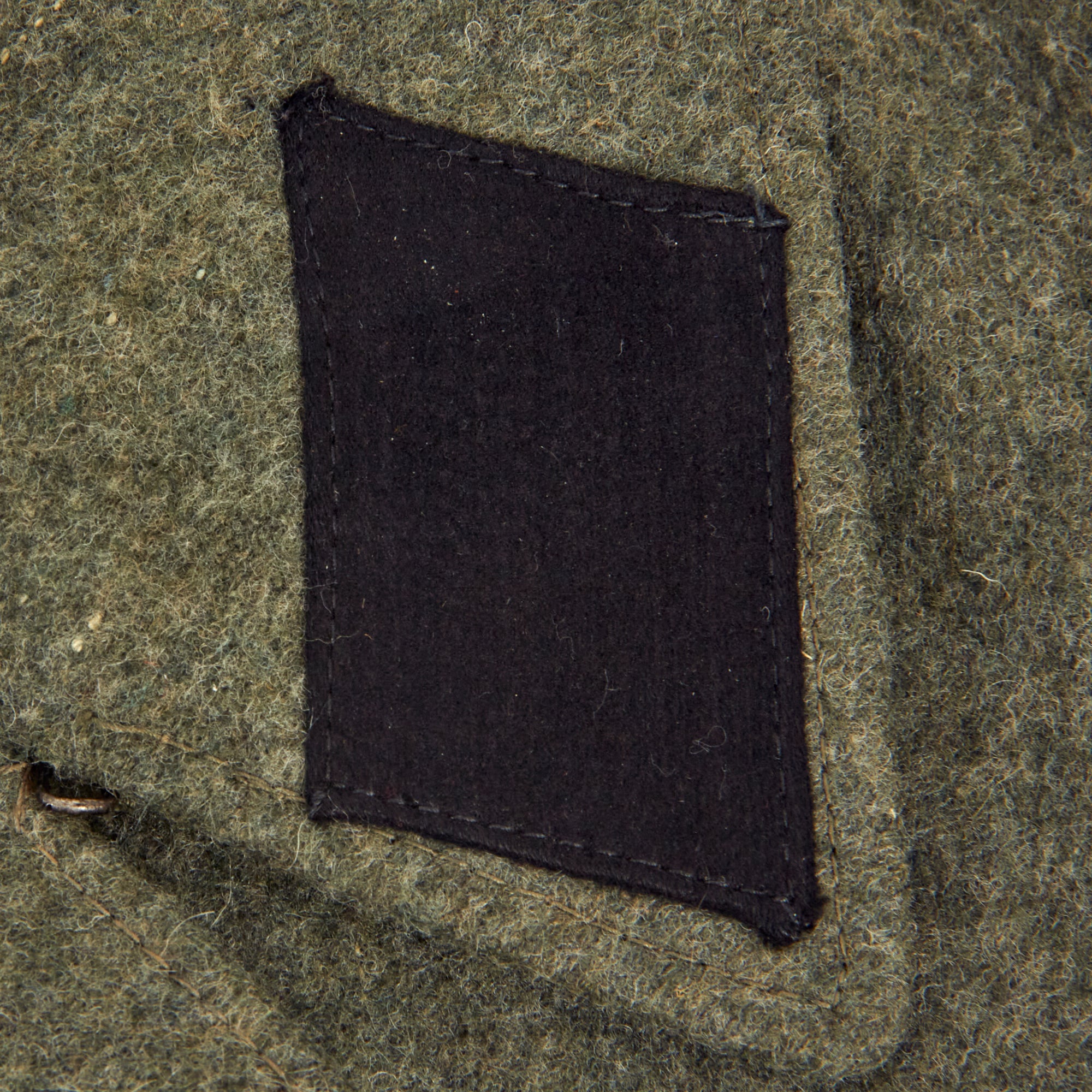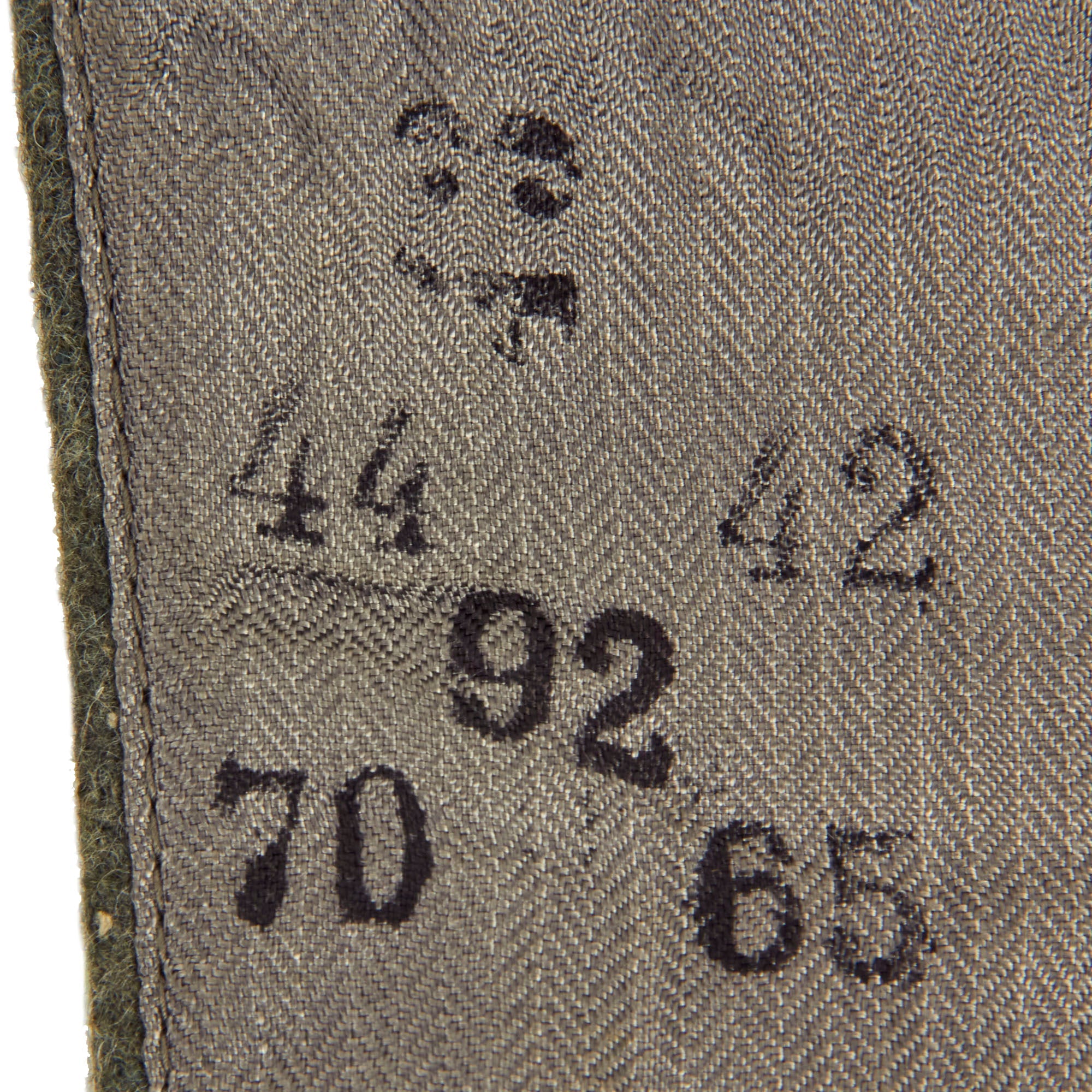 The tunic is of the classic Waffen-SS style, with a 5 button front. Constructed of Italian Wool and Italian Rayon Herringbone Pattern lining, as a number of uniforms were made at the SS Clothing Manufactory at Dachau. Following the Italian armistice on September 3, 1943, the Germans helped themselves by seizing massive quantities of Italian Military Equipment and Raw Materials. The SS was quick to dispatch the materials to their clothing manufacturing center located at Dachau, where the newly acquired Italian materials were implemented in the manufacture of issue Waffen-SS uniform items.