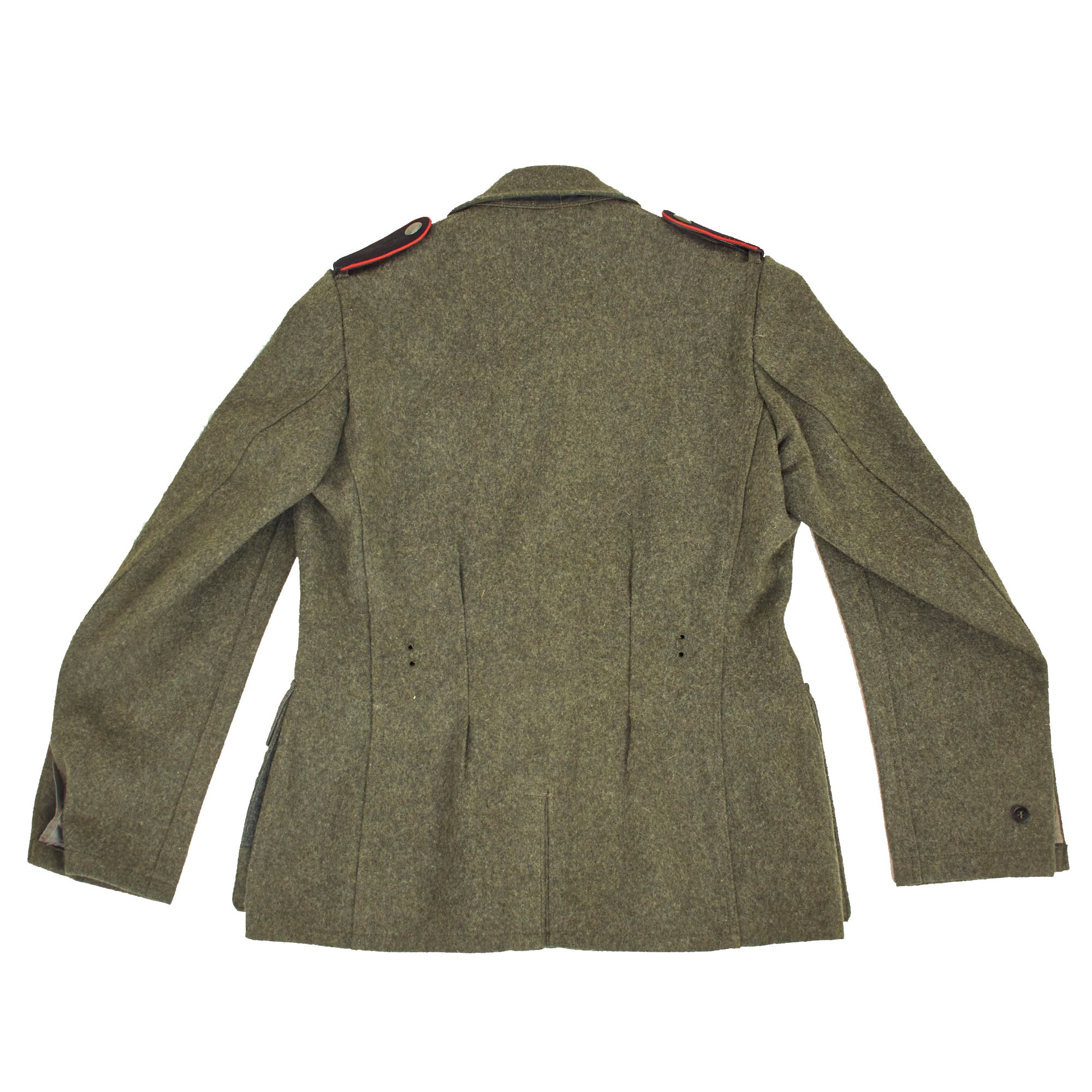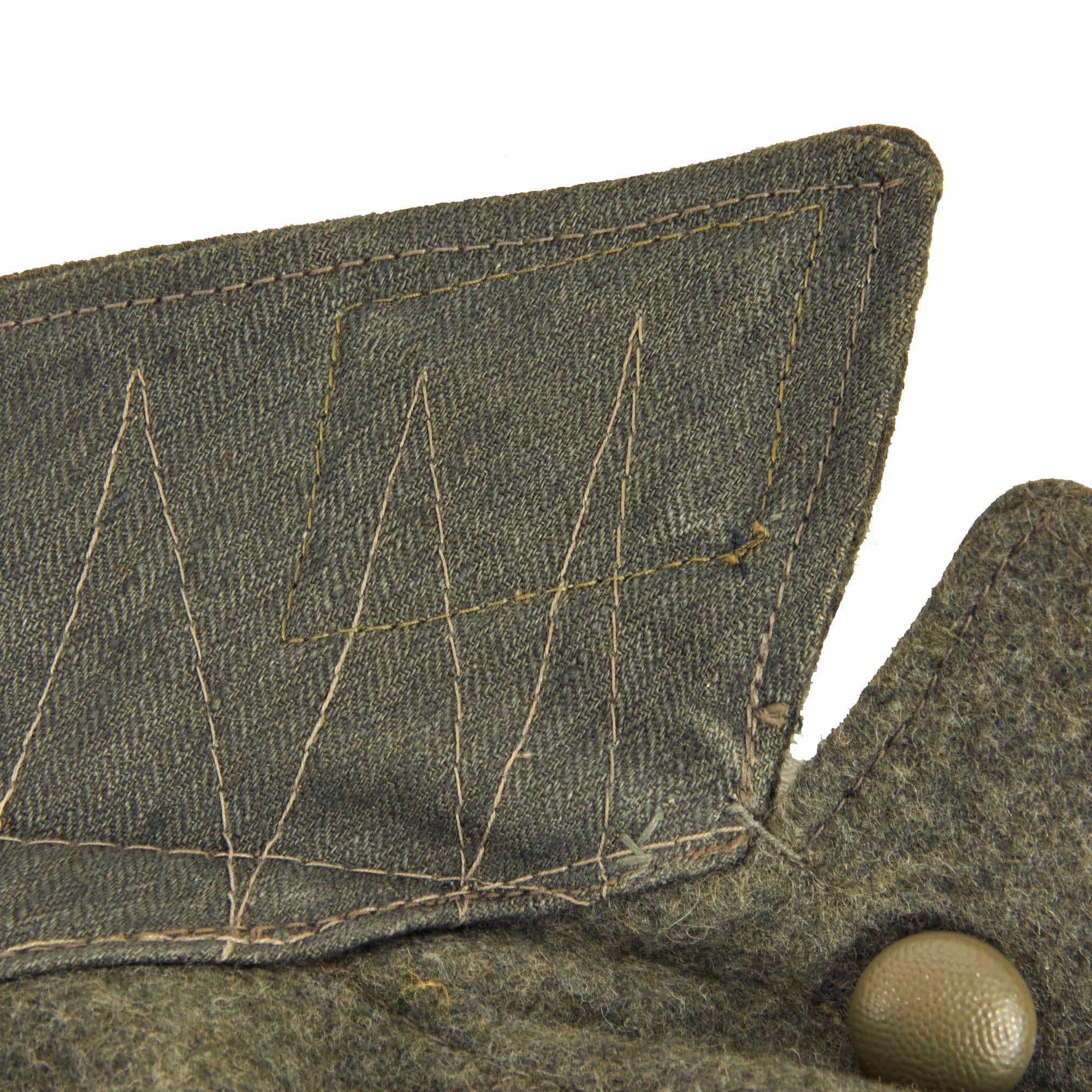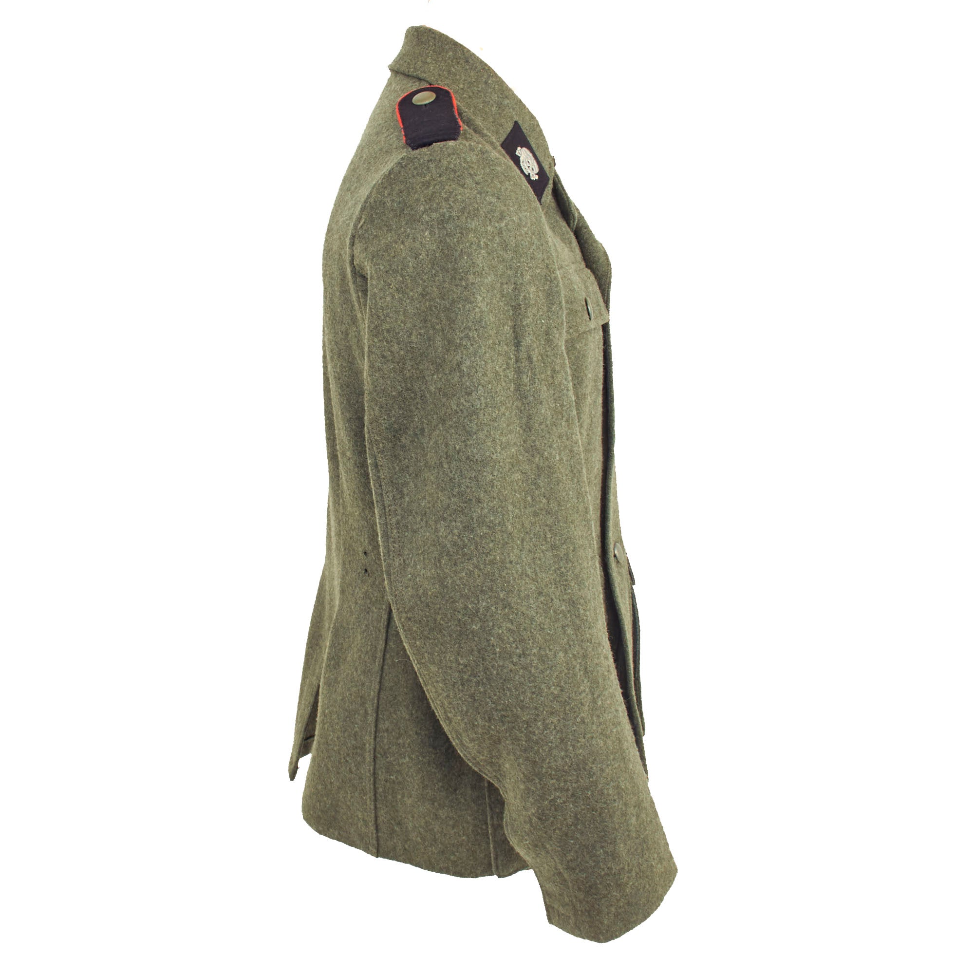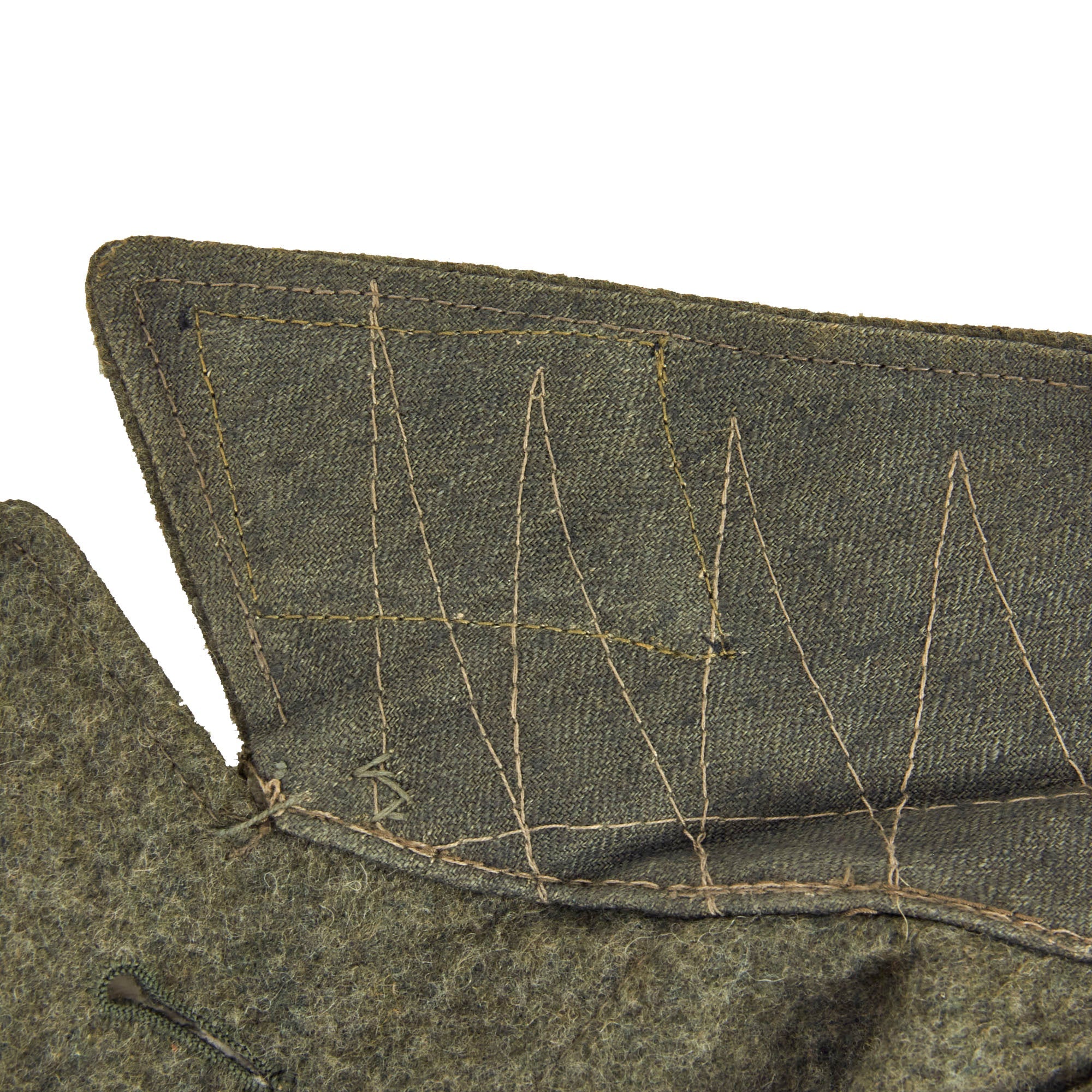 The tunic is of the classic Waffen-SS style, with a 5 button front. Constructed of Italian Wool and Italian Rayon Herringbone Pattern lining, as a number of uniforms were made at the SS Clothing Manufactory at Dachau. Following the Italian armistice on September 3, 1943, the Germans helped themselves by seizing massive quantities of Italian Military Equipment and Raw Materials. The SS was quick to dispatch the materials to their clothing manufacturing center located at Dachau, where the newly acquired Italian materials were implemented in the manufacture of issue Waffen-SS uniform items.