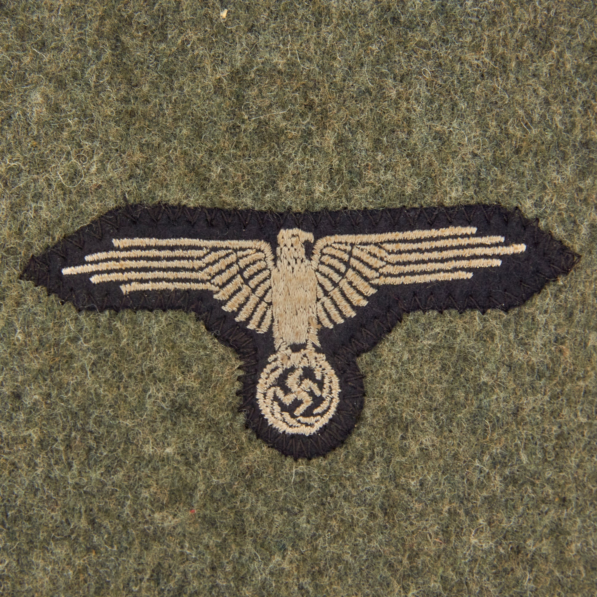 The tunic features all original insignia, which was period applied. The SS Sleeve Eagle is of one of the most desirable types made at Dachau, that being the variant which was most used on the incredibly rare SS Fallschimjager Jump Smocks that were made in “Dot-44” Camouflage material. It should be noted that the eagle is sewn to the tunic in the correct “zig-zag” stitching pattern. There are no signs that any other insignia was ever applied to the uniform.