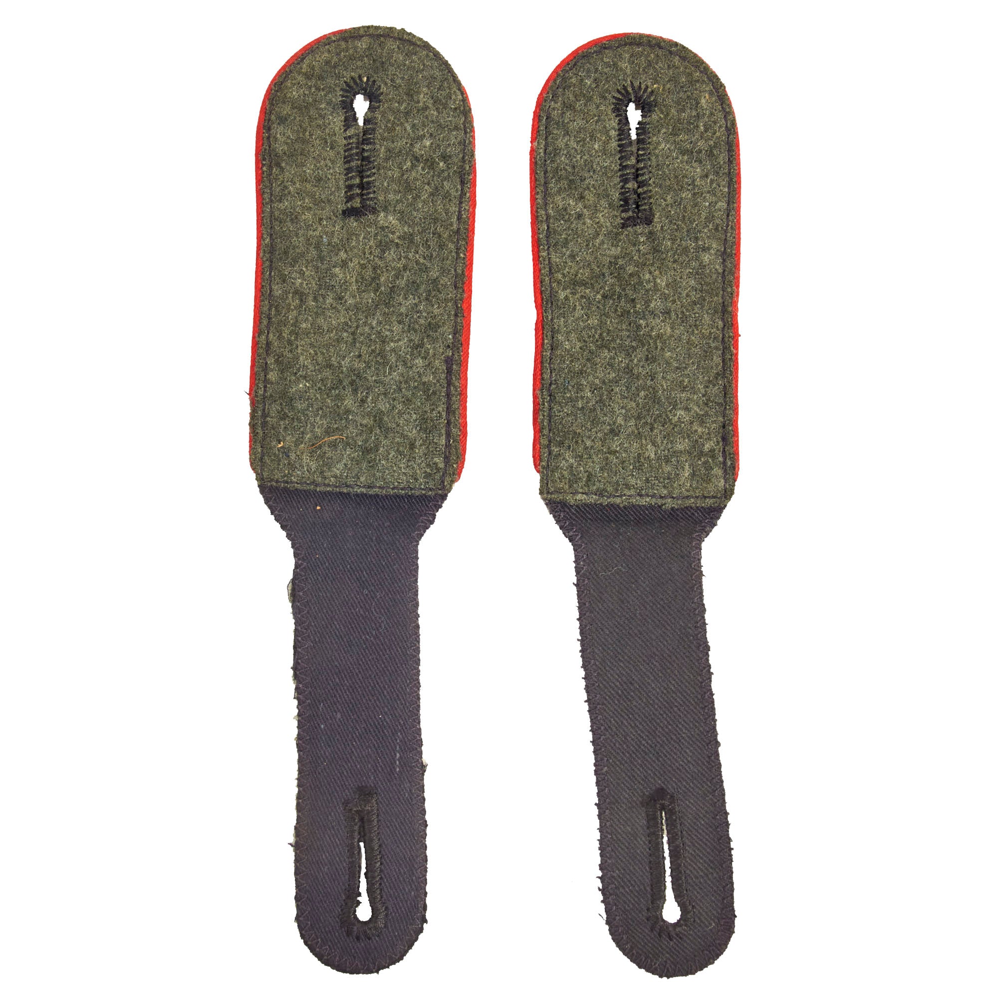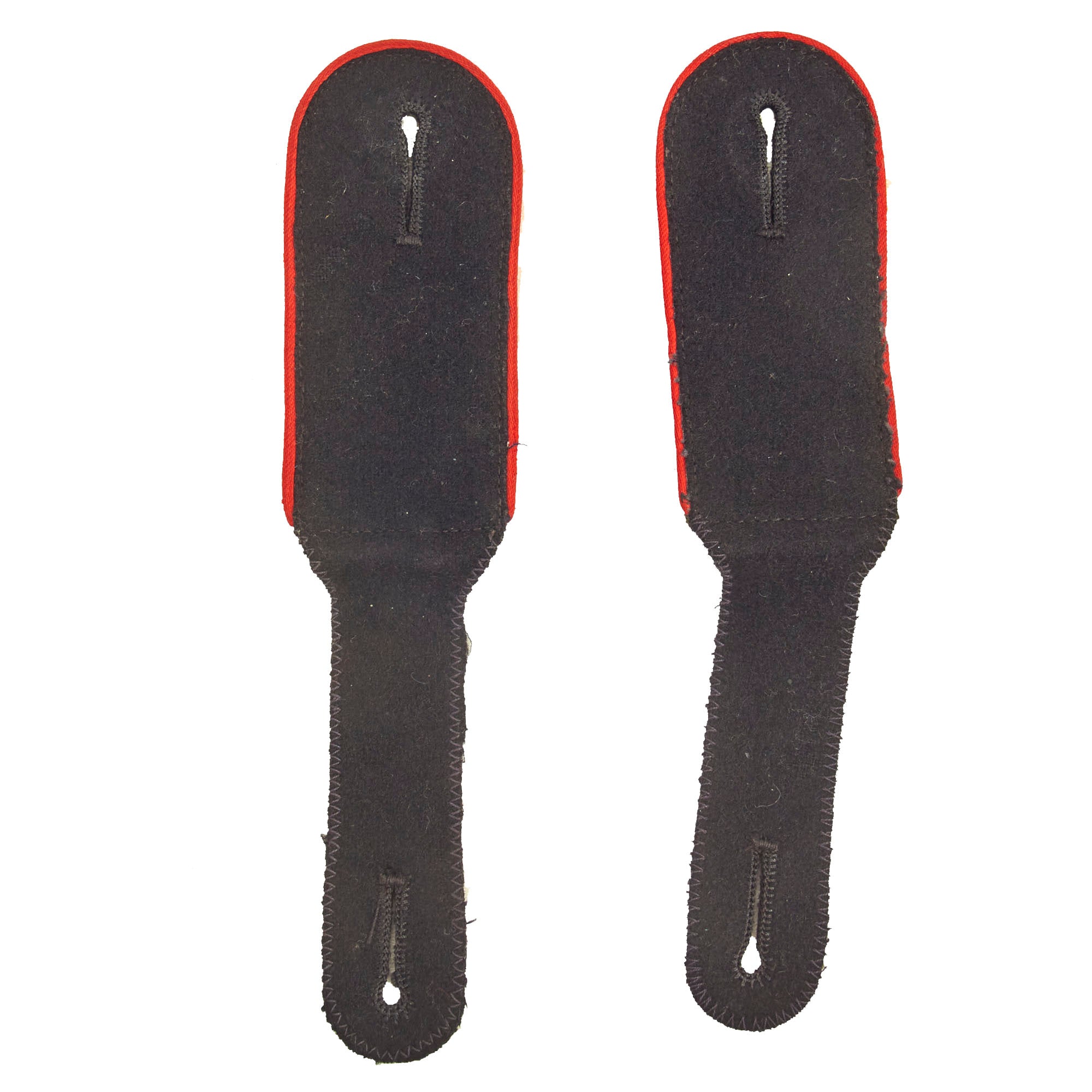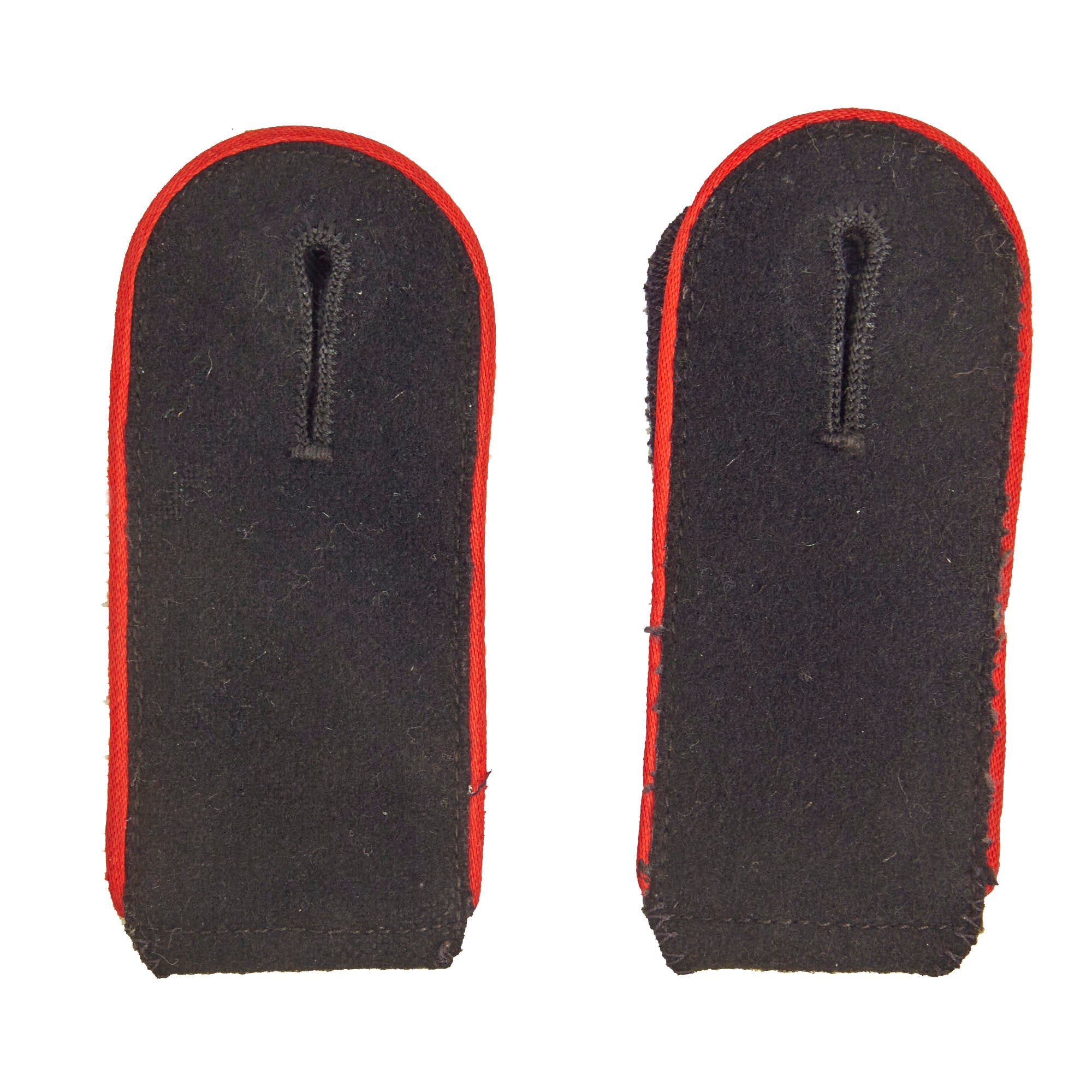 The collar is adorned with the correct Kraggenpatten (collar insignia), with an embroidered Totenkopf "Death's Head" skull on the right side, and a blank patch on the left. The enlisted schulterklappen (shoulder straps) are black with Hochrot (deep red / scarlet) piping, the Waffenfarbe (corps color) in the Waffen-SS for Artillery. The lack of devices on the left collar tab with the shoulder straps indicates the lowest SS rank of SS-Schütze, equivalent to a U.S. Army private.