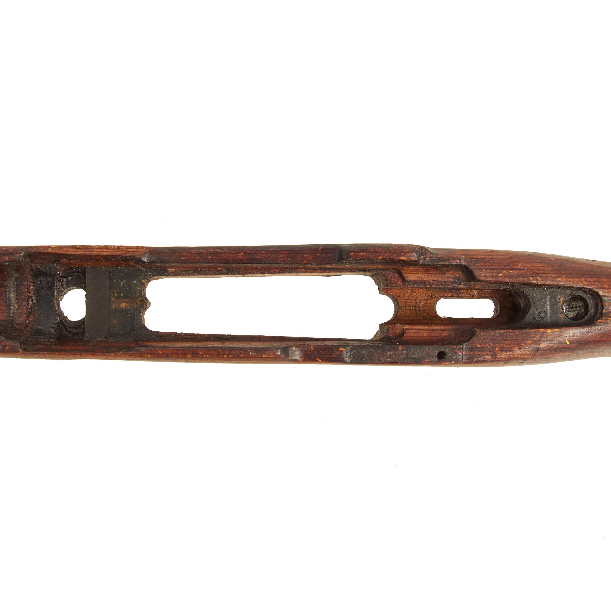 These stock sets are the type produced from 1937 to 1940 during the pre-war and early war period, with laminated wood and flat butt plates. Each has a complete lower stock and handguard, as well as a nose cap / bayonet fitting, receiver strengthening bolt, and butt plate. They also feature the smaller 25mm holt through the butt stock for a fitting that aided in bolt disassembly in the field during cleaning. Please note that the bolt disassembly fittings have been removed from these examples.