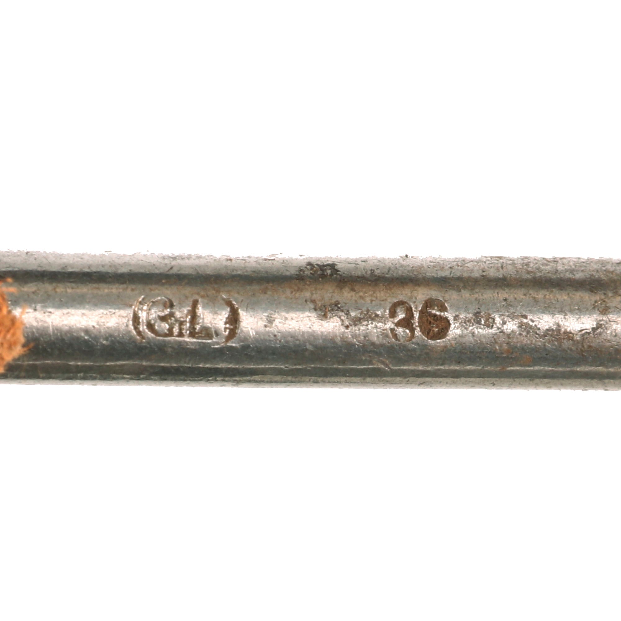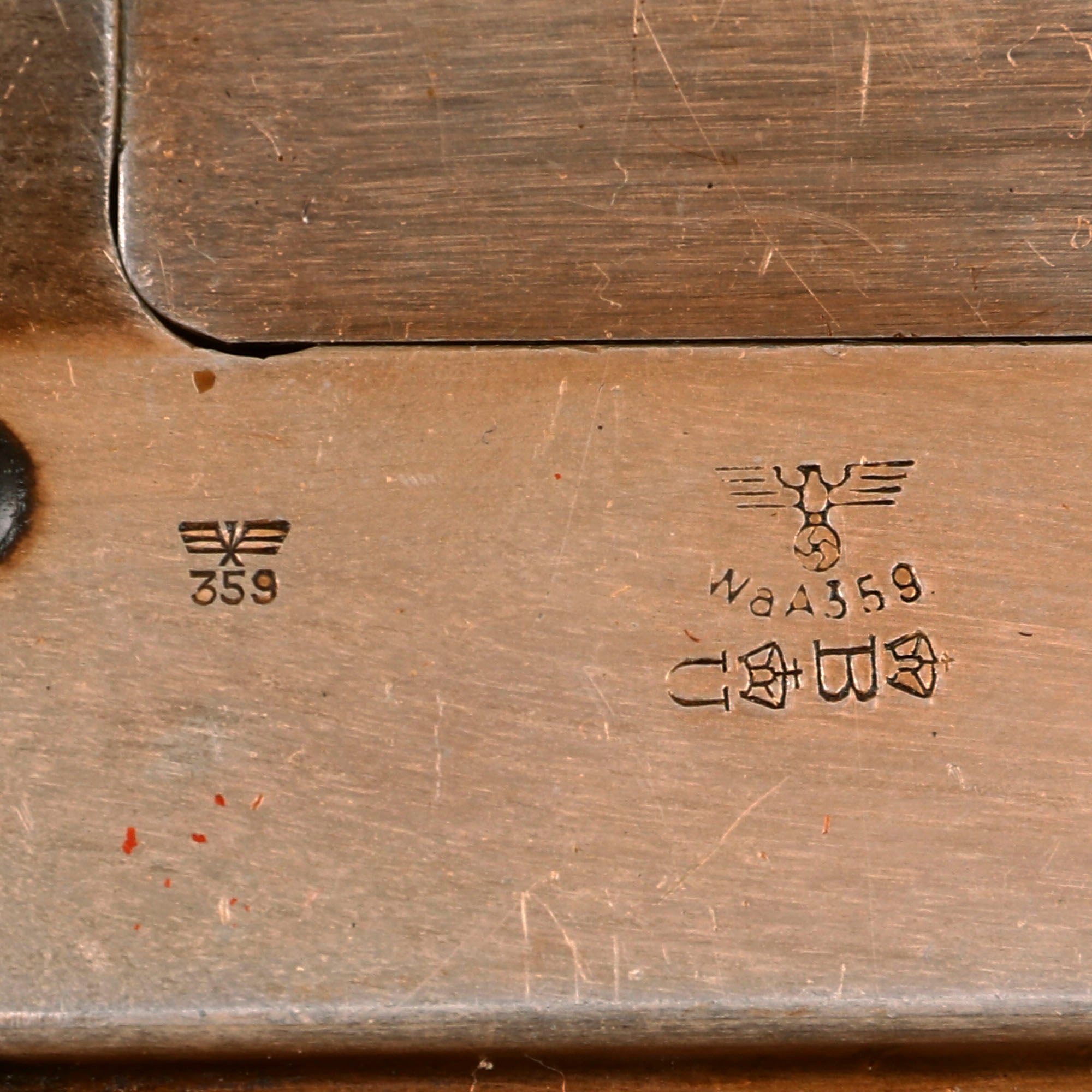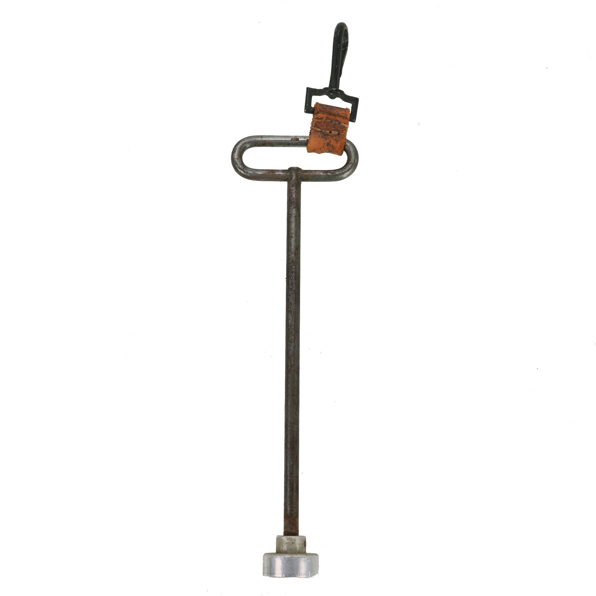 The included cleaning rod has a steel handle, and aluminum end rammer. It has an early "stick eagle" Waffenamt WaA300 stamped into the top of the handle, and it is also marked (G.L.) 38 on the other side, probably a maker marking and date. It also has a spring clip attached to the handle with a small leather strap, something we rarely see, that enables the cleaning rod to be attached elsewhere if needed.
