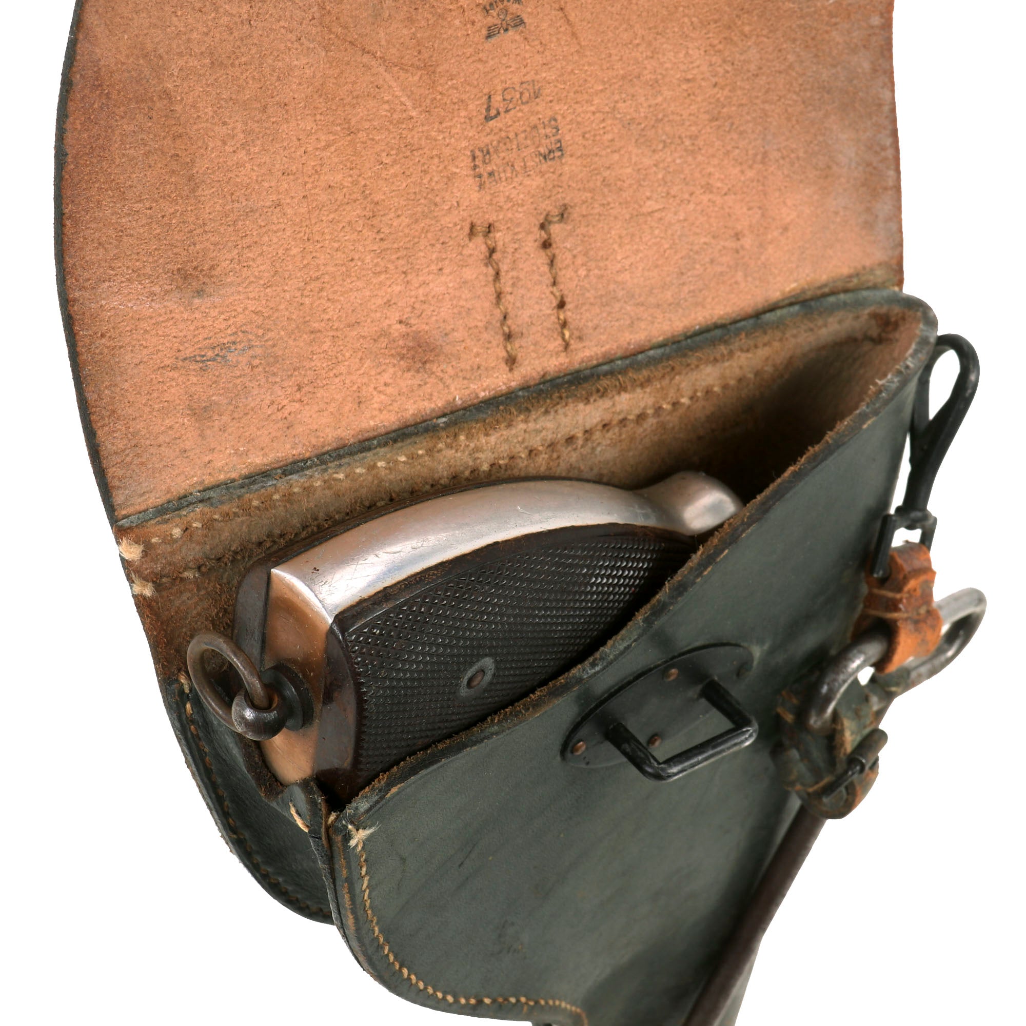 The included holster is the standard heavy black soft shell holster used throughout the war. It is in very good condition, just like the flare pistol, and appears to have seen a good amount of service, though not an excessive amount. The black finish is in very good condition, though there is cracking and wear, particularly to the securing straps for the lid and cleaning rod. It is maker marked under the flap by ERNST KURZ / STUTTGART, and is dated 1937 under this. It has Waffenamt (Eagle) / WaA101 stamped under this, for an inspector that inspected holsters in the Stuttgart area. The holster still has both belt loops as well as the D-rings on the back for the shoulder strap, however no strap is included.