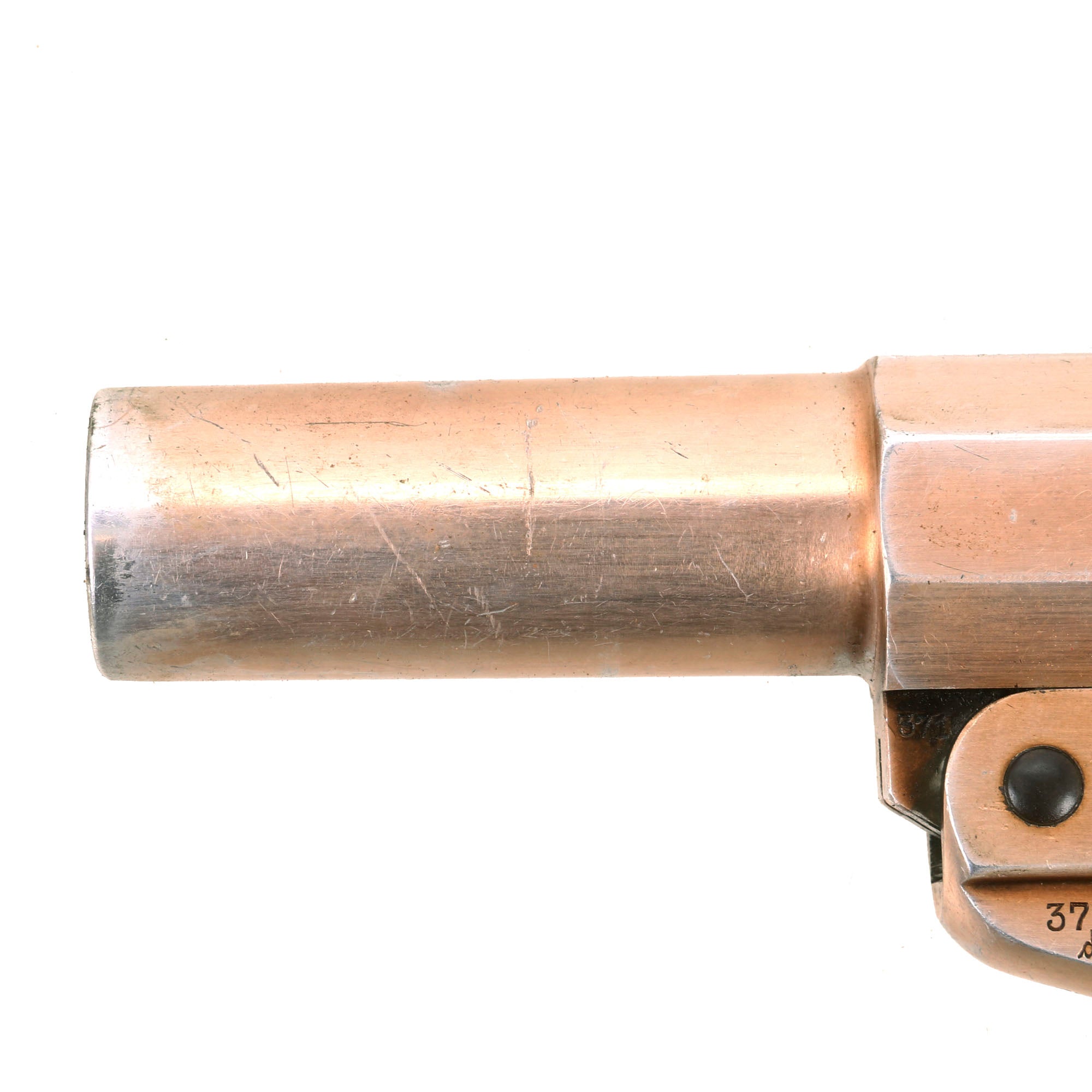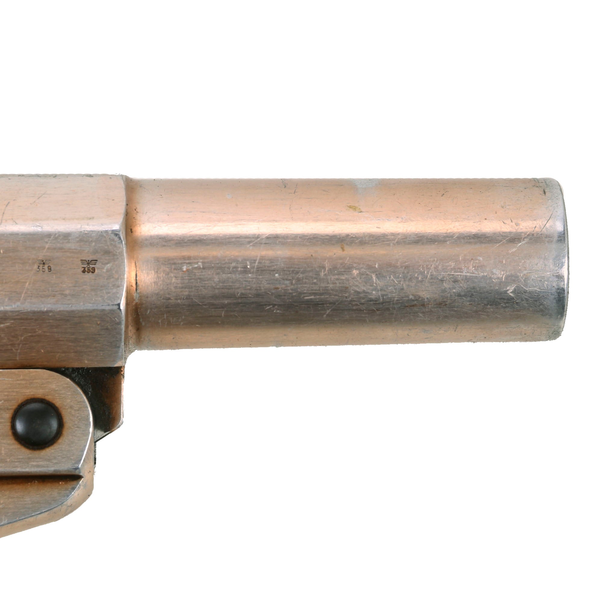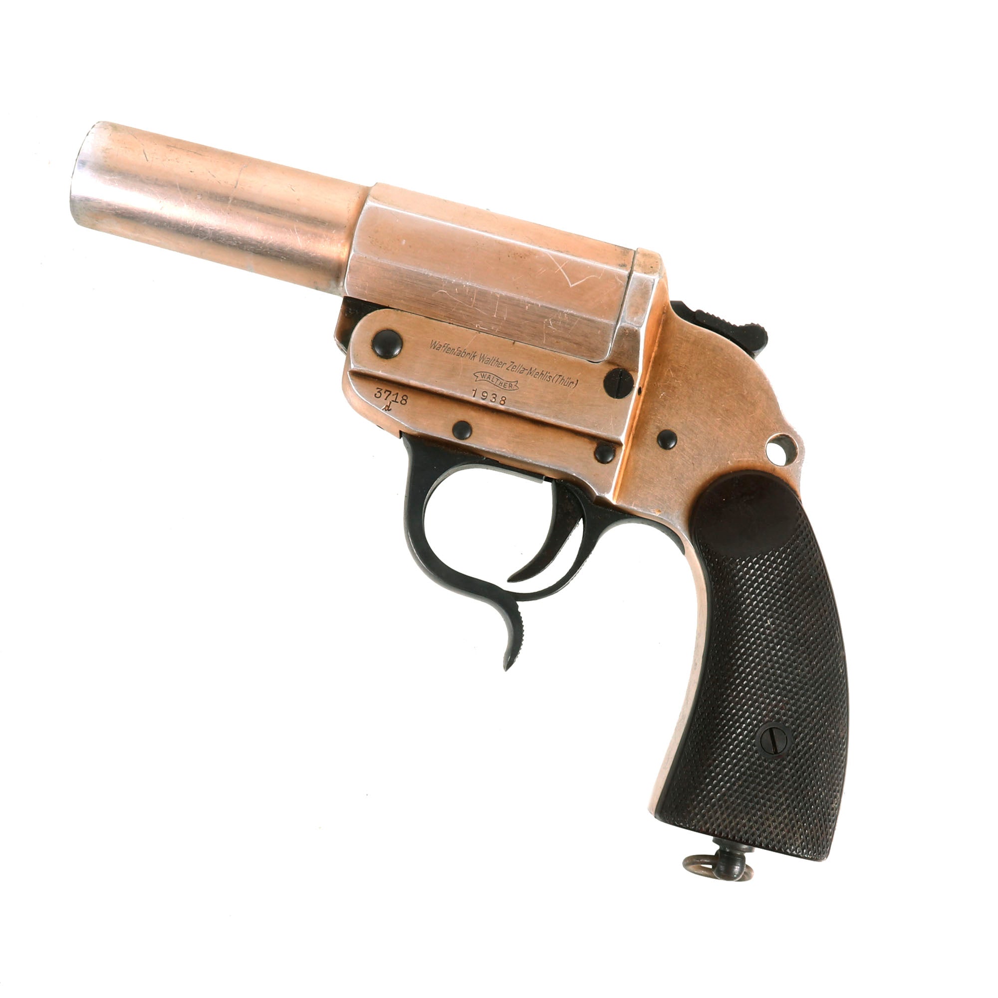 This example bears original maker mark Waffenfabrik Walther, Zella-Mehlis (Thür) over the famous WALTHER banner and 1938 date. This company, based in the Thüringen (Thuringia) region of Germany, needs no introduction. They developed this design of flare pistol, making several versions of it. They also designed numerous famous pistols, including the PP/PPK line, and the P-38 9mm pistol that replaced the P-08 Luger. The company still exists to this day.
