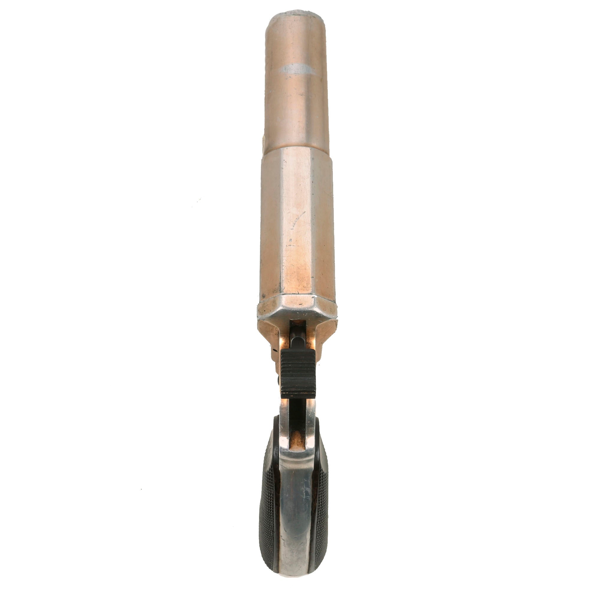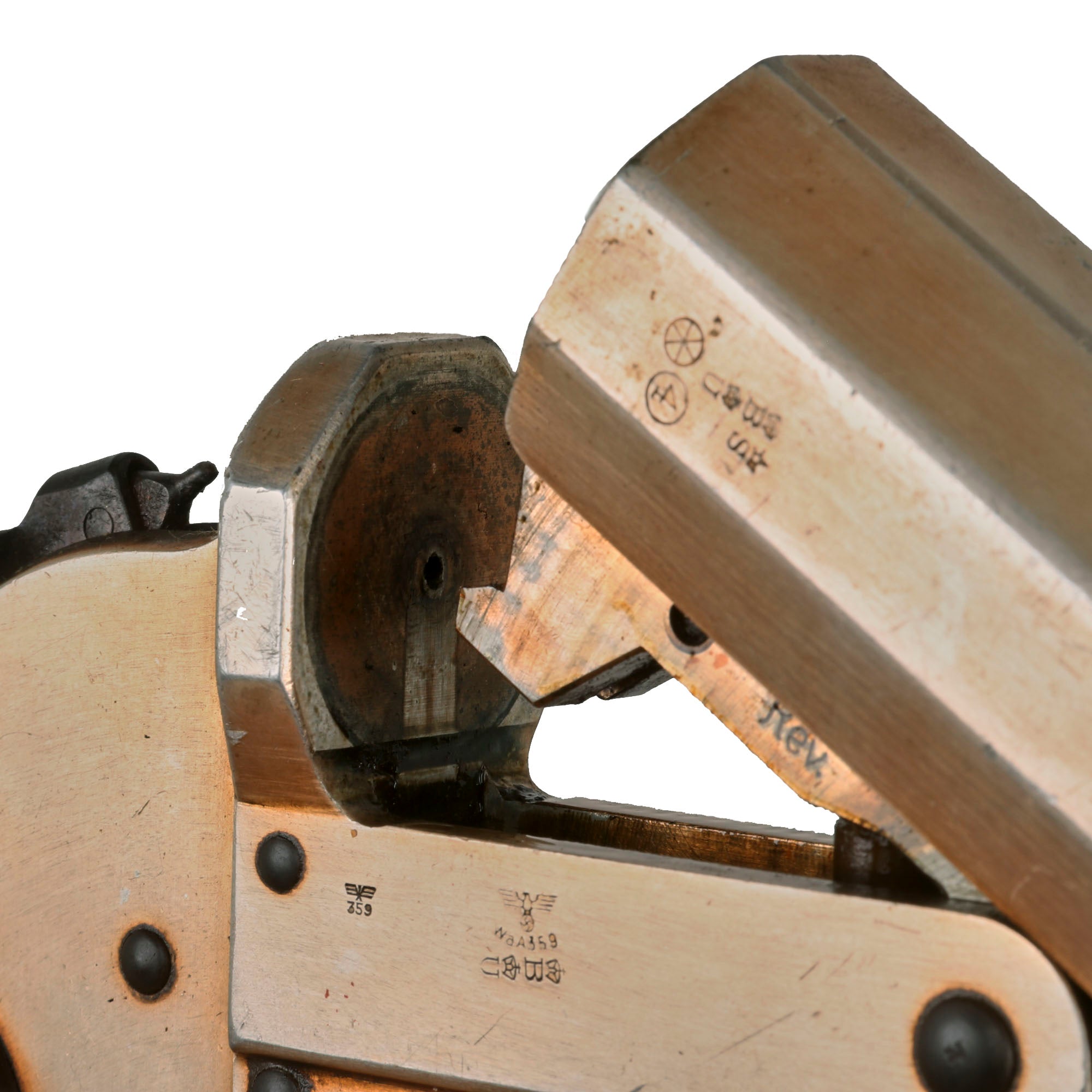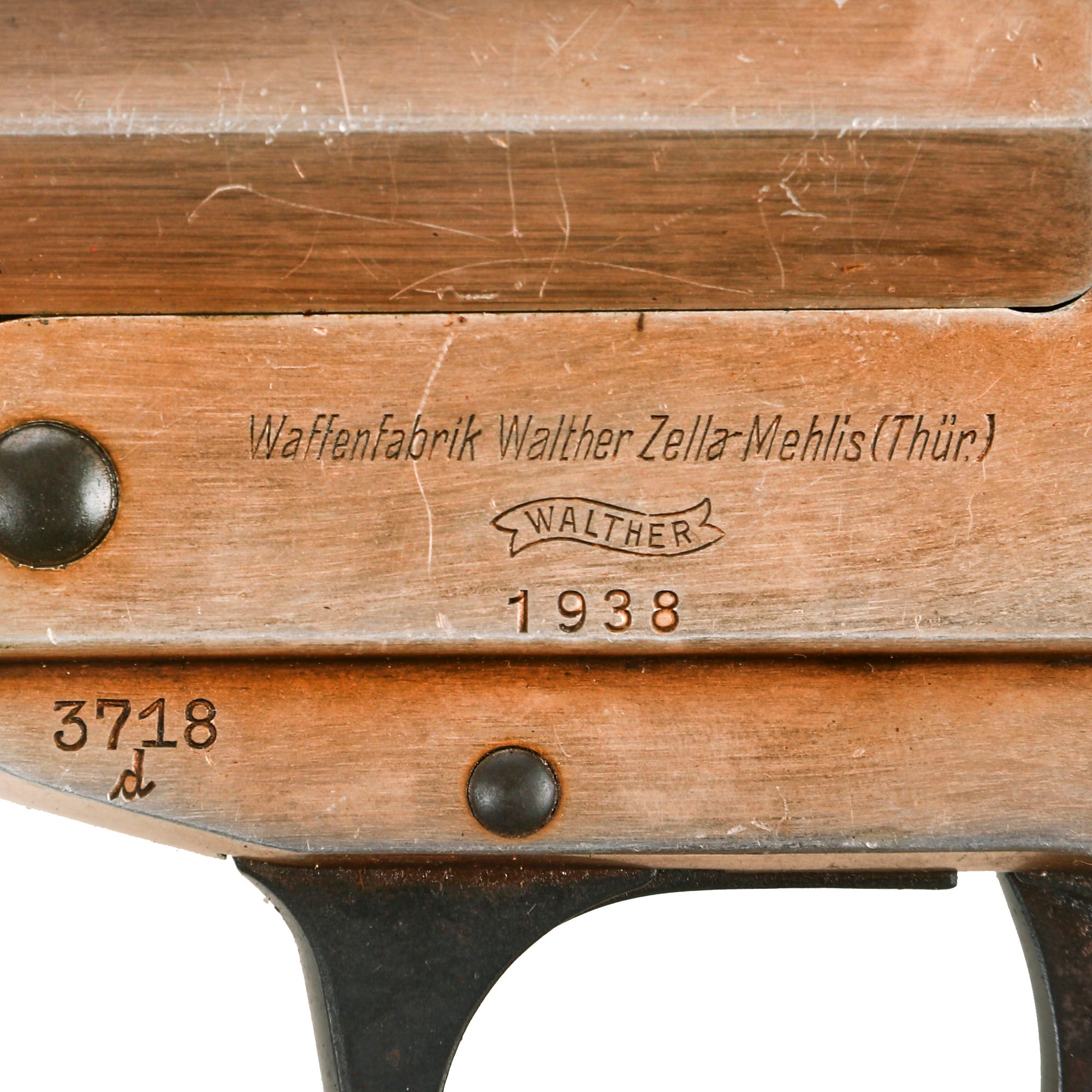 This example bears original maker mark Waffenfabrik Walther, Zella-Mehlis (Thür) over the famous WALTHER banner and 1938 date. This company, based in the Thüringen (Thuringia) region of Germany, needs no introduction. They developed this design of flare pistol, making several versions of it. They also designed numerous famous pistols, including the PP/PPK line, and the P-38 9mm pistol that replaced the P-08 Luger. The company still exists to this day.