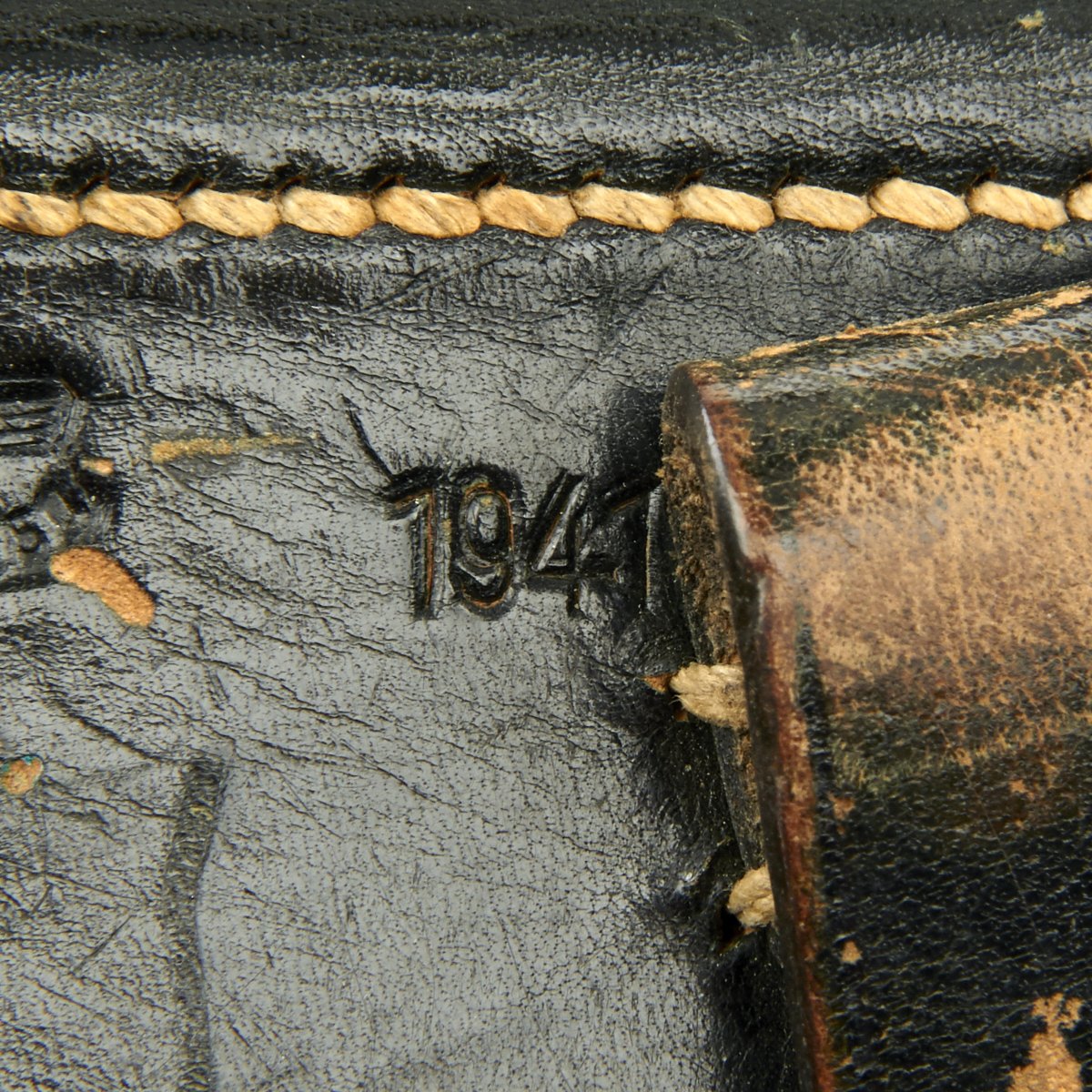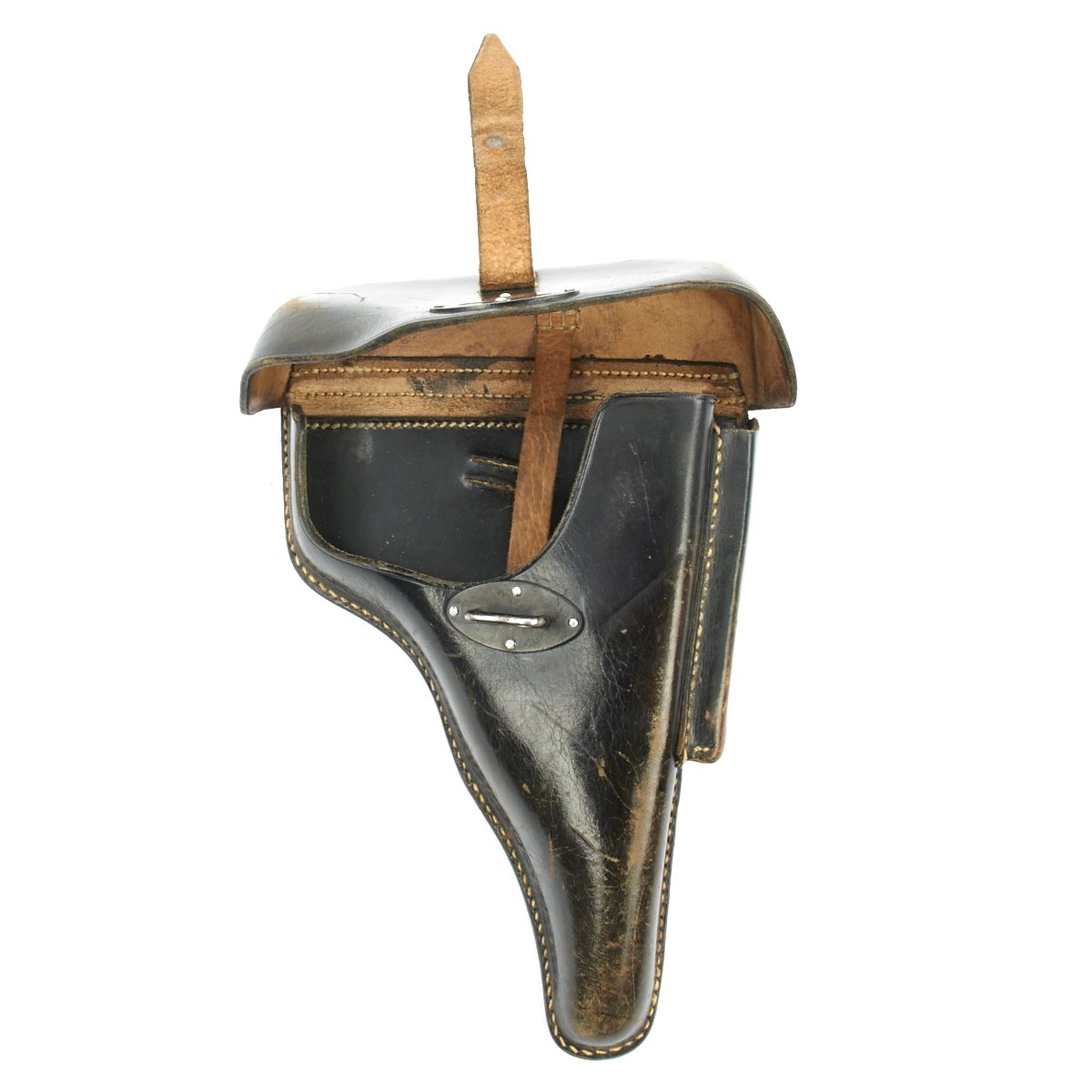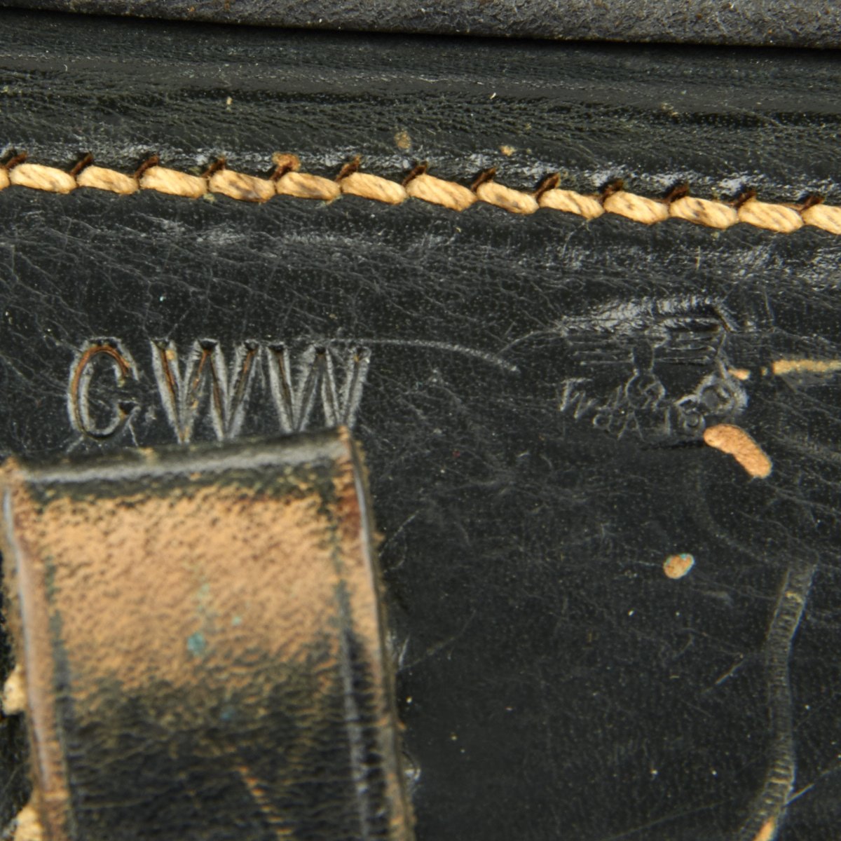 Original Item: Only One Available. Just purchased from a private collector, this is a very nice WWII issue Black Hardshell holster for the standard issue Walther P38 pistol, complete with all the correct period markings. The back of the holster is marked P38 on the upper right hand corner, and has the date 1941 next to the right side belt loop. Between the belt loops is a German military style Waffenamt marking with WaA150 under a military NSDAP Eagle. Over the left belt loop is the German three-letter code CWW, for Carl Weiss of Braunschweig, a maker of leather holsters and cases for optics and other equipment.