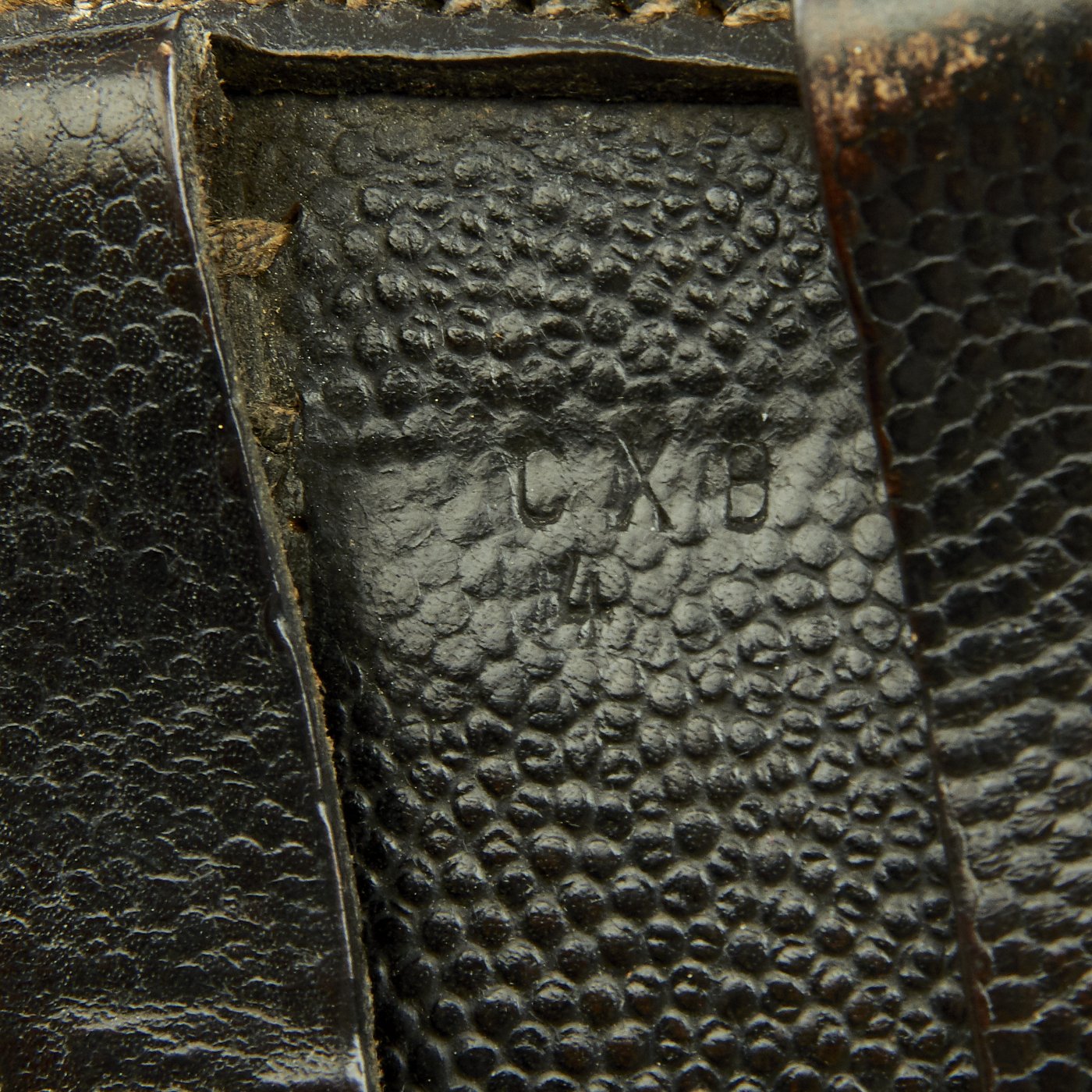Original Item: Only One Available. Recently purchased at an estate sale, this is a very nice condition WWII production black pebble grain finished leather holster for the standard issue Walther P-38 pistol in 9mm. It is nicely marked CXB, indicating manufacture by Moll Lederwarenfabrik (Leather wares factory) in Goch, Rheinland, Germany. This was a known maker of holsters and other leather items during the war. Under this marking is a number 4, which could mean 1944 manufacturer, due to rushed production.