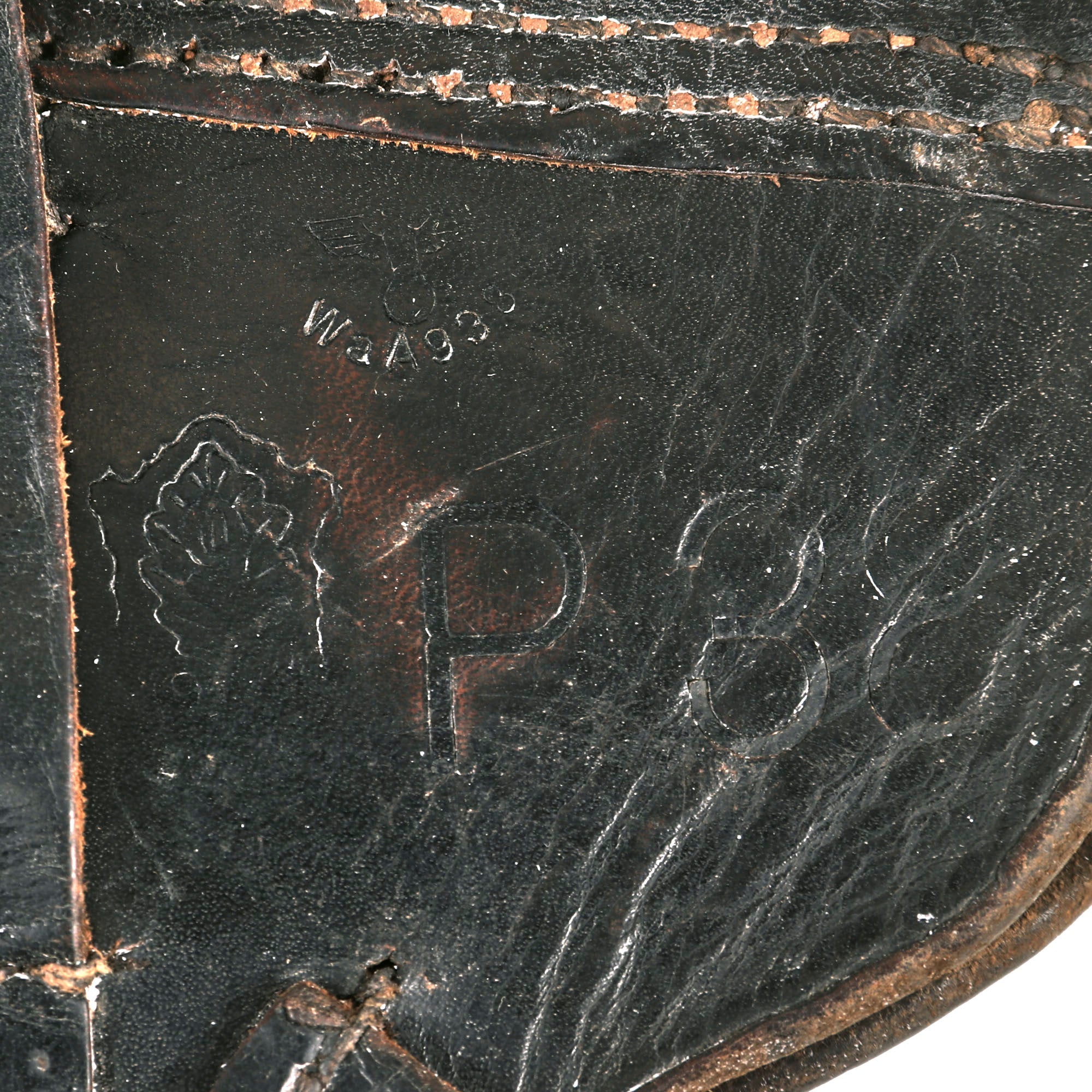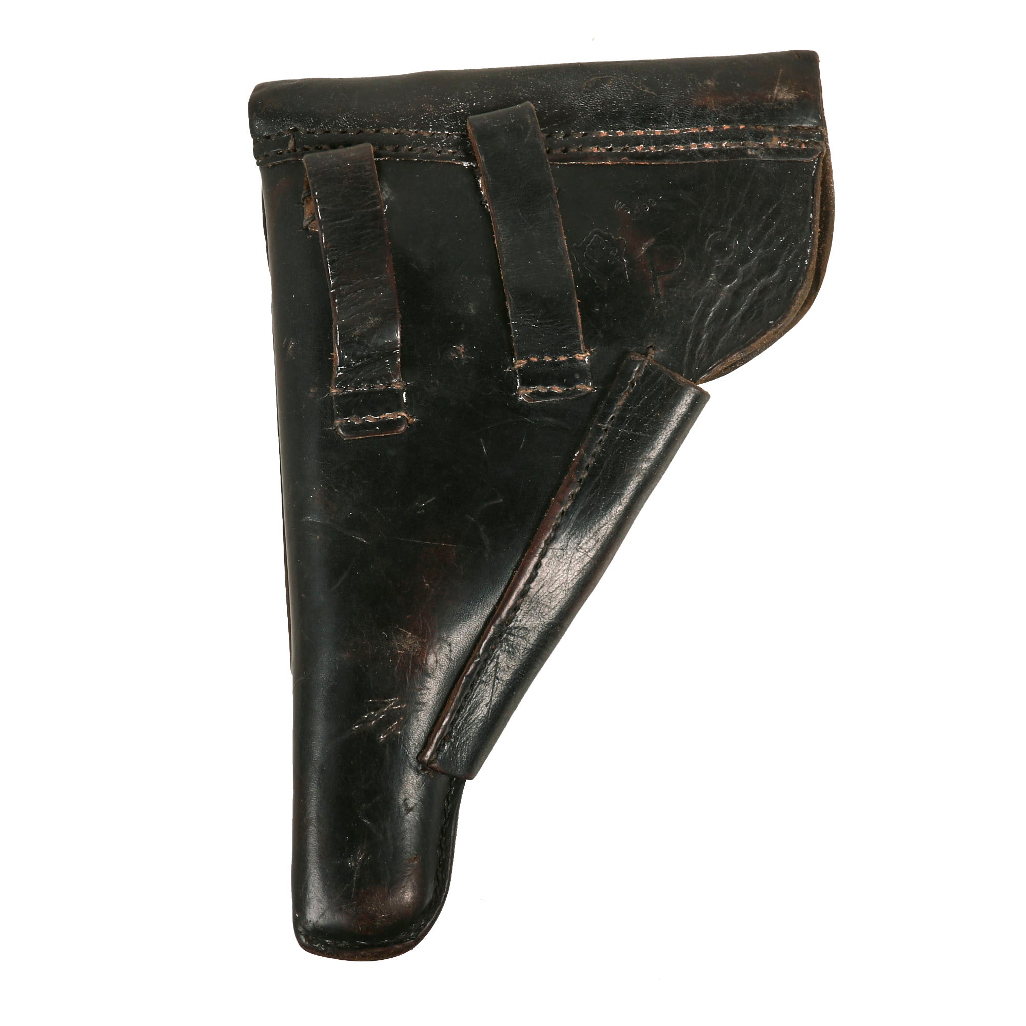 Original Item: Only One Available. Recently purchased at a military show, this is an excellent lightly used condition WWII production black finished leather holster for the standard issue Walther P-38 pistol in 9mm. This example has the desirable "Bearskin with an Oakleaf and #9 on top" marking, which has never been officially attributed to any maker. It is found on a variety of holsters made during the war, all of excellent quality. Some relatively recent detective work has attributed these holsters to being made by Lederfabrik Christof Neuner of Klagenfurt, Austria. "Neun" is the German word for Nine, and it makes sense that the trademark would be for them.