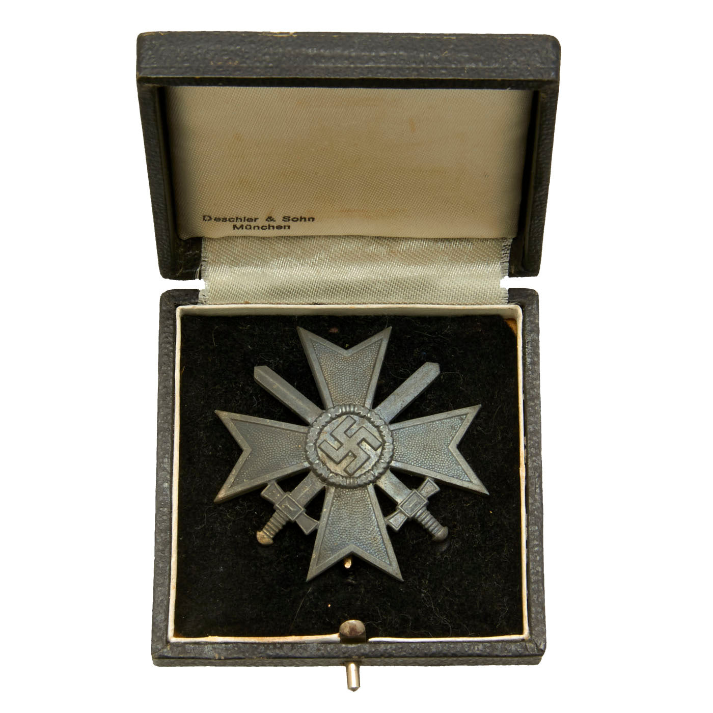 This KVK comes in an original correct case, showing a silver facsimile of the cross with swords on case lid. It is however from a different manufacturer, in this case Deschler & Sohn / München. The case has a nice interior, with a velvet bottom with inlet, and a nice satin top. The hinge and latch still work wonderfully, with no issues. There is some wear to the exterior of the case, but it still presents very nicely.