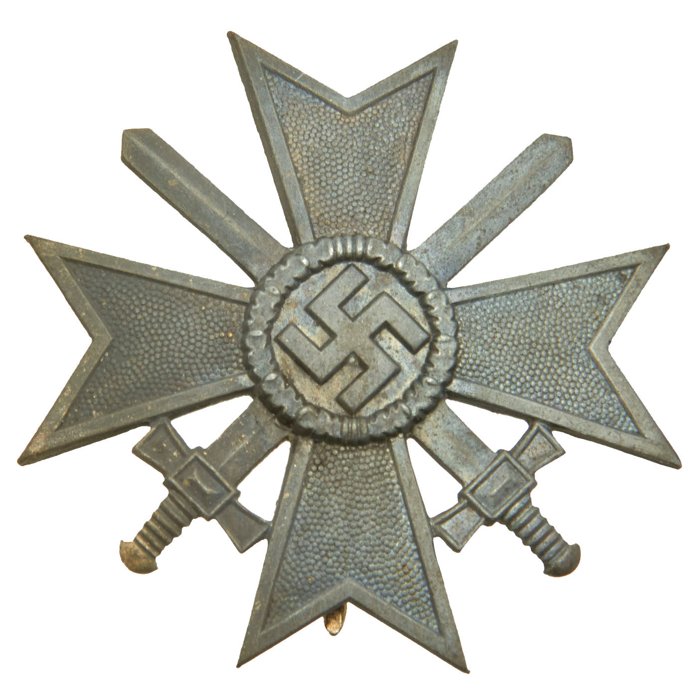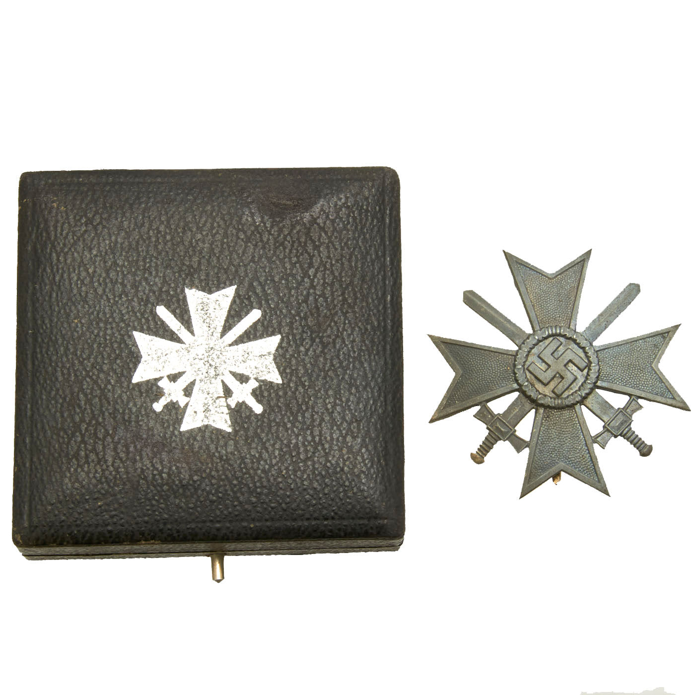 Original Items: Only One Available. This is a very nice cased example of a War Merit Cross KvK 1st Class in Silver with swords, manufactured by Steinhauer & Lück of Lüdenscheid, a city with a major garment accessories industry. This early war example in zinc alloy has a lovely patina, though it has lost almost all of the original silver wash, which is common. There are sharp details to contours and pebbles to internal cross arms.