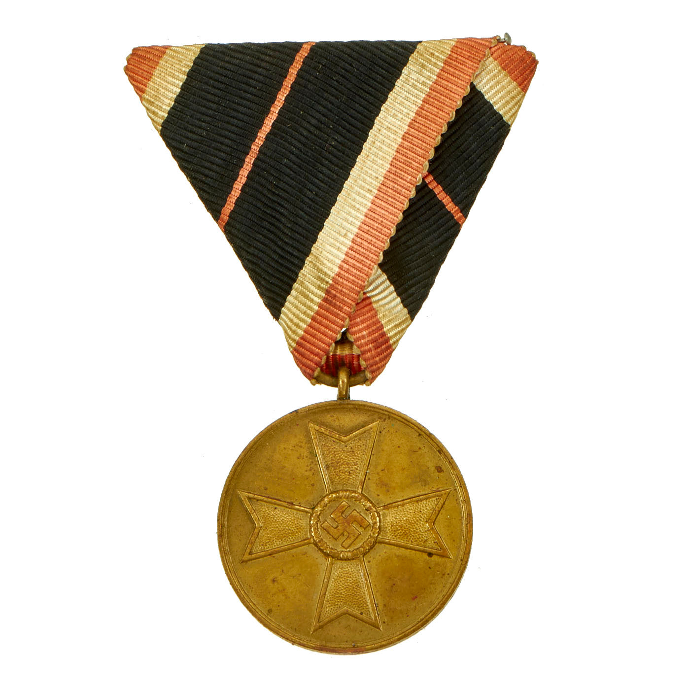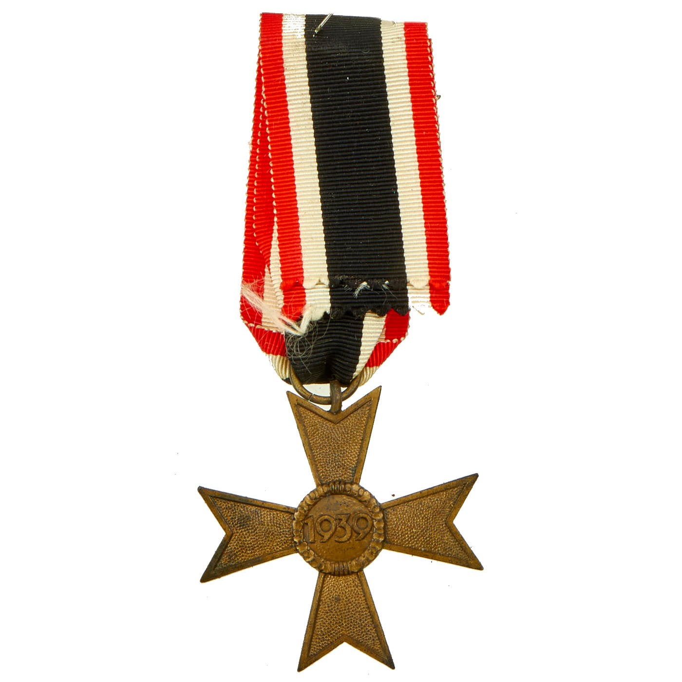 The ribbon of the War Merit Cross was in red-white-black-white-red; that was, the red and black colors being reversed from the ribbon of the World War II version of the Iron Cross. The ribbon for the War Merit Medal was similar, but with a narrow red vertical red strip in the center of the black field. Soldiers who earned the War Merit Cross 2nd Class with Swords wore a small crossed-swords device on the ribbon. The War Merit Cross 1st Class was a pin-backed medal worn on the pocket of the tunic (like the Iron Cross 1st Class). The ribbon of the War Merit Cross 2nd Class could be worn like the ribbon of the Iron Cross 2nd Class (through the second buttonhole). Nonetheless combat soldiers tended to hold the War Merit Cross in low regard, referring to its wearers as being in 'Iron Cross Training'. The Knights Cross of the War Merit Cross was a neck decoration and worn the same way as the Knights Cross of the Iron Cross.