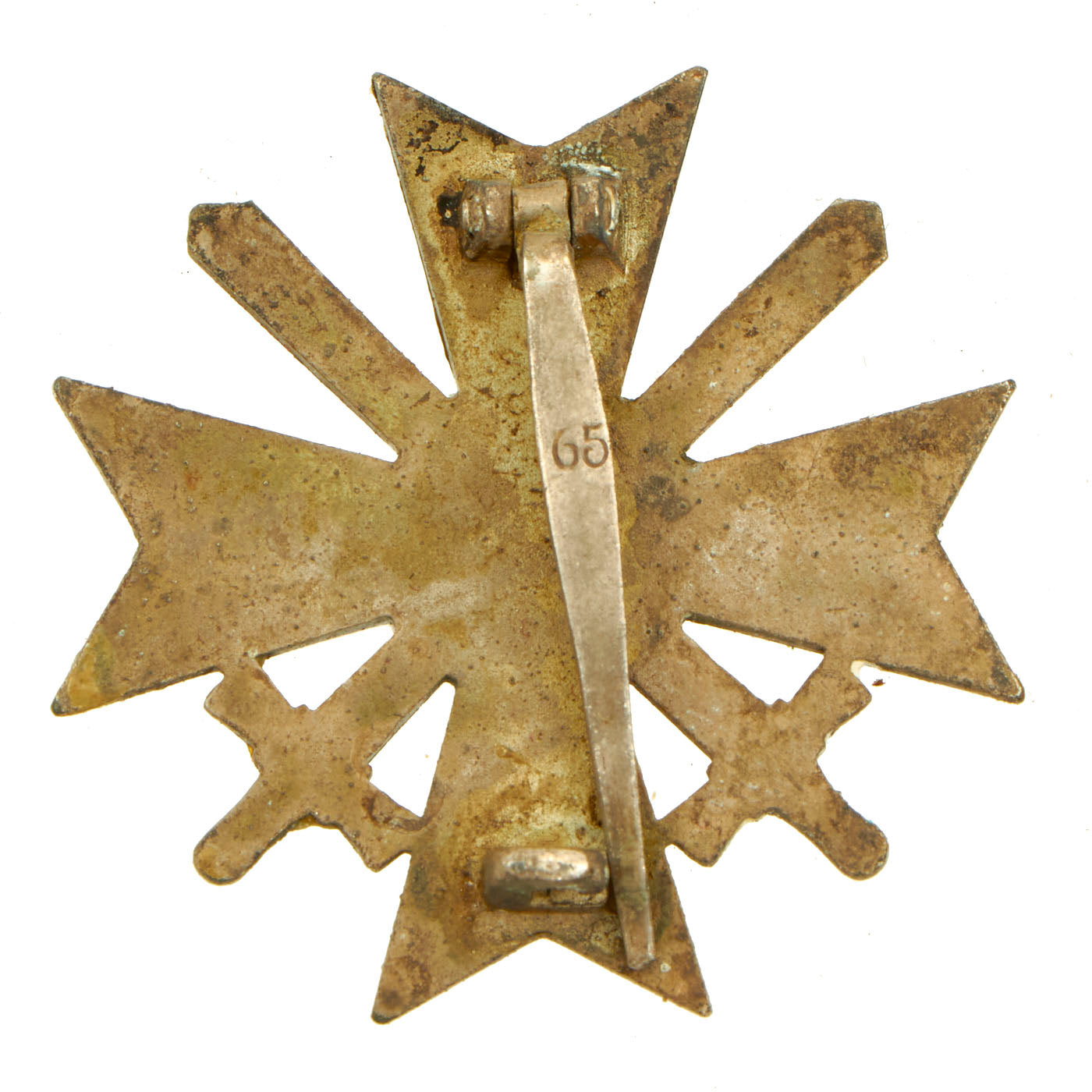 - KvK 1st Class With Swords Marked 65: This is another lovely example of the KvK 1st Class with swords. The pin arm is marked with the number 65 for maker Klein & Quenzer A.G. The original silver wash now displays a lovely dark patina.