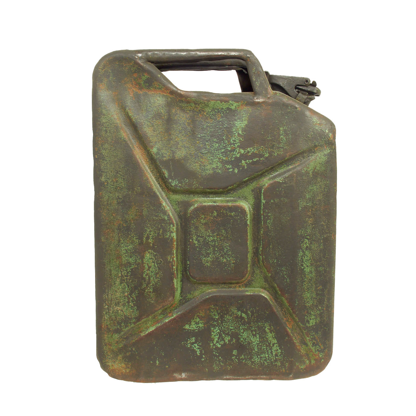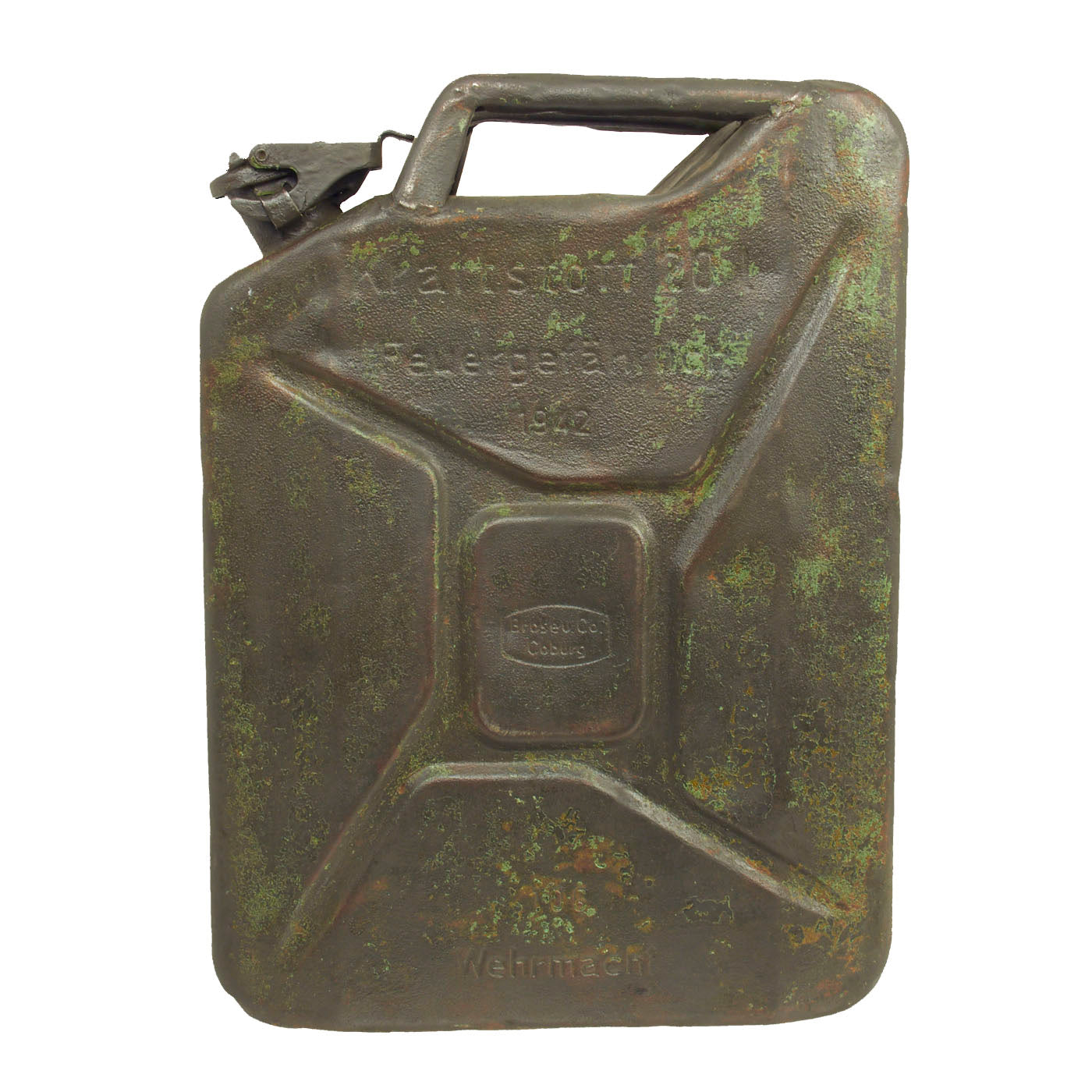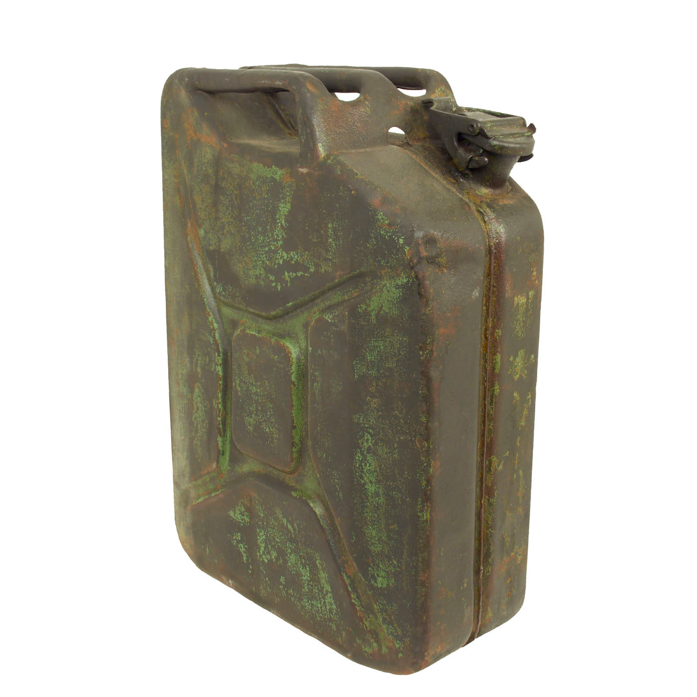 Original Item: Only One Available. A jerrycan is a robust liquid container made from pressed steel. It was designed in Germany in the 1930s for military use to hold 20 liters (4.4 imp gal; 5.3 US gal) of fuel, and saw widespread use by both Germany and the Allies during the Second World War.