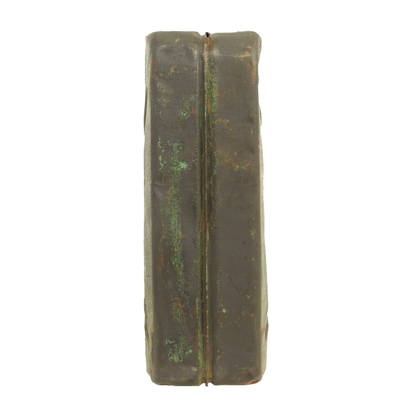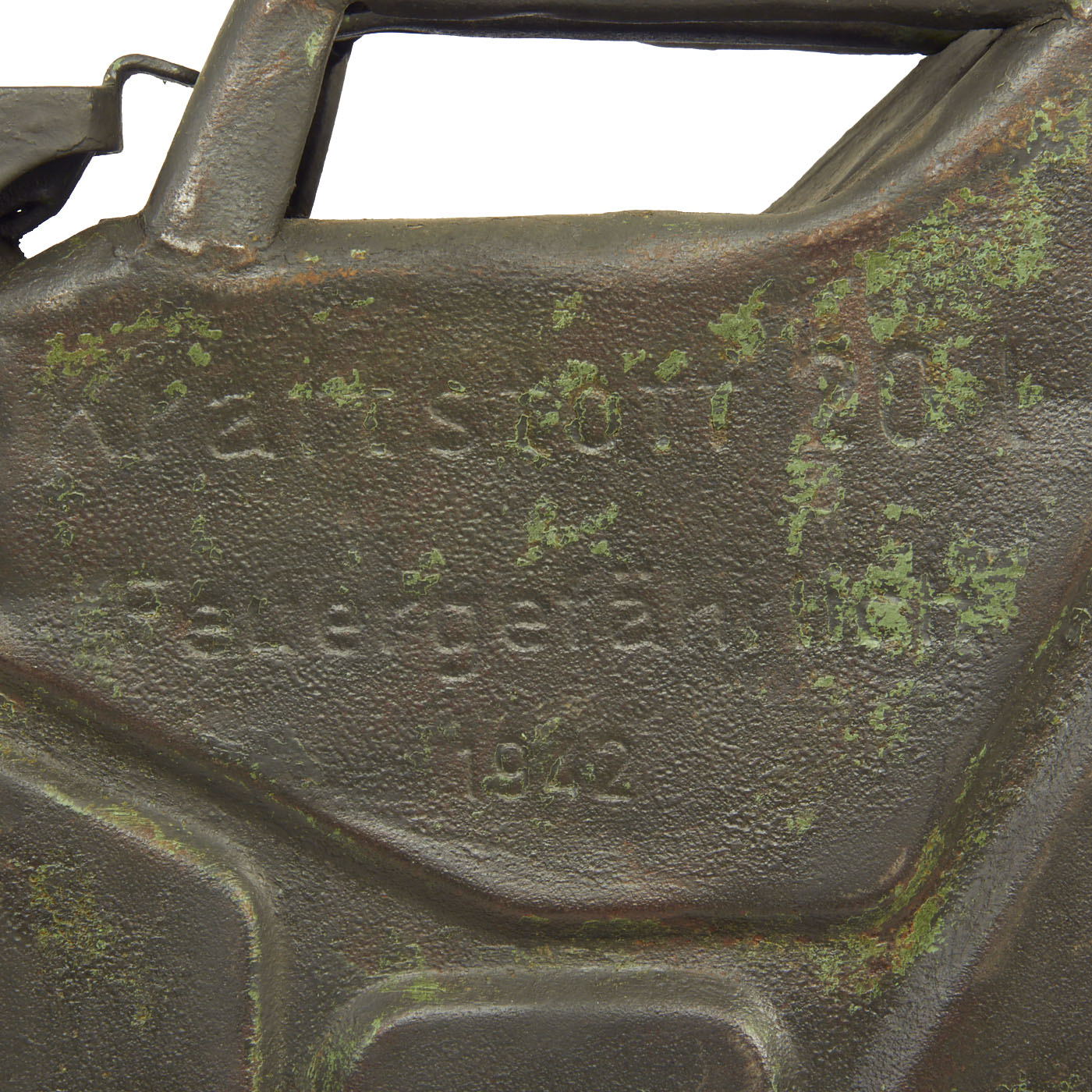 Offered in very good service used condition, this is a totally original 1942 dated Petrol "Jerry Can", which looks to have been repainted, probably several times, during the post war years. It now shows wear and oxidation, with dents from handling, so this is definitely not an example that spent its life in storage. It looks to have had some oxidation on the surface at one point, which was blasted off before it was repainted in the past.