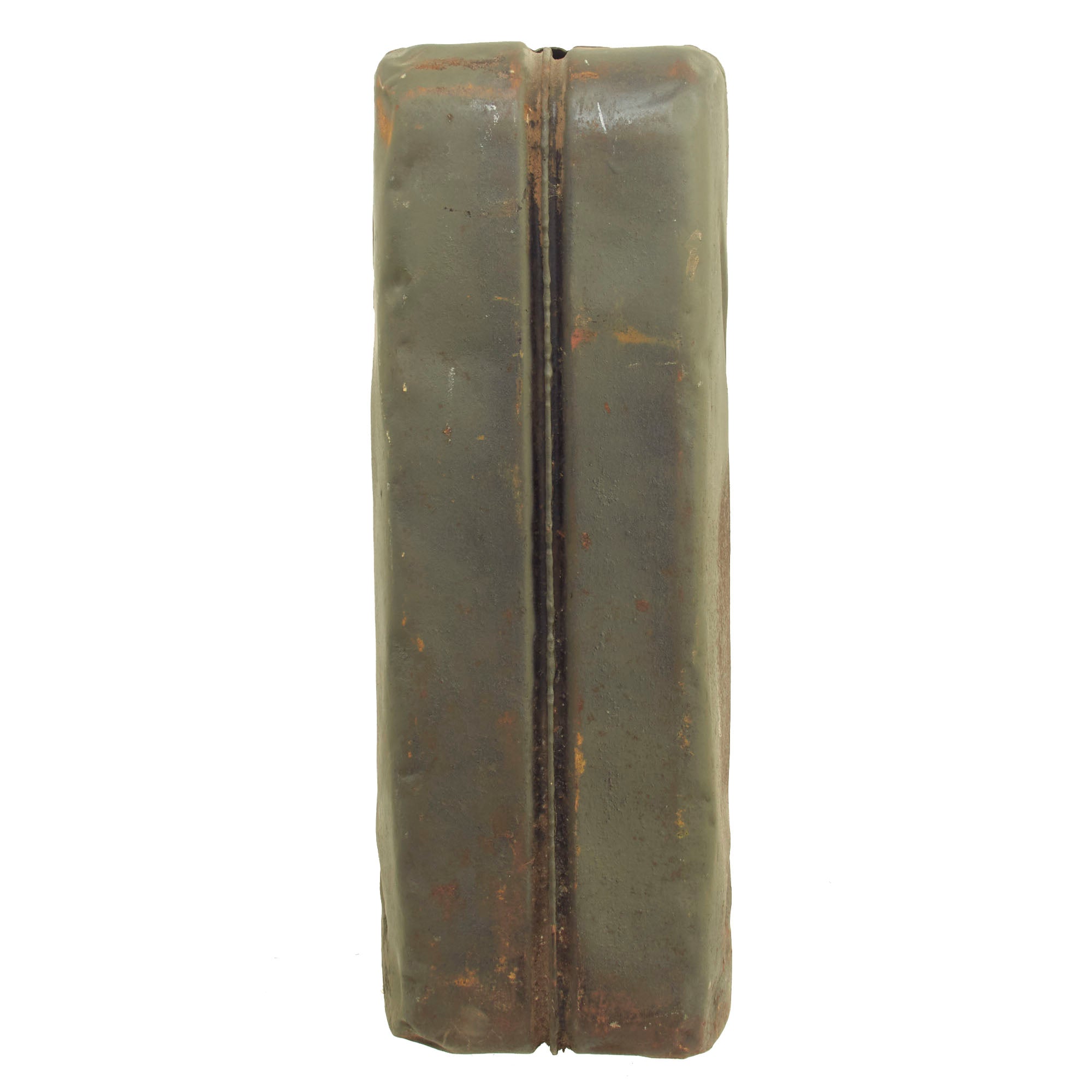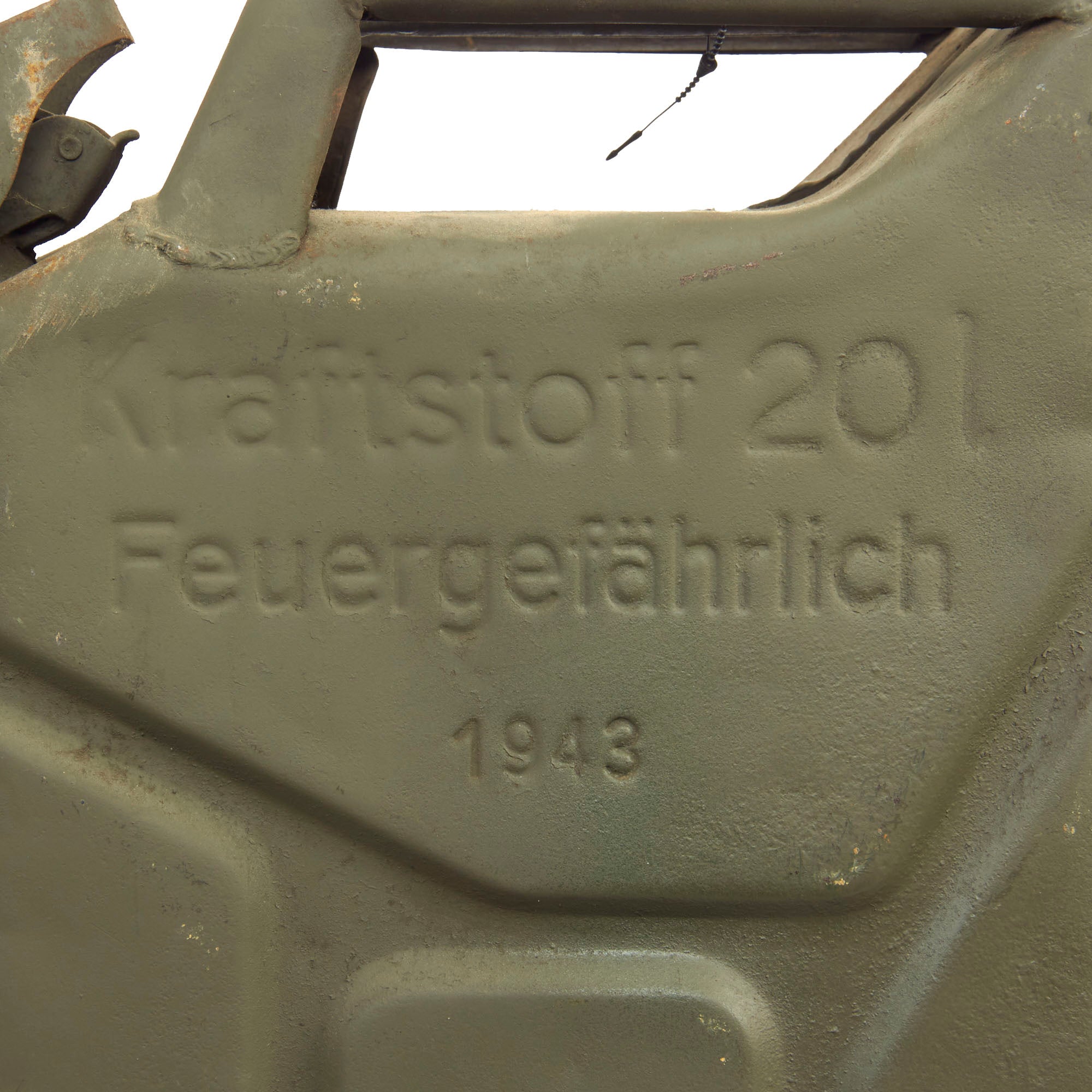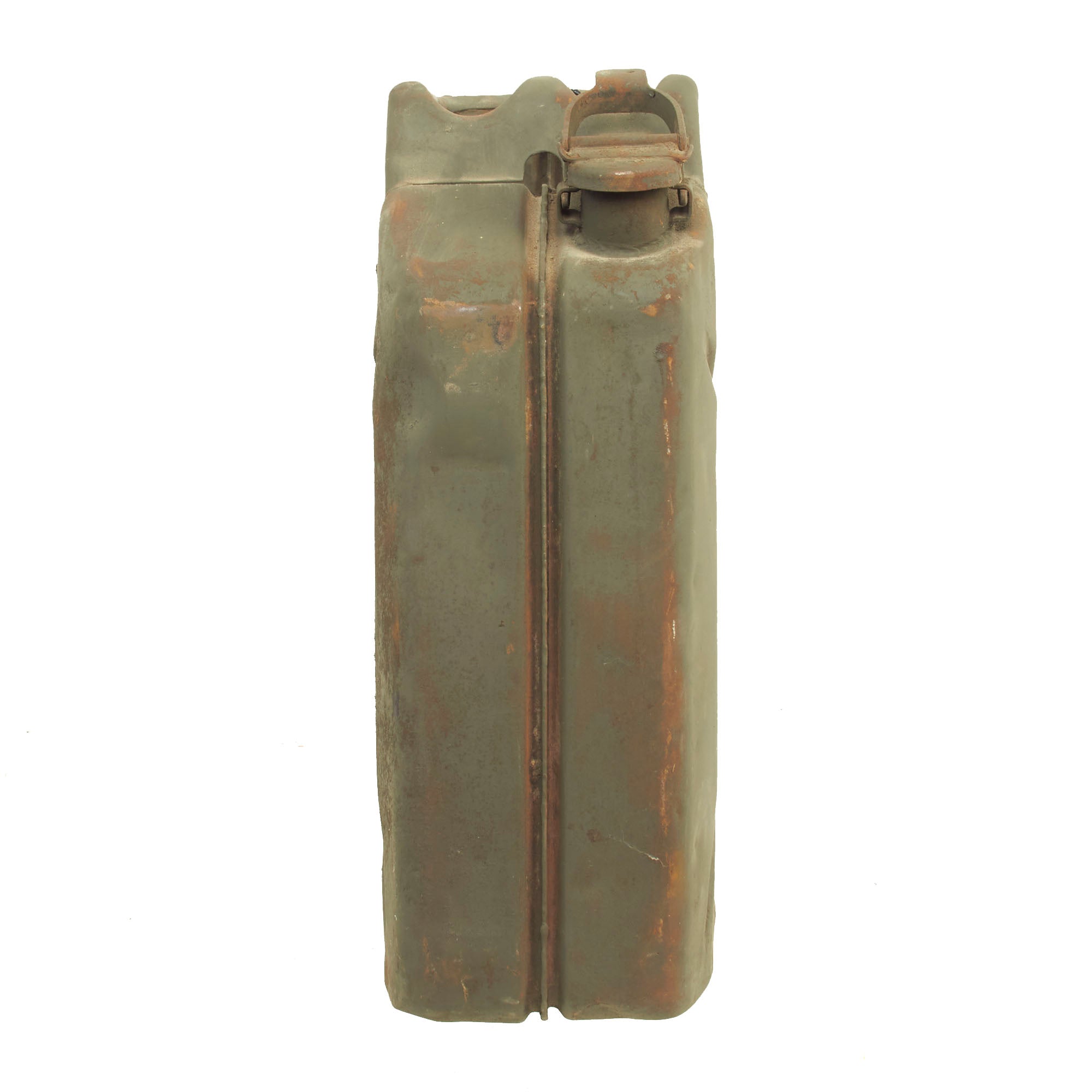 Offered in very good service used condition, this is a totally original 1943 dated Petrol "Jerry Can", which like many looks to have seen service post war. The original blue gray paint job was removed at some point, and it was repainted a more modern OD green at some point. It saw additional service after that, and there is now wear and oxidation through the new paint job. It shows some wear and denting, but nothing out of the ordinary for a service used can.