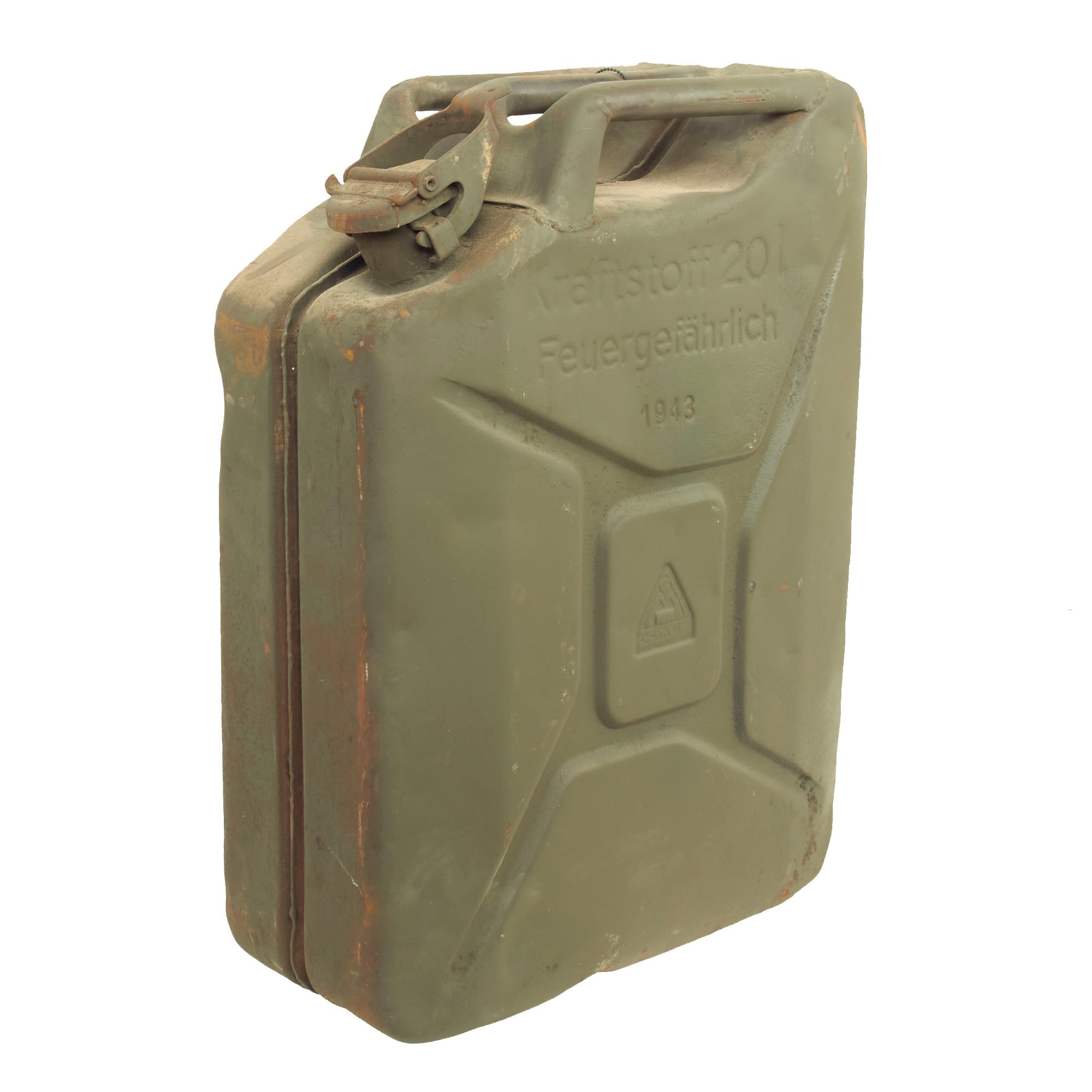 Original Item: Only One Available. A jerrycan is a robust liquid container made from pressed steel. It was designed in Germany in the 1930s for military use to hold 20 liters (4.4 imp gal; 5.3 US gal) of fuel, and saw widespread use by both Germany and the Allies during the Second World War.