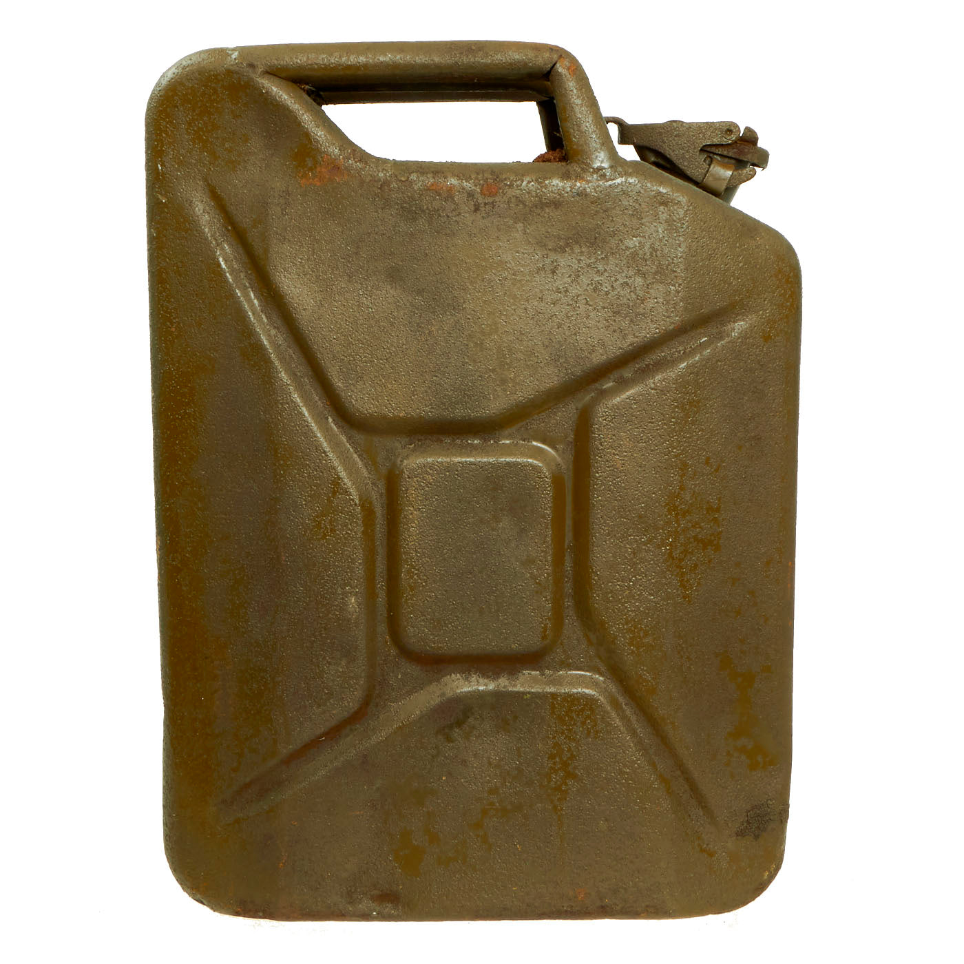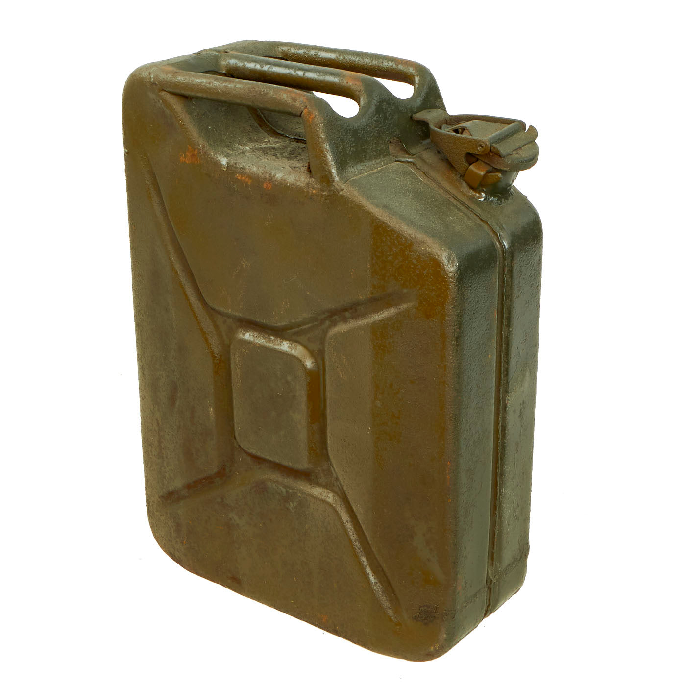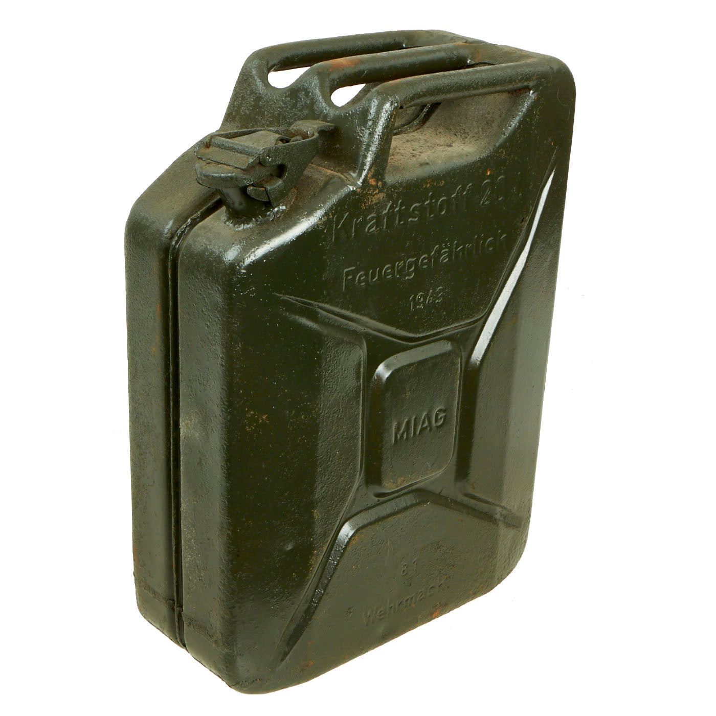 Original Item: Only One Available. A jerrycan is a robust liquid container made from pressed steel. It was designed in Germany in the 1930s for military use to hold 20 liters (4.4 imp gal; 5.3 US gal) of fuel, and saw widespread use by both Germany and the Allies during the Second World War.