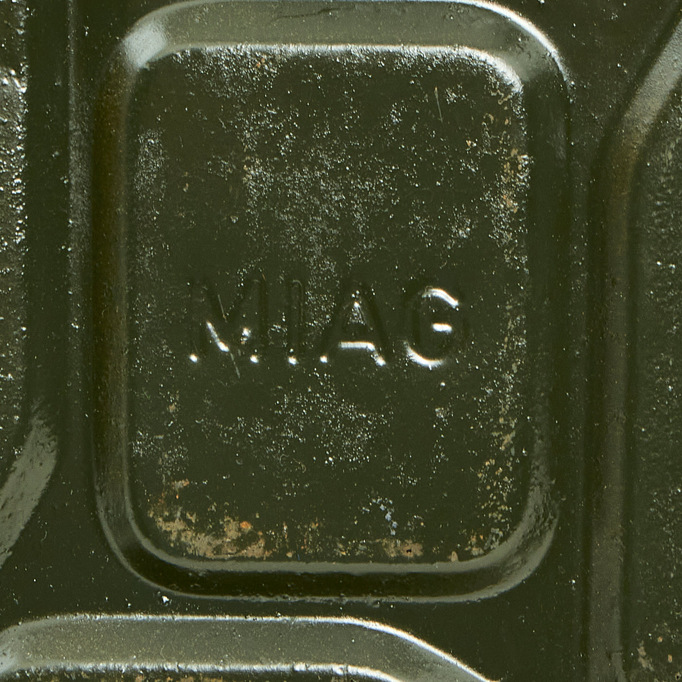 This translates to "fuel 20 liters - flammable", and maker marking is for Mühlenbau und Industrie AG (Mill Construction and Industry Company) located in Braunschweig, Germany. Many period examples by this maker have been seen.