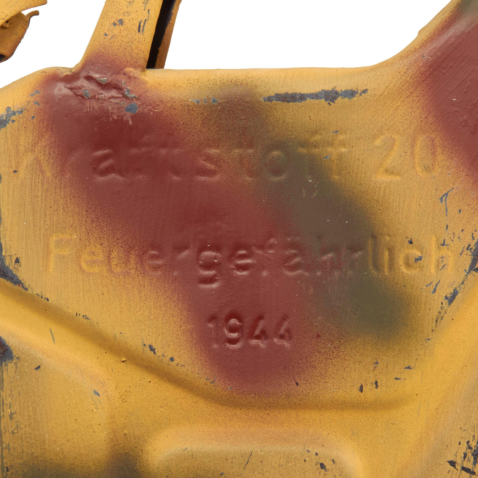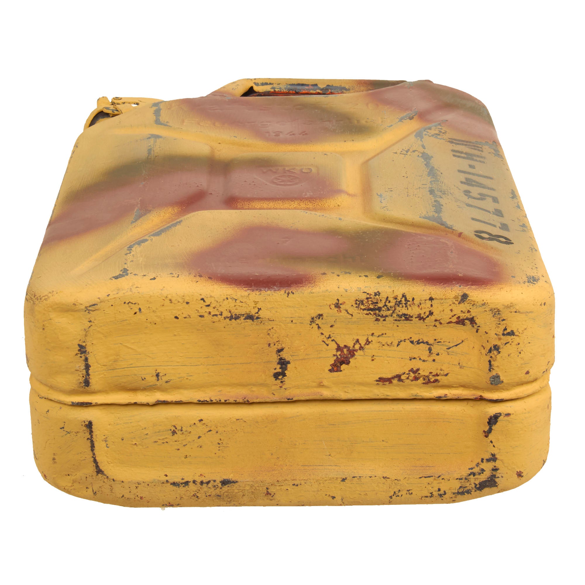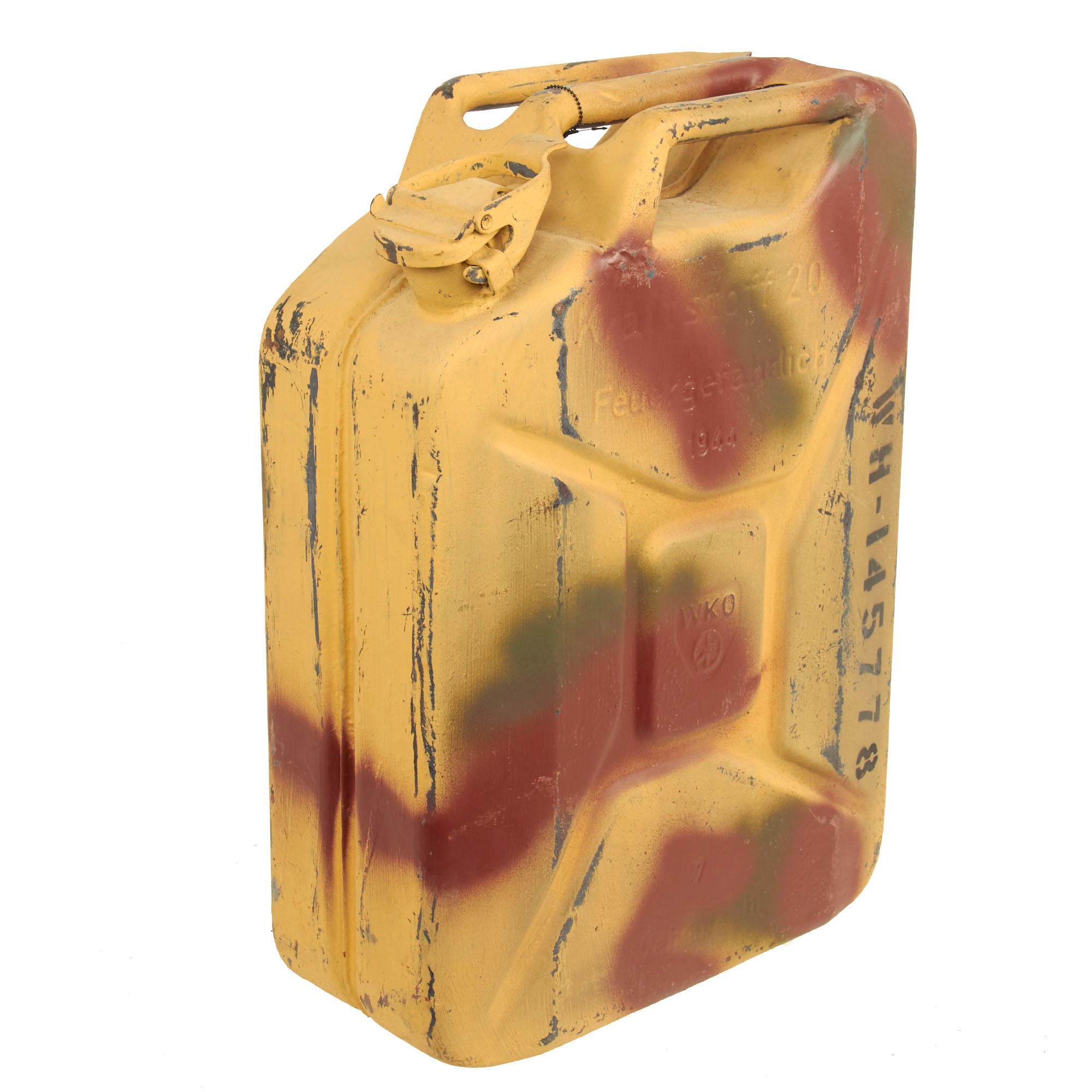 Offered in very good service used condition, this is a totally original 1944 dated Petrol "Jerry Can", which looks to have seen service post war, and had a very nice three color camouflage paint job applied over the original panzergrau gray blue. This has now worn away in some places, showing the original paint underneath. It also had number WH-145778 stenciled onto the side.