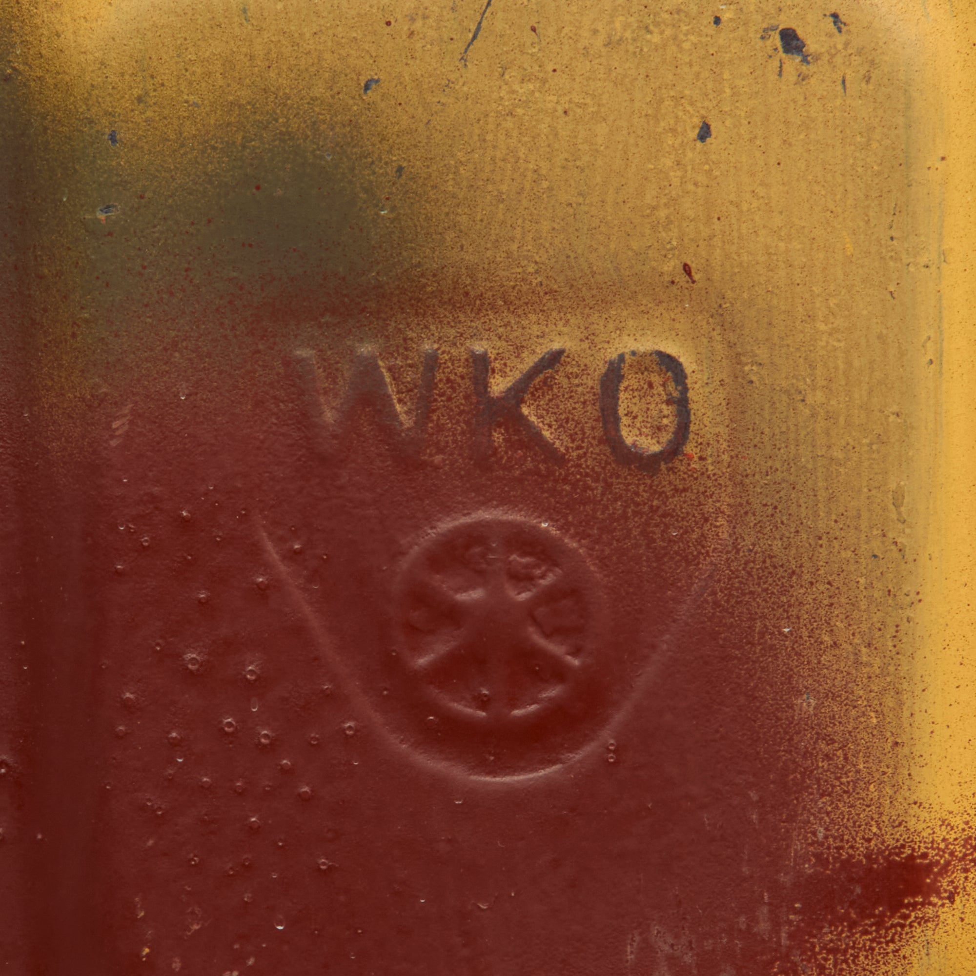 This translates to "fuel 20 liters - flammable", and maker WKO is a known manufacturer of WWII Jerry Cans. Unfortunately at present they still remain unidentified, as with many of the WWII manufacturers, who usually did not utilize the three letter codes.