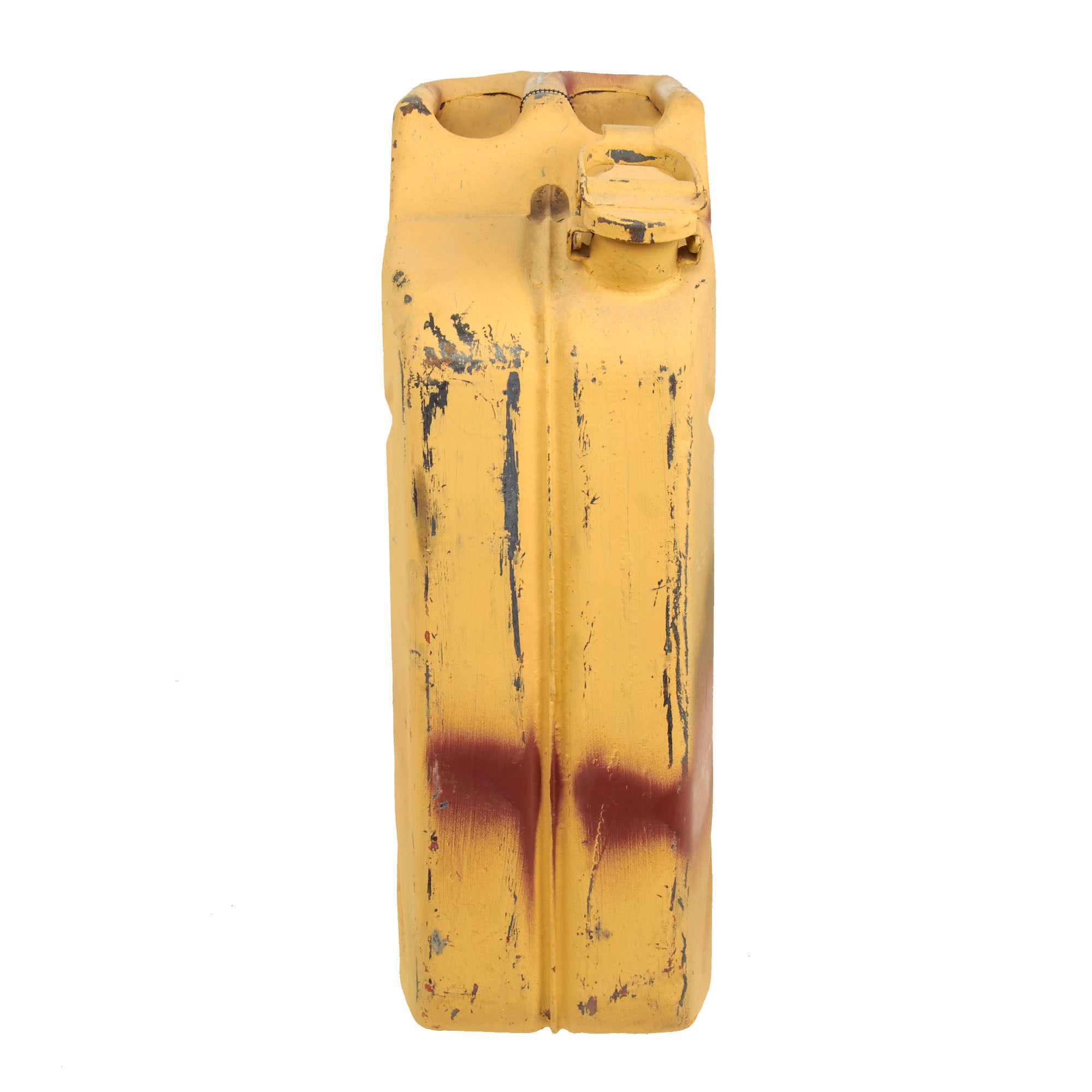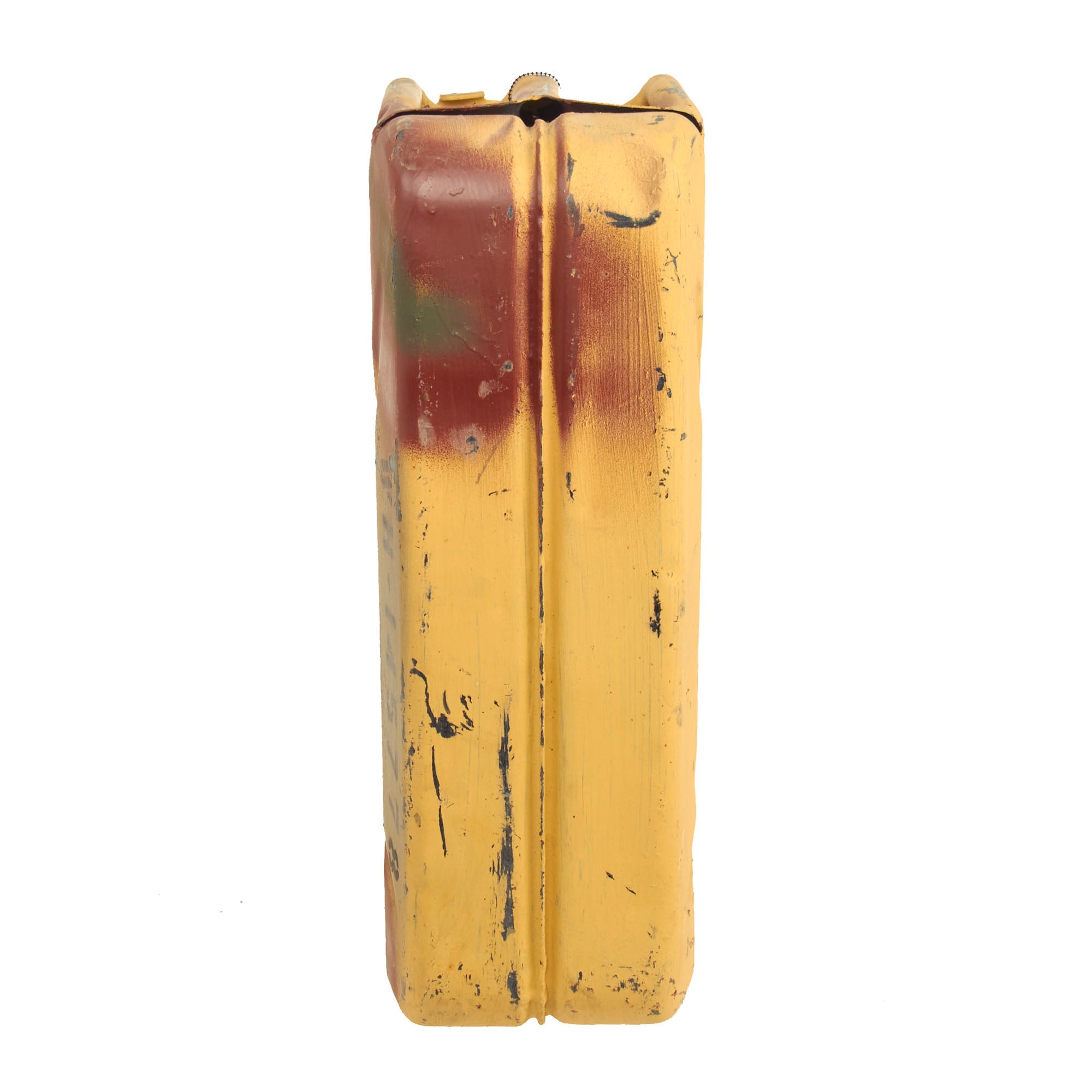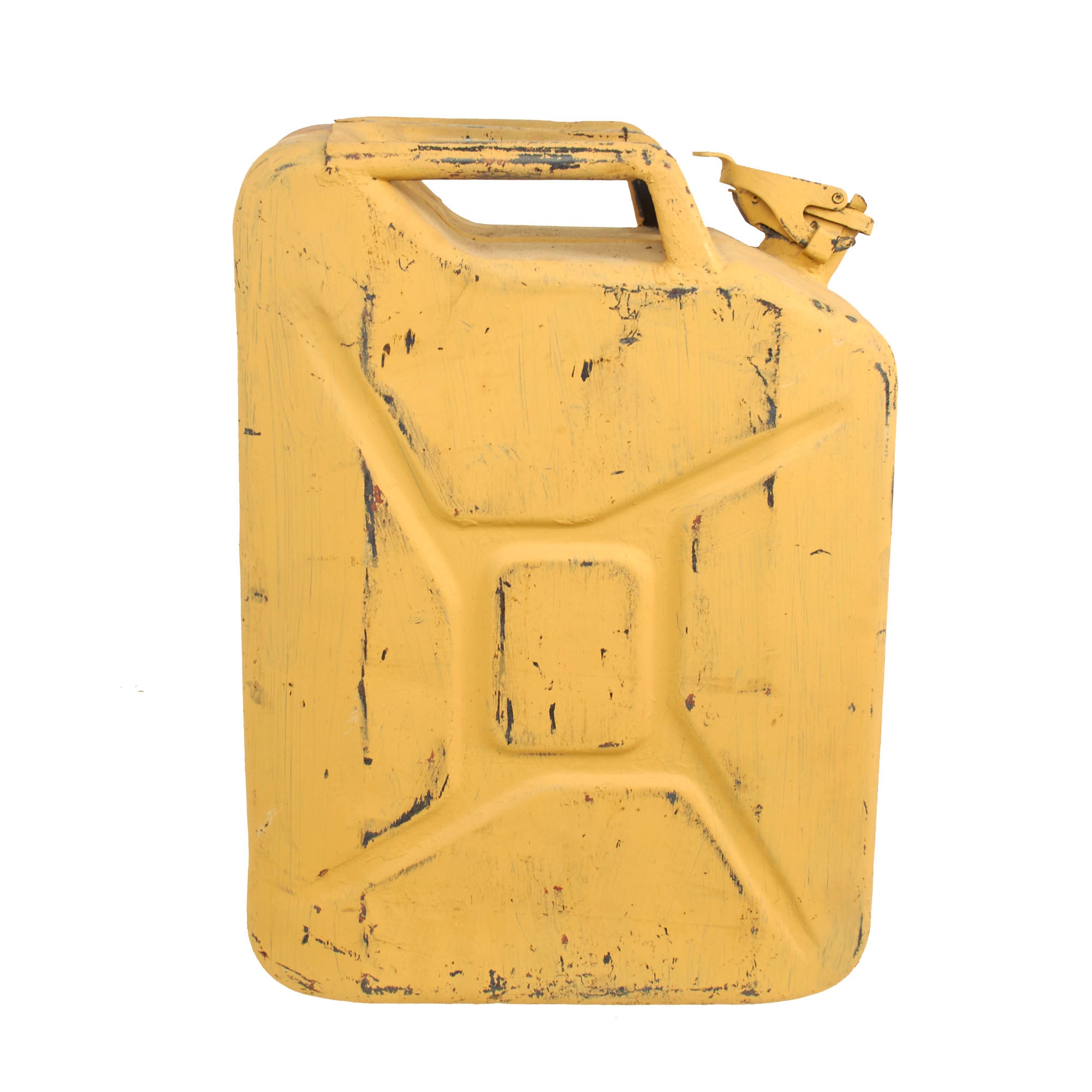 The Wehrmacht-Einheitskanister, as it was known in Germany, was first developed in 1937 by the Müller engineering firm in Schwelm to a design by their chief engineer Vinzenz Grünvogel. A similar design was used in 1936 during the Spanish Civil War, where they had a company logo for Ambi-Budd Presswerk GmbH. Among others, the Wehrmacht had specified that a soldier should be able to carry either two full containers or four empty ones, which is the reason the triple handles were fitted. To achieve the required filling and draining speed, it was fitted with a large spout and flip top closure. A hole in the closure retainer made it possible to fit a securing pin or wire with a lead seal. The rectangular shape made it stackable. The recessed welded seam stiffened the container and protected the seam from impact damage. The indentations ensured a full can would not be severely damaged when falling from a vehicle, while a dip coat of paint on the inside protected it from corrosion.