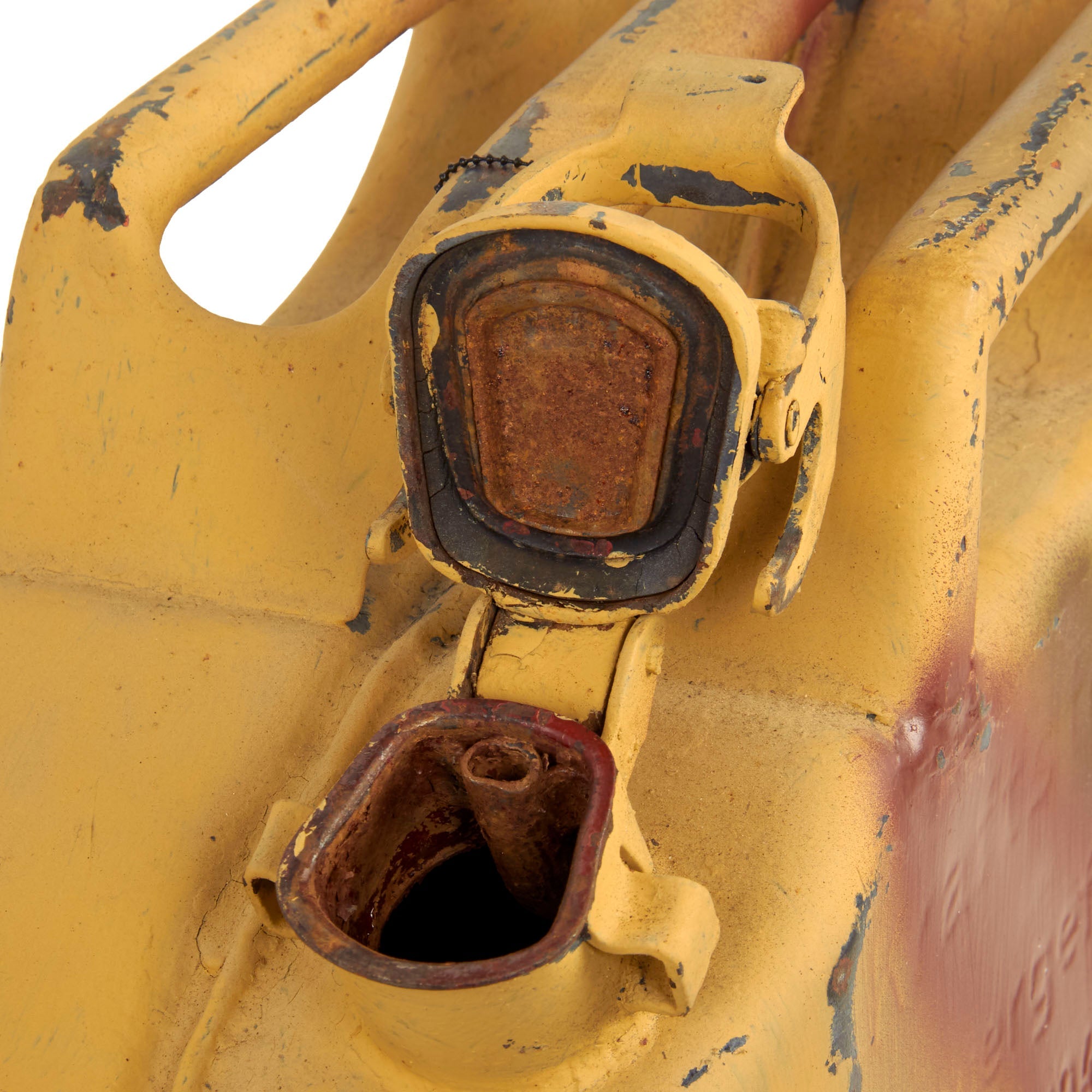 Offered in very good solid condition, the nozzle latch is still functional, and the rubber gasket is still present, though now hardened. We checked the interior, and while there is some of the original red enamel, most of it is now missing, showing oxidation on the interior. It does not look to have any areas that would leak, but we cannot guarantee that it will still hold fuel without leaking.