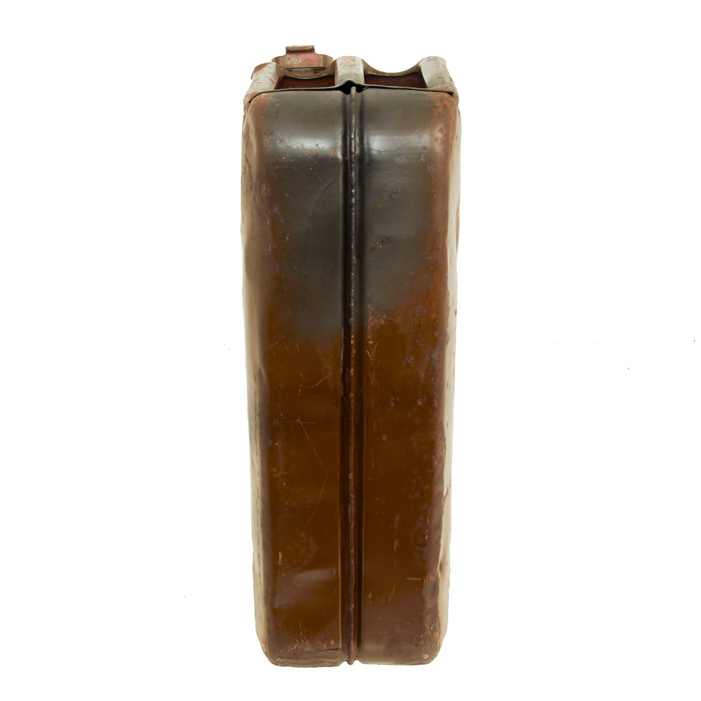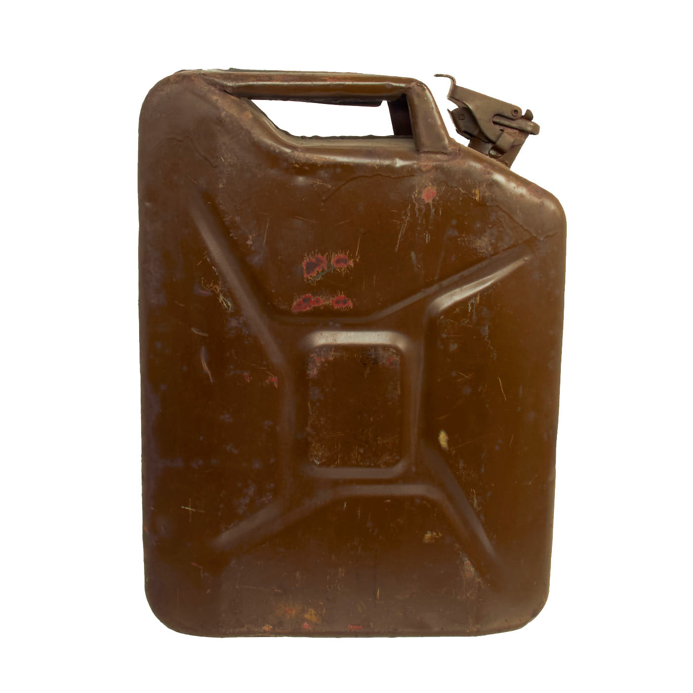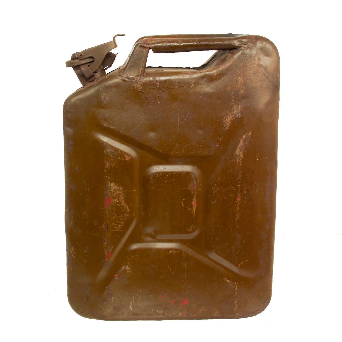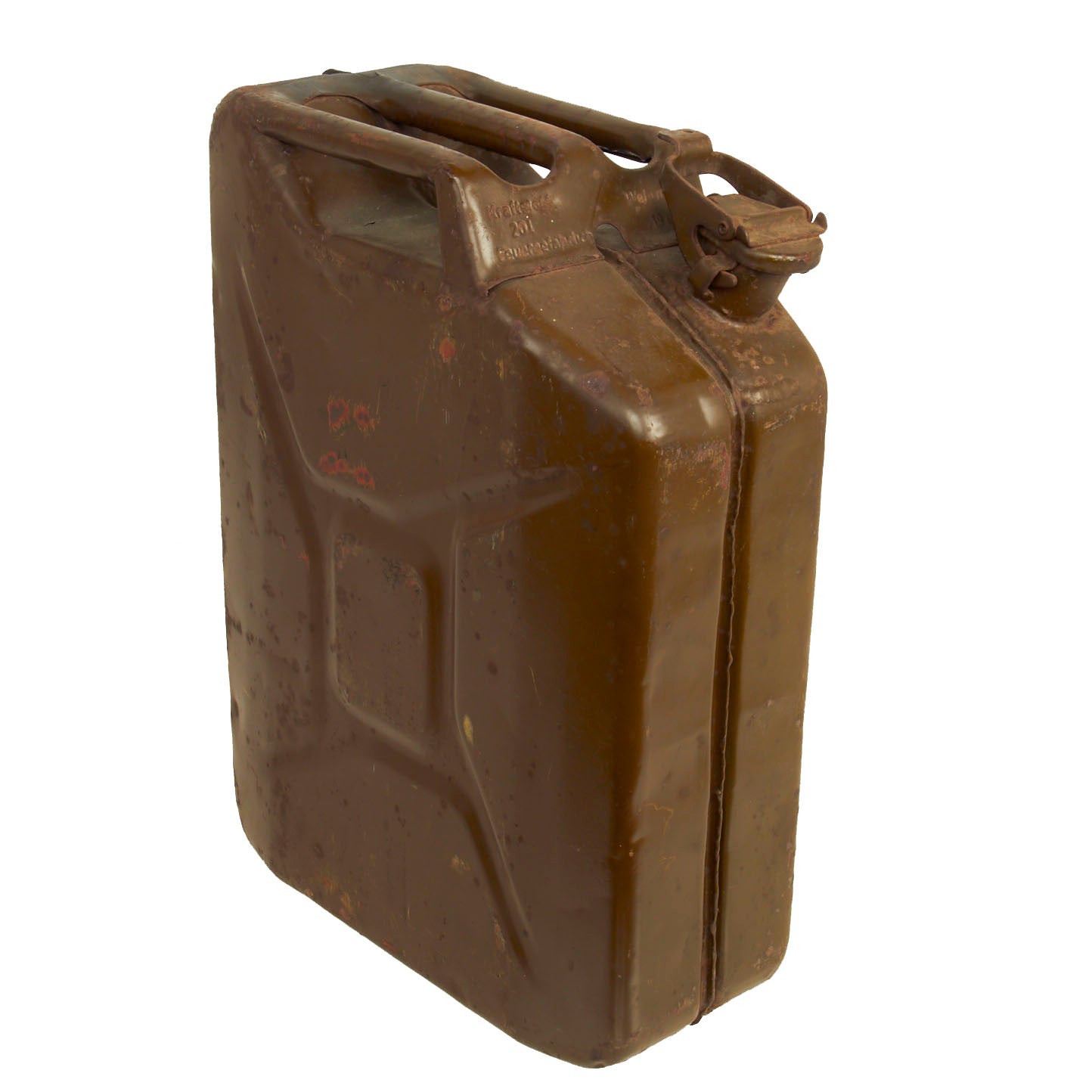 • Original Item: Only One Available. A jerrycan is a robust liquid container made from pressed steel. It was designed in Germany in the 1930s for military use to hold 20 liters (4.4 imp gal; 5.3 US gal) of fuel, and saw widespread use by both Germany and the Allies during the Second World War.
