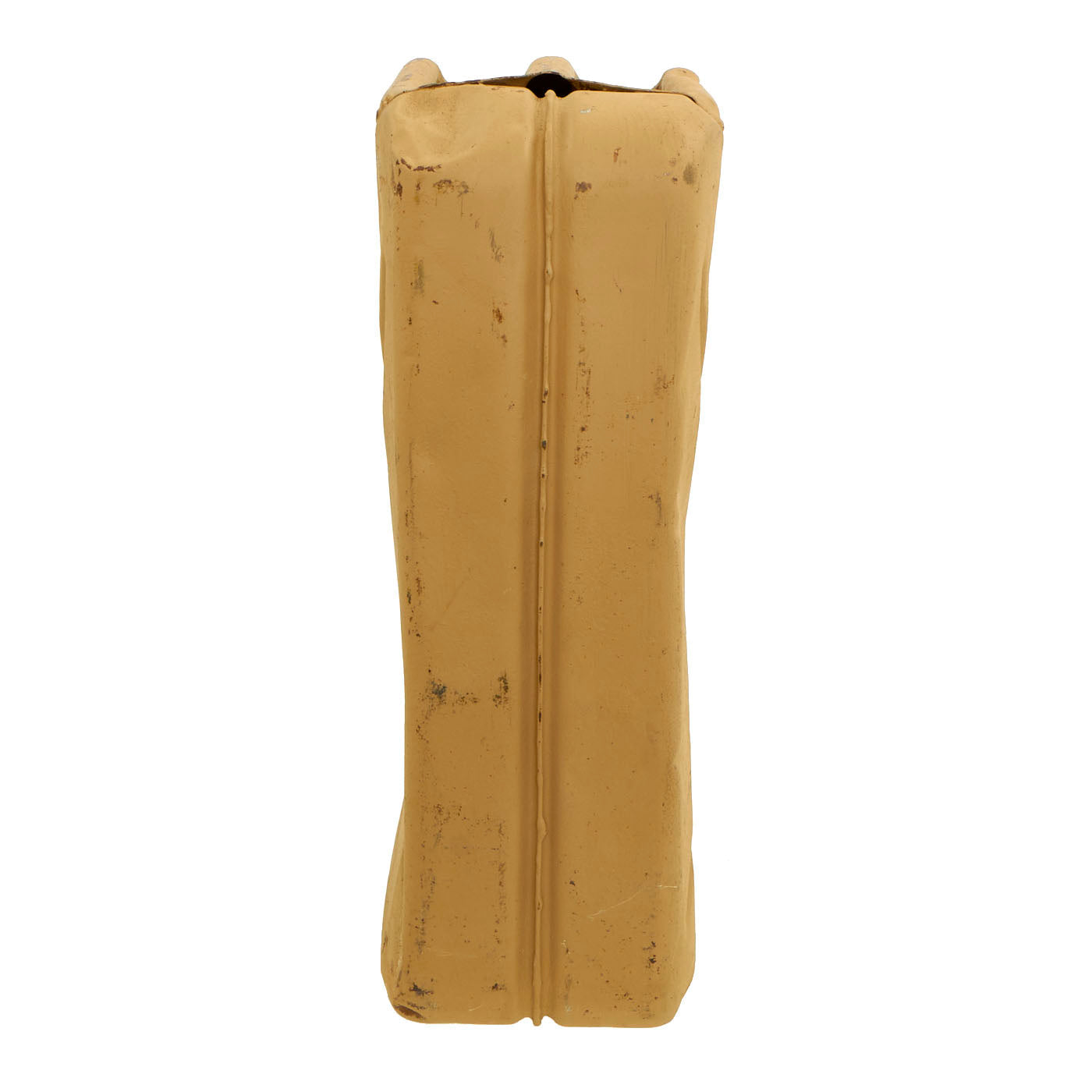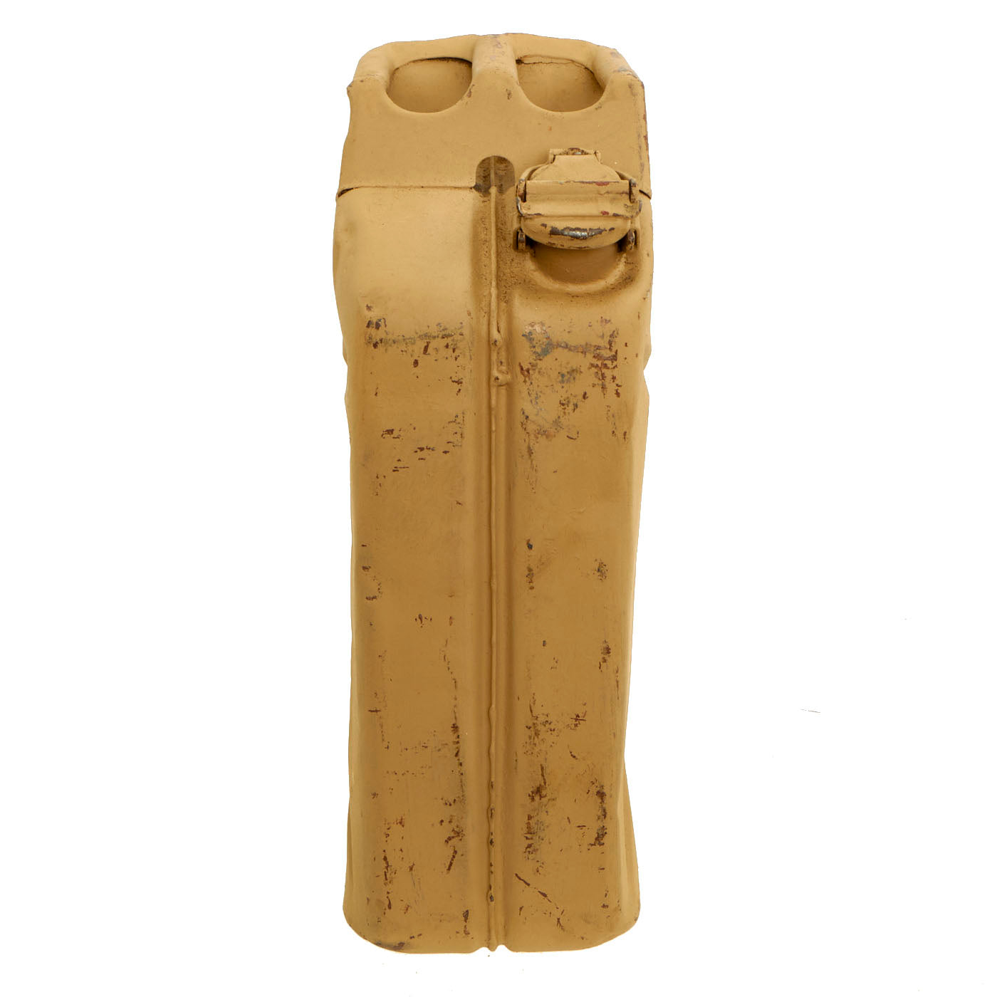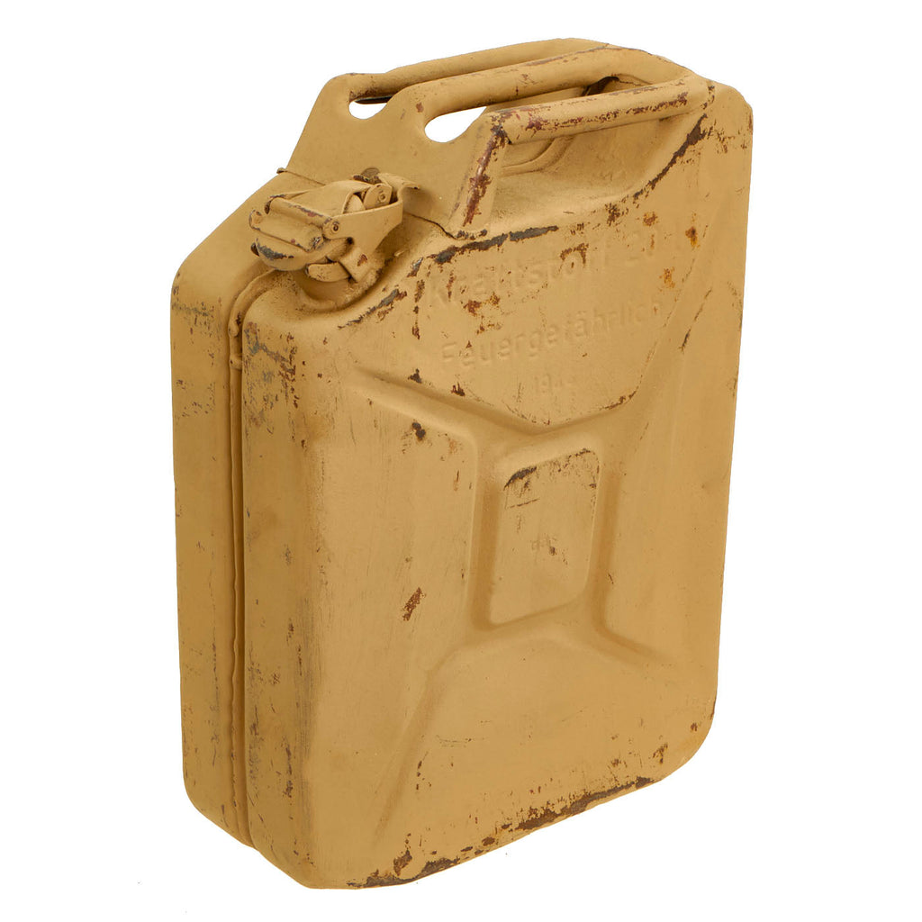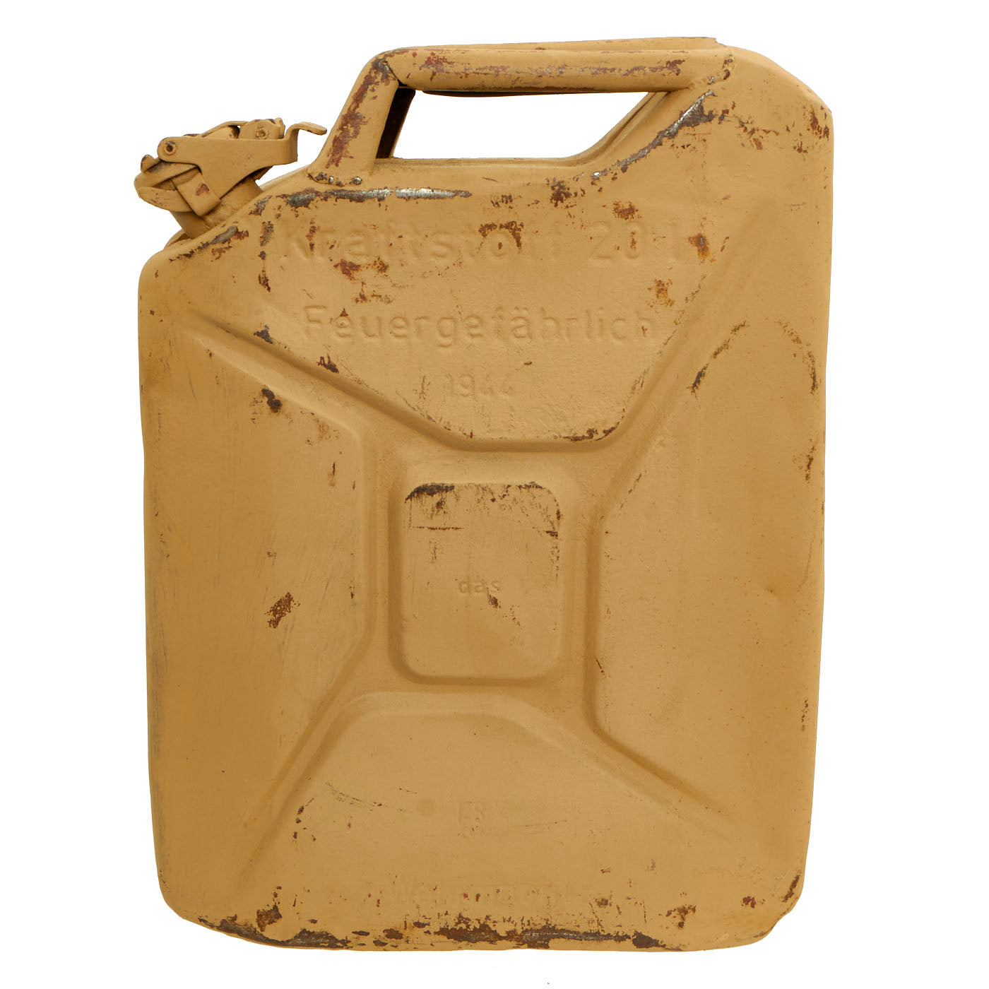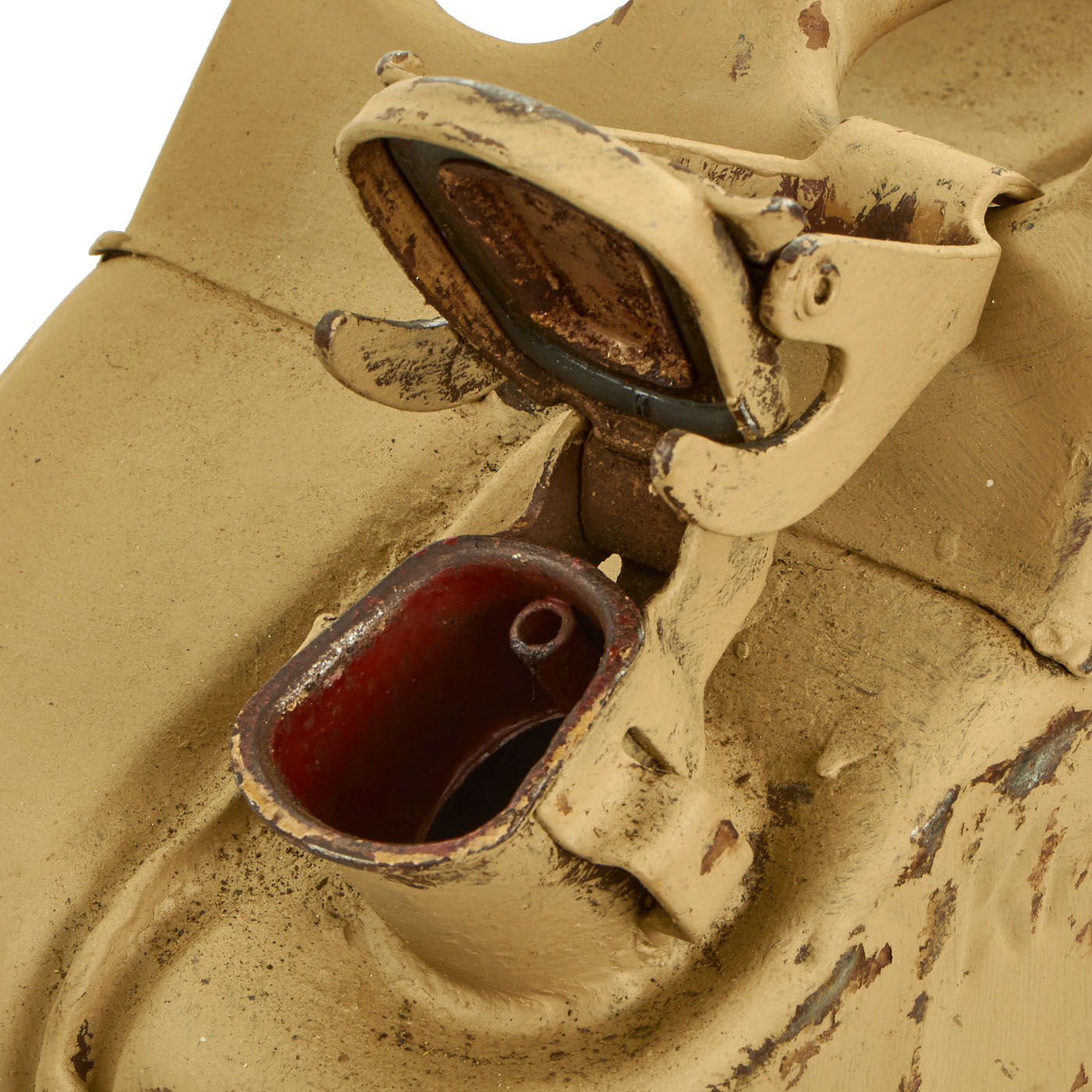 Original Item: Only one available. Offered in very good condition, this is a totally original 1944 dated Petrol "Jerry Can", with a DAK desert tan paint job. We can see the red primer under the paint where it has worn off, but it definitely does not look to be the original paint job. We do not know whether it was repainted during the war, or post war. The side of the can is embossed with the identification and maker information: