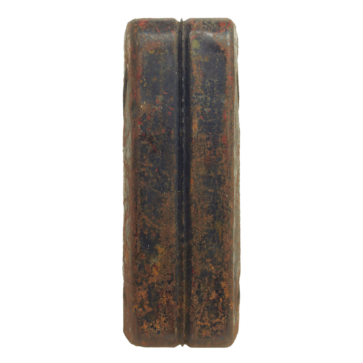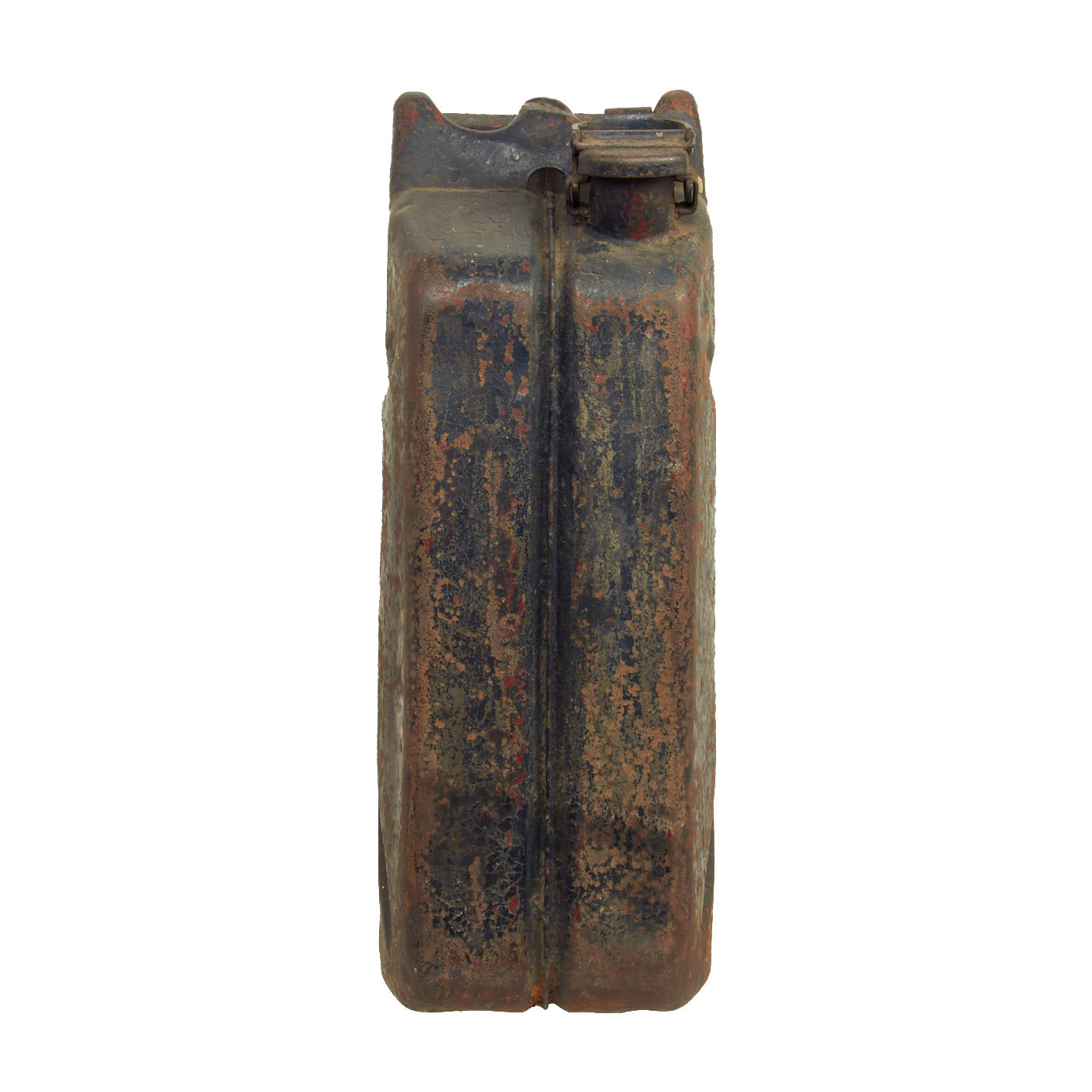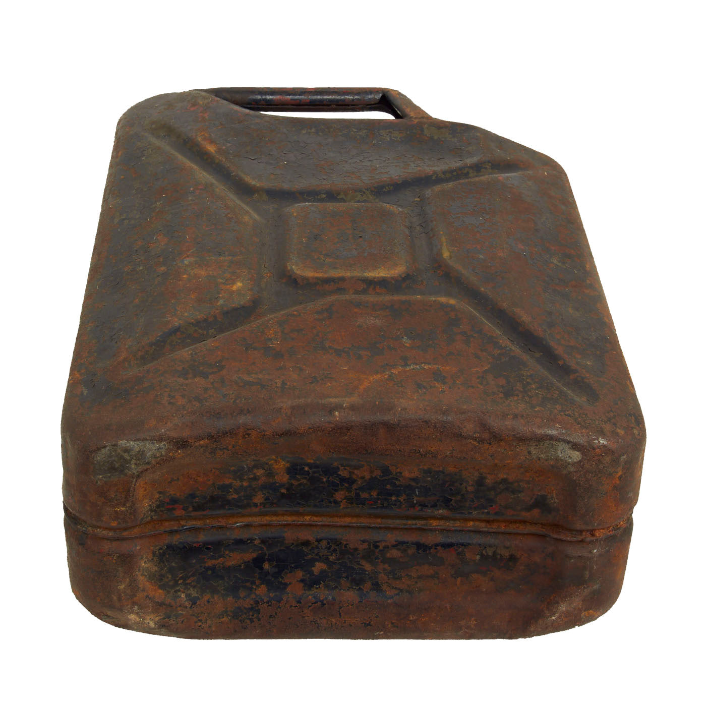 The Wehrmacht-Einheitskanister, as it was known in Germany, was first developed in 1937 by the Müller engineering firm in Schwelm to a design by their chief engineer Vinzenz Grünvogel. A similar design was used in 1936 during the Spanish Civil War, where they had a company logo for Ambi-Budd Presswerk GmbH. Among others, the Wehrmacht had specified that a soldier should be able to carry either two full containers or four empty ones, which is the reason the triple handles were fitted. To achieve the required filling and draining speed, it was fitted with a large spout and flip top closure. A hole in the closure retainer made it possible to fit a securing pin or wire with a lead seal. The rectangular shape made it stackable. The recessed welded seam stiffened the container and protected the seam from impact damage. The indentations ensured a full can would not be severely damaged when falling from a vehicle, while a dip coat of paint on the inside protected it from corrosion.