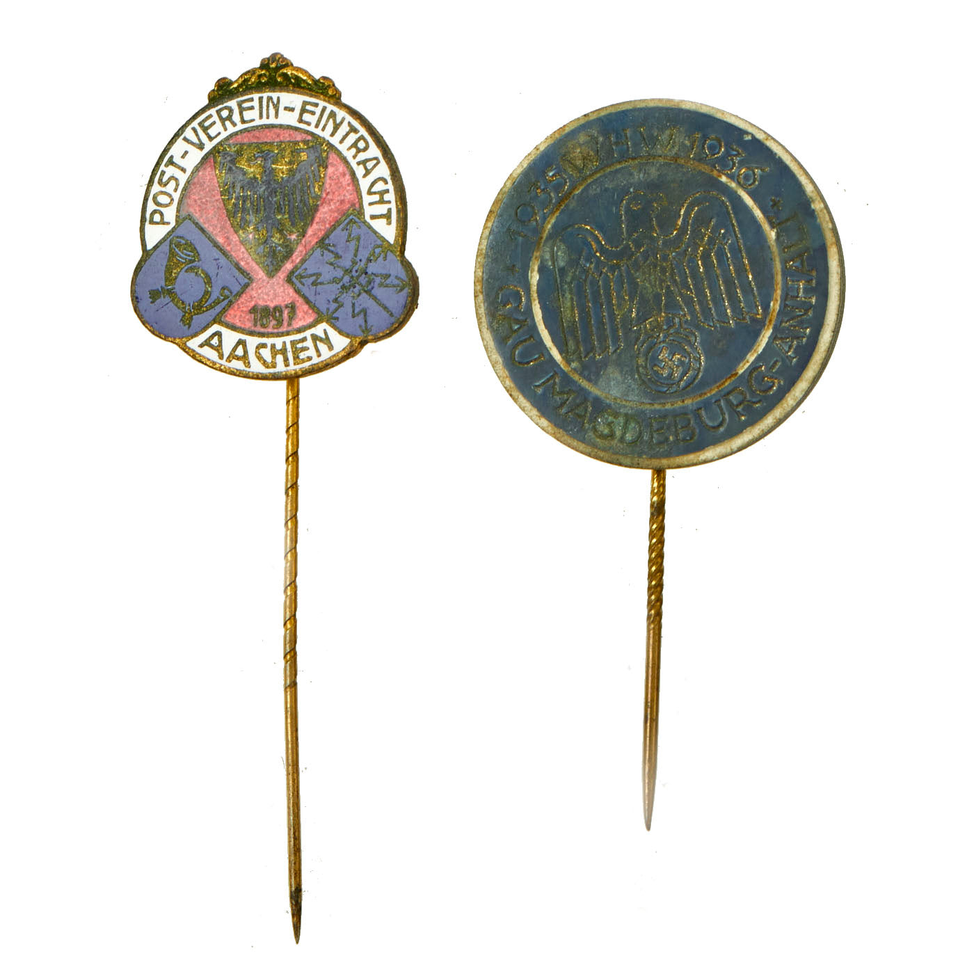 - 2x Stick Pins: The pins are in good condition with much of the original colors, enamel and finish retained. The pins are 1935/36 WHW Magdeburg and Aachen 1897 Track Club.