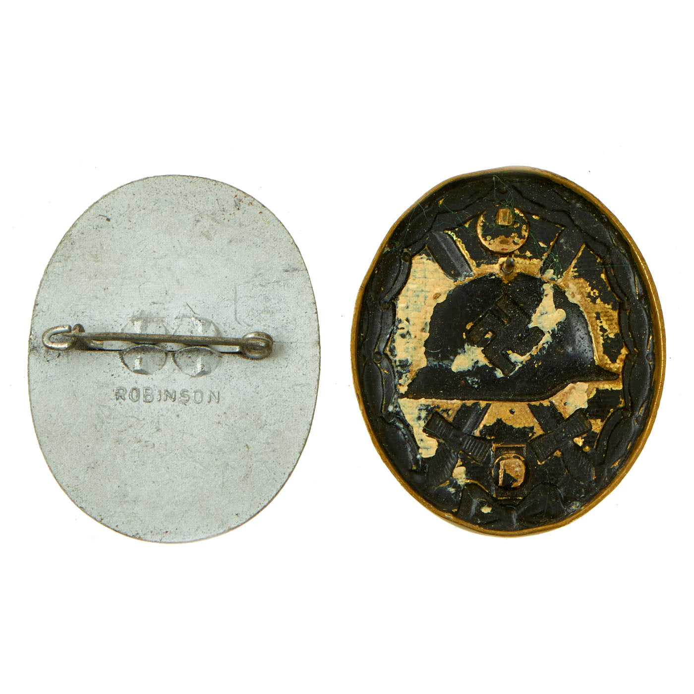 - Black Wound Badge: Badges were made of pressed steel, brass and zinc. All versions of the Wound Badge were worn on the lower left breast of the uniform or tunic. The badge was worn below all other awards on the left. It ranked lower than combat badges. There were 24 approved manufacturers of the Wound Badge. At first, the Wound Badge in Black was stamped from sheet brass, painted semi-matte black with a hollow reverse pin back attachment or of solid construction. From 1942, steel was used to make the badges. The Wound Badge in silver was made (before 1942) from silver-plated brass, and (after 1942) from lacquered zinc, and had a solid reverse with either a needle pin or a broad flat pin bar. The Wound Badge in Gold was a gilded version of the Wound Badge in Silver. In 1957, a revised version of the Wound Badge was authorized for wear; however, the previous type could still be worn if the swas were removed (for example by grinding).