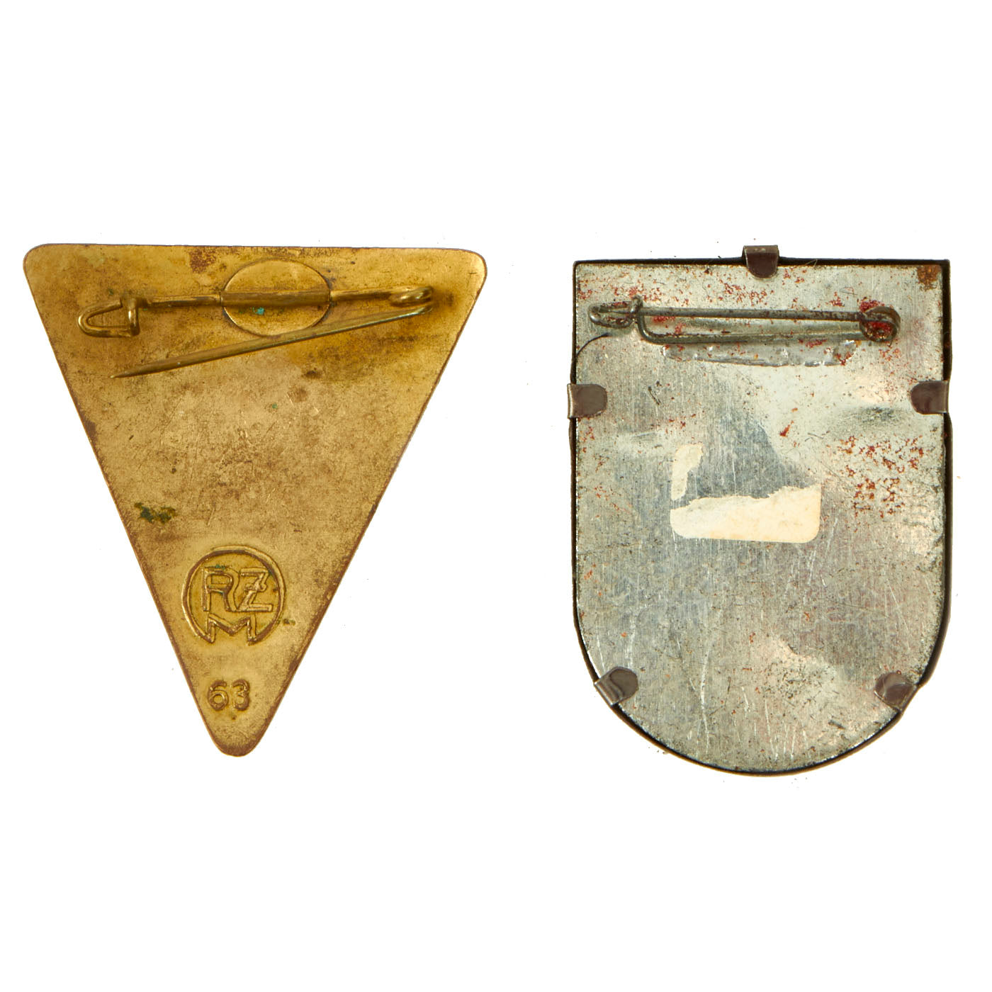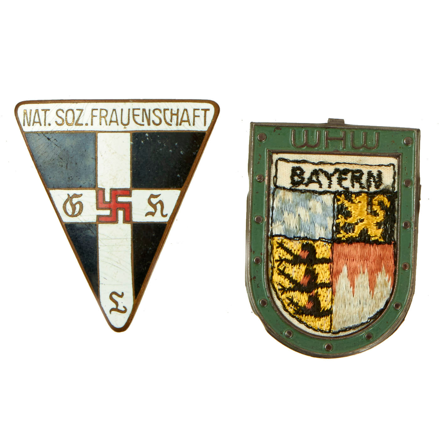 - 1st Pattern Frauenschaft Women’s Organization Badge: An alloy and enamel badge in the form of an inverted triangle. "Nat Soz Frauenschaft" is in the white band at the top of the obverse, underneath is a white cross against a black background. To the center of the cross is a red, static swas, and "G" is to its left arm, "H" to its right, and "L" to its base. These letters signify the Frauenschaft motto, "Glaube, Hoffnung, Liebe" (Faith, Hope, Love). All of the letters, and the edges of the swas, cross, and the badge itself, are in the same color as its alloy base.