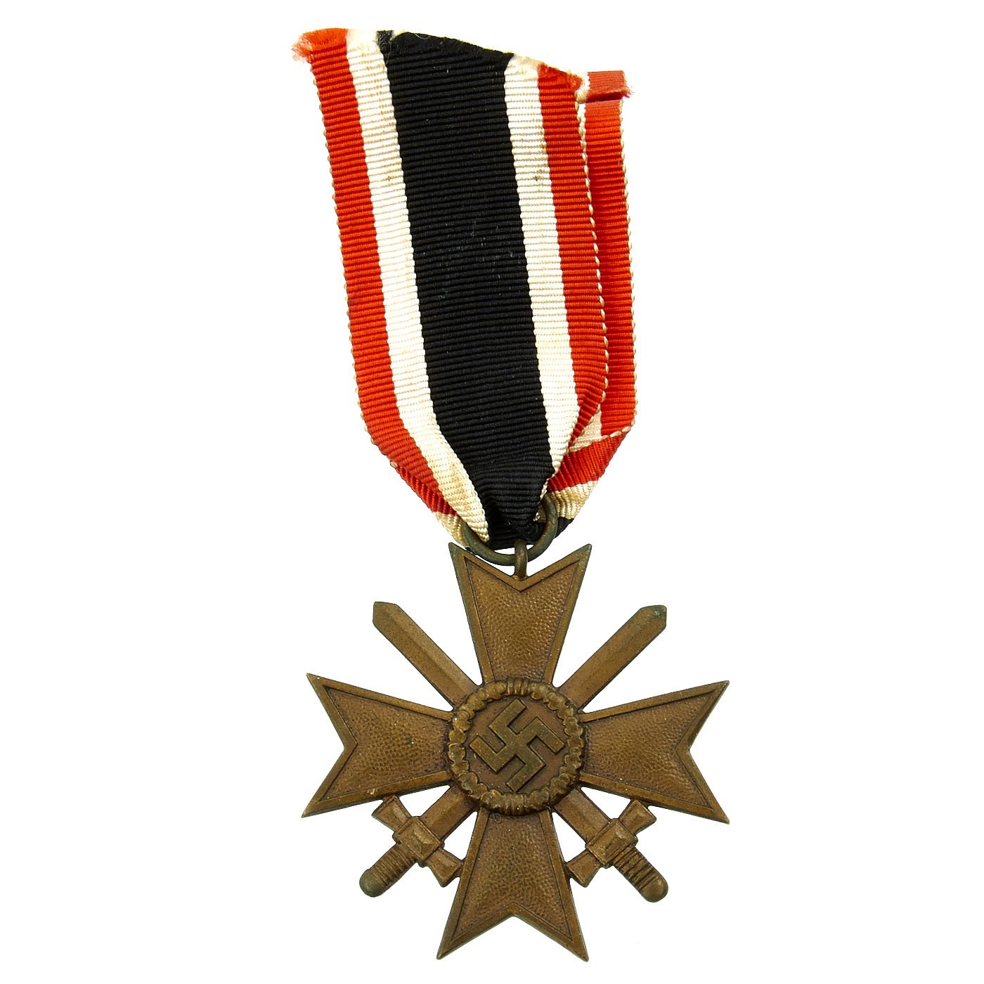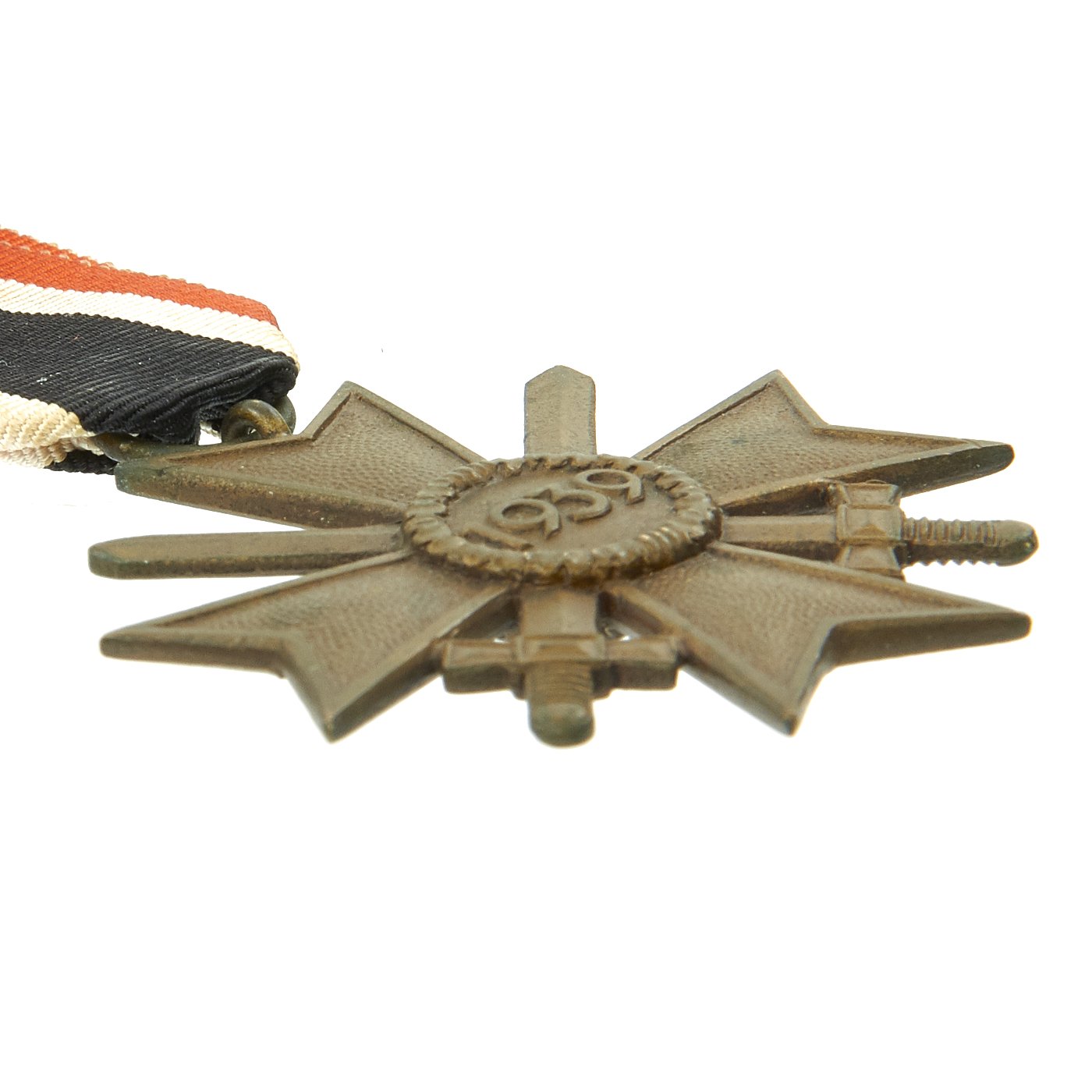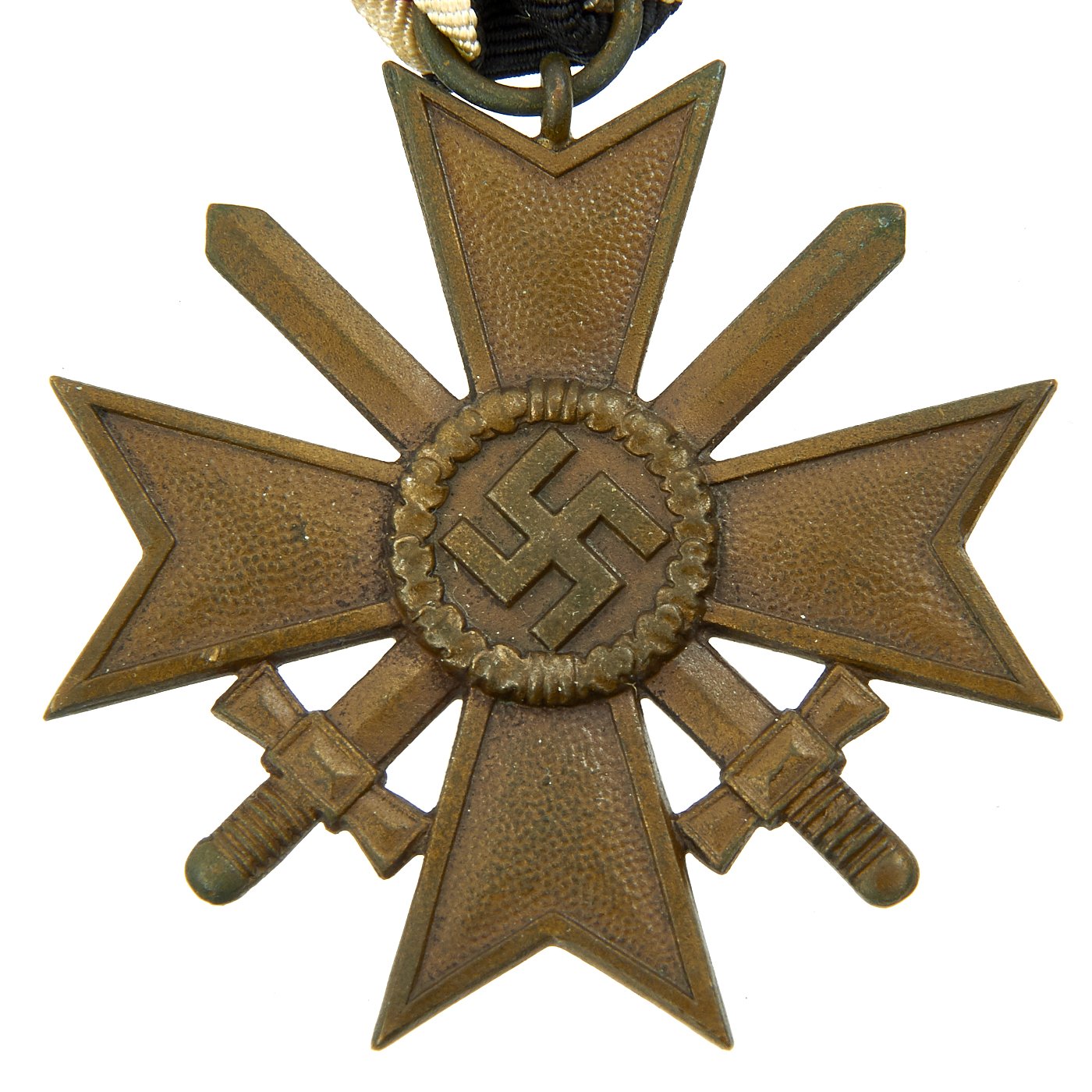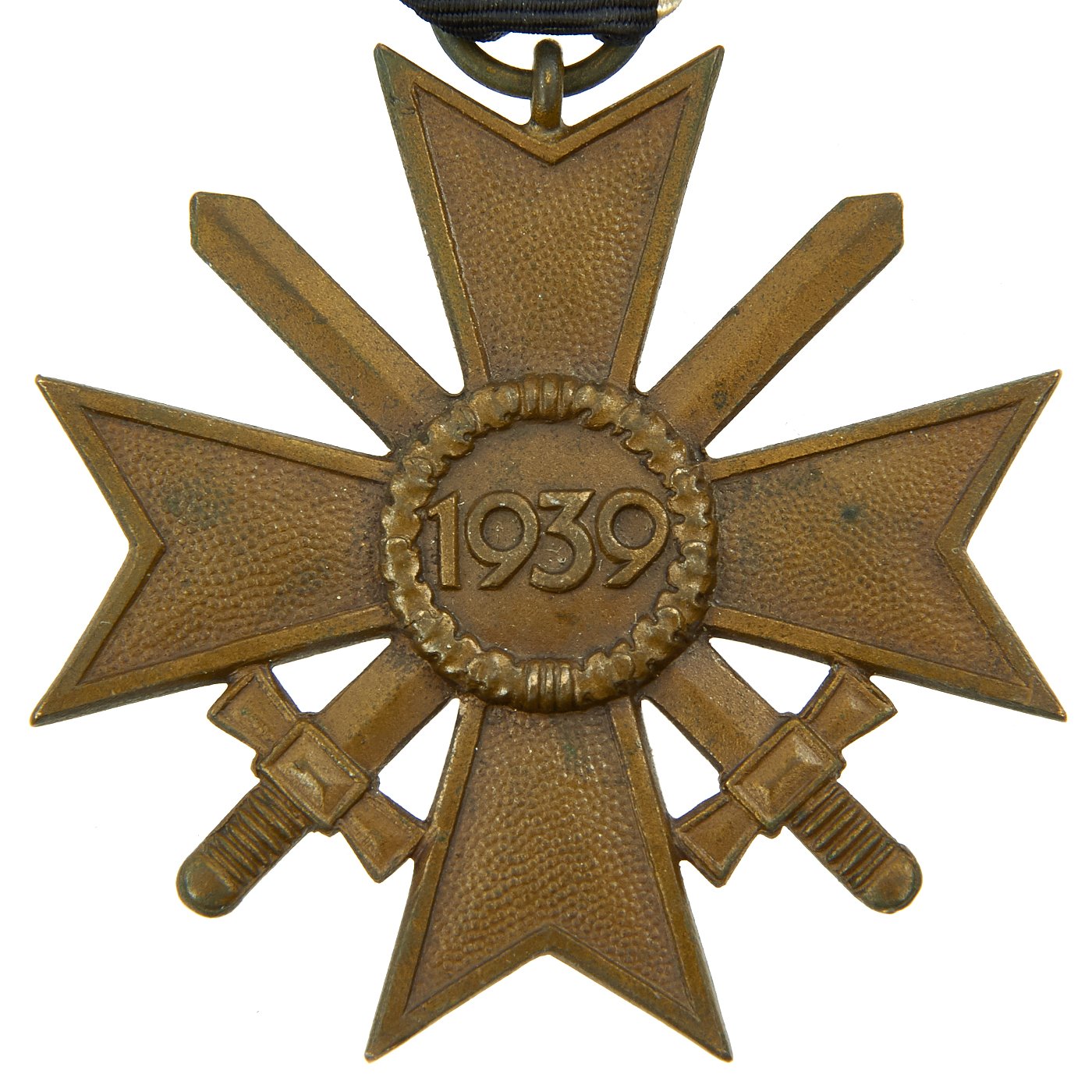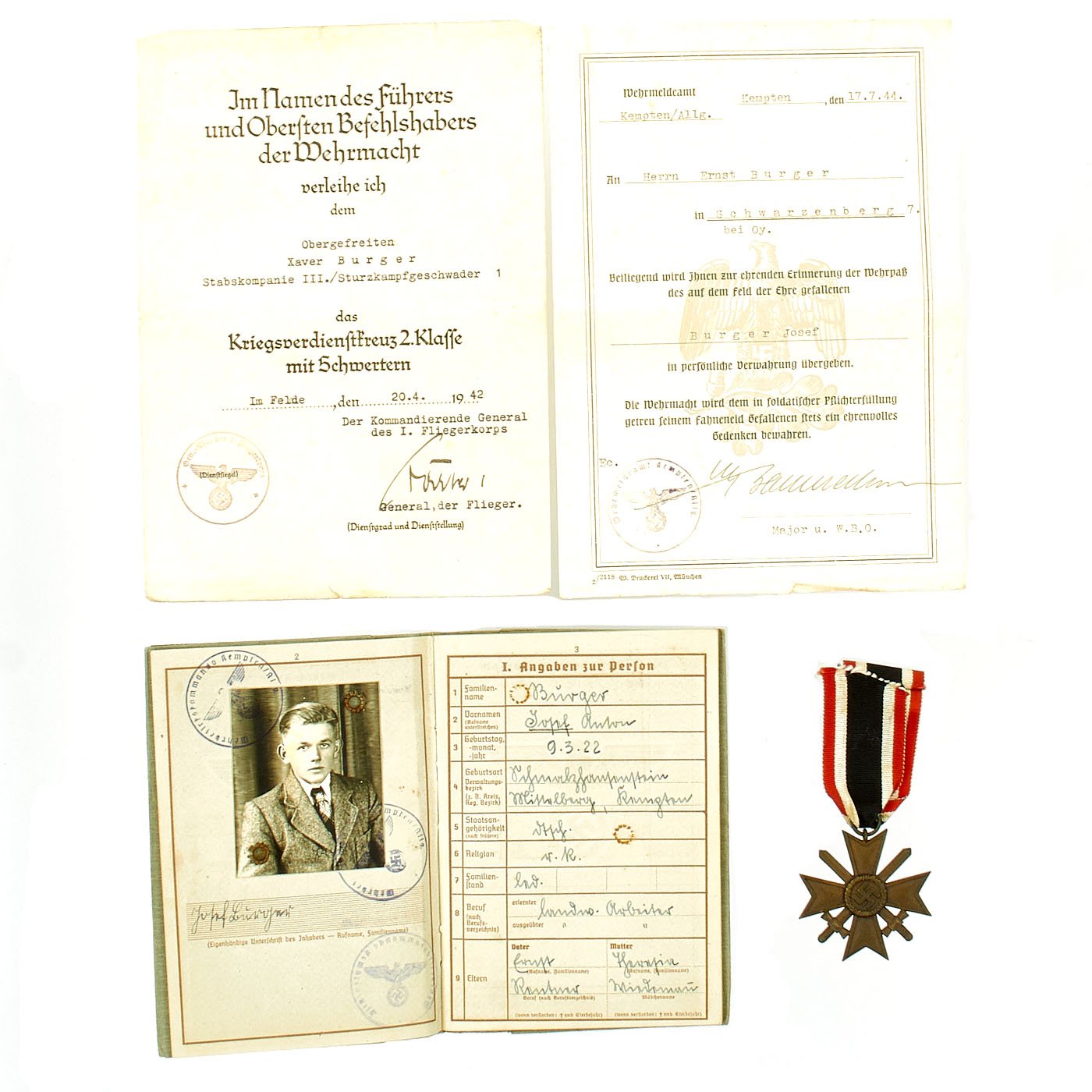 Original Items: One-of-a-kind Set. This collection belonged to brothers Josef Burger and Xaver Burger and is comprised of an Award Document for the War Merit Cross 2nd Class with Swords, together with the medal and ribbon, named to Obergefreiten Xaver Burger, Stabskompanie III./Sturzkampfgeschwader 1 (Luftwaffe Stuka Squadron).