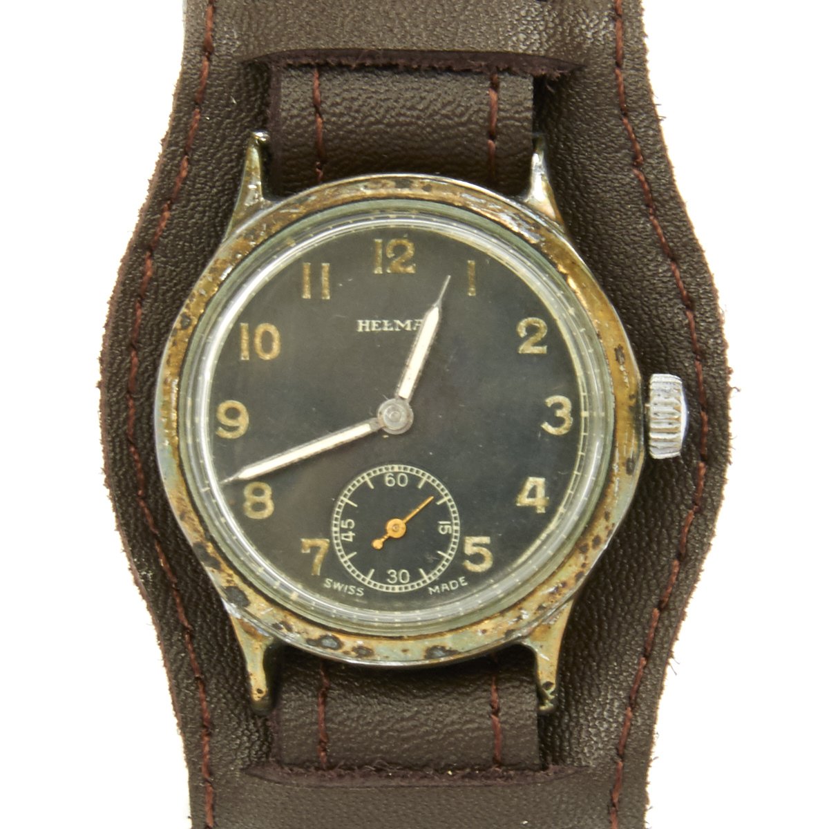 Original Item: Only One Available.This is a rare vintage 1939-1945 Swiss Military made mechanical men’s wrist watch by HELMA. Known as a “D-H” service wristwatch of the German Army for Wehrmacht officers and soldiers during WWII. All of parts of watch are 100% original with the exception of the leather wristband.