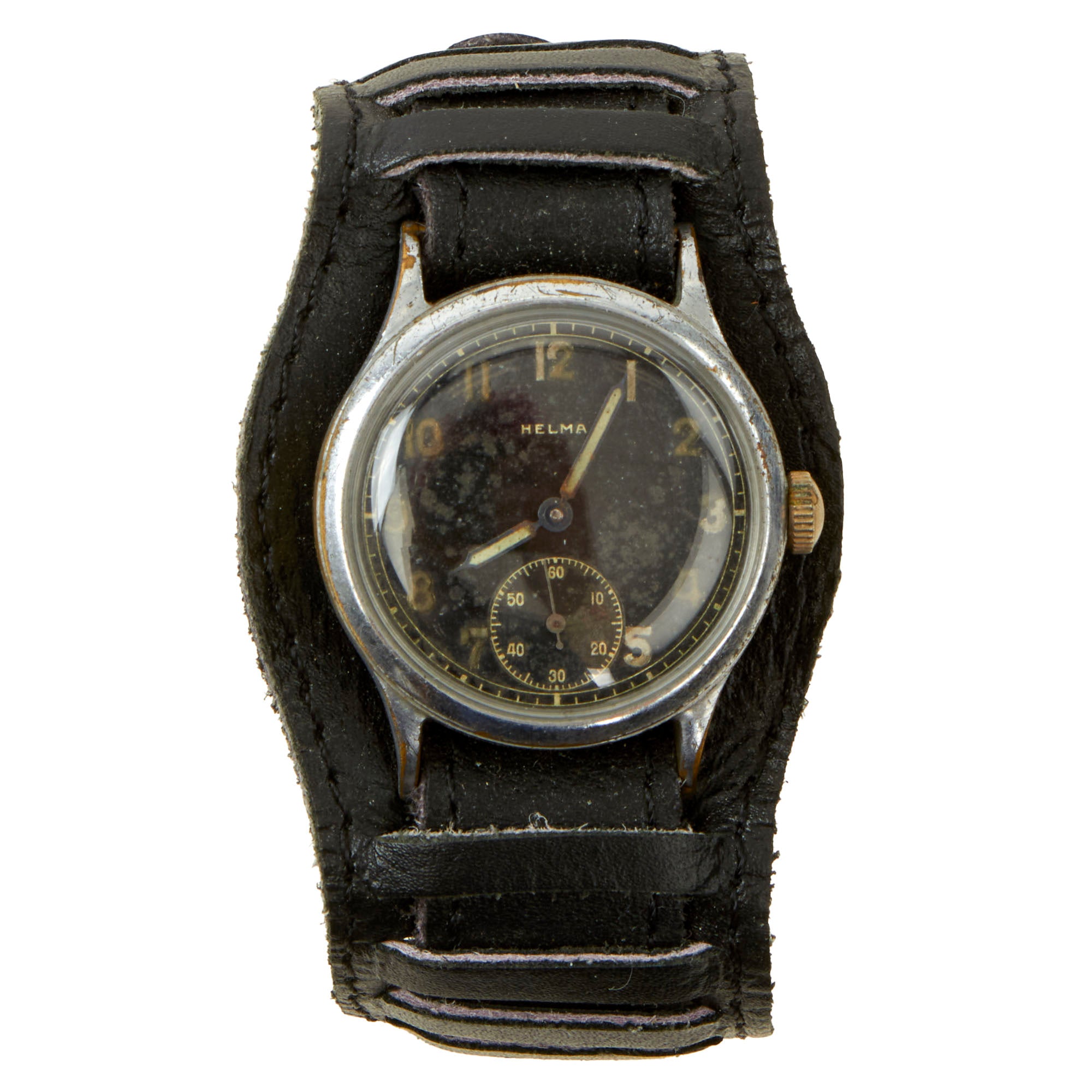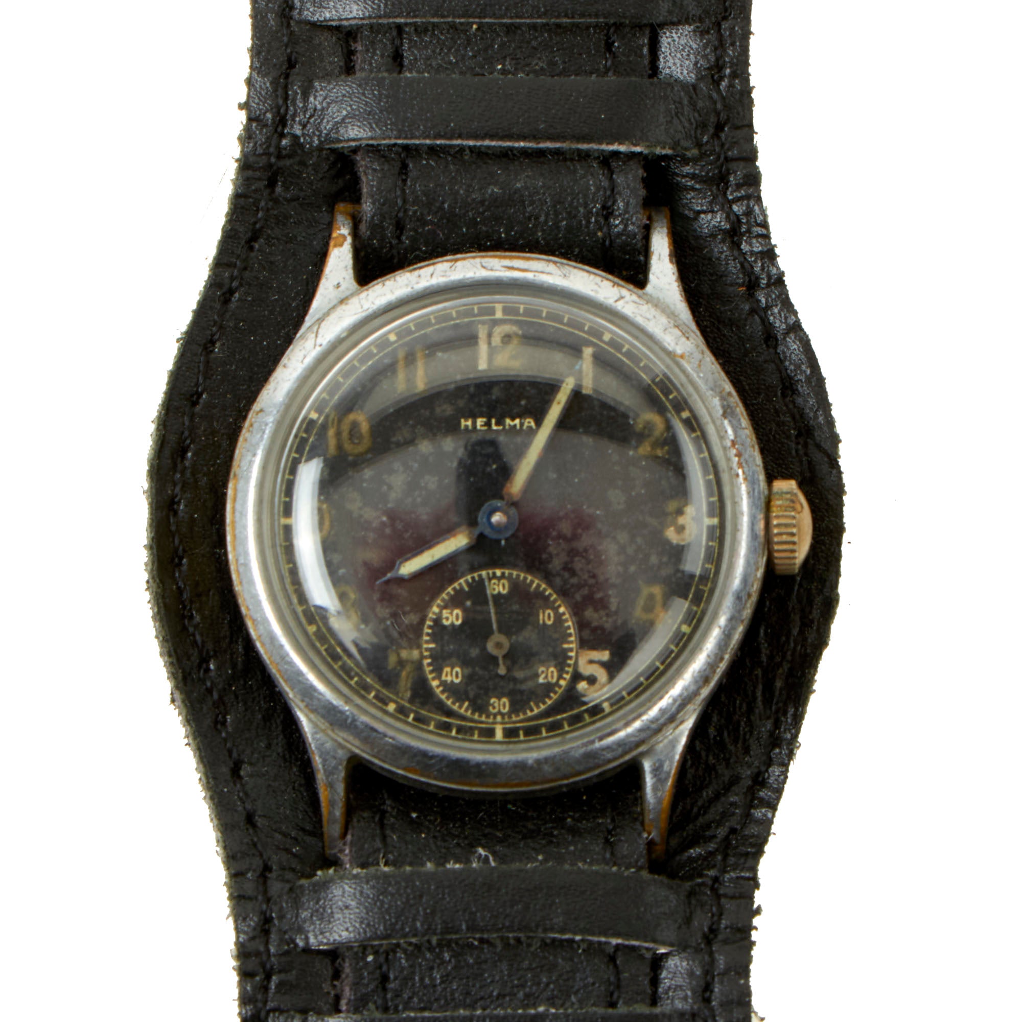 Original Item: Only One Available. This is a rare vintage 1939-1945 Swiss Military made mechanical men’s wrist watch by HELMA. Known as a “D-H” service wristwatch of the German Army for Wehrmacht officers and soldiers during WWII. All parts of the watch are 100% original with the exception of the leather wristband which is a reproduction.