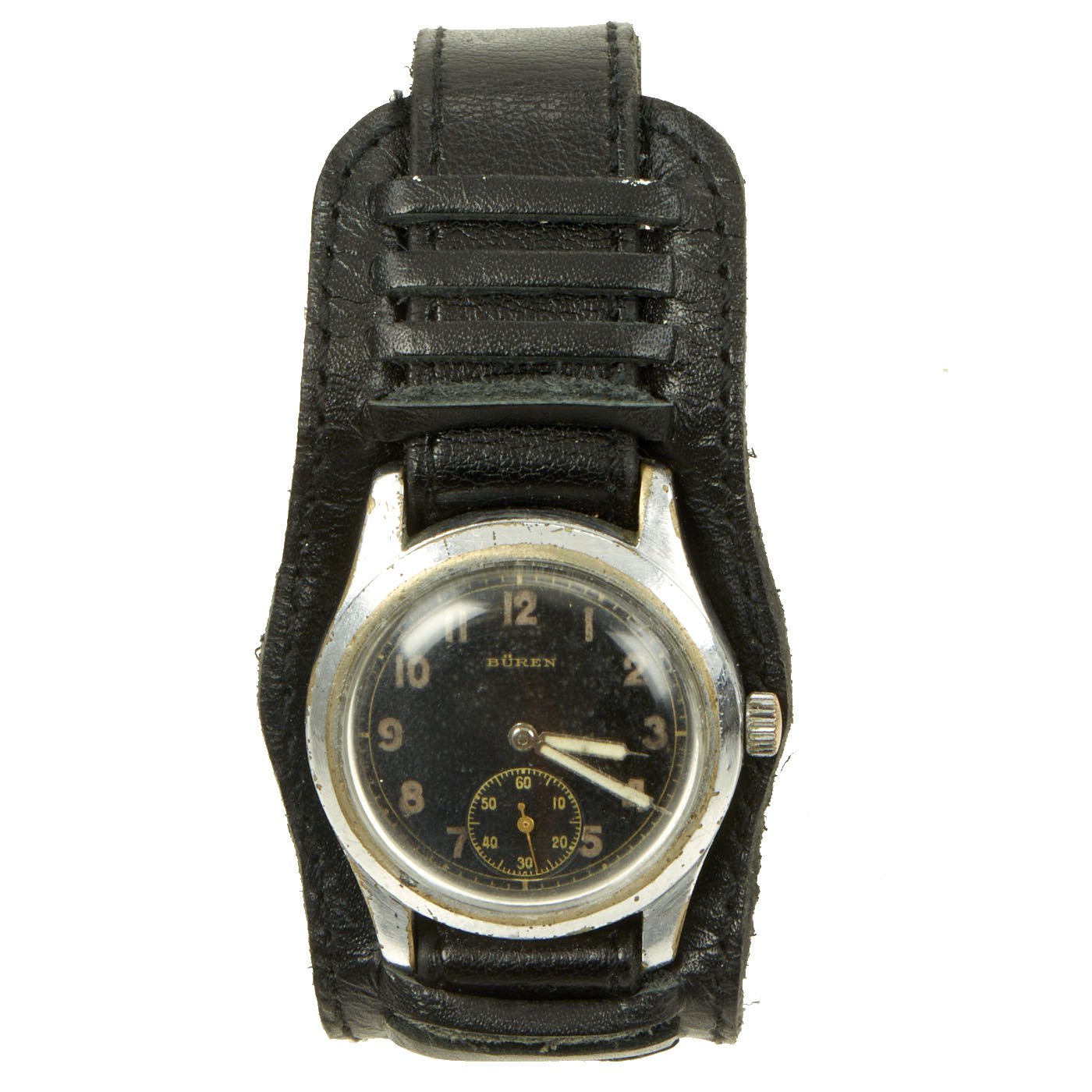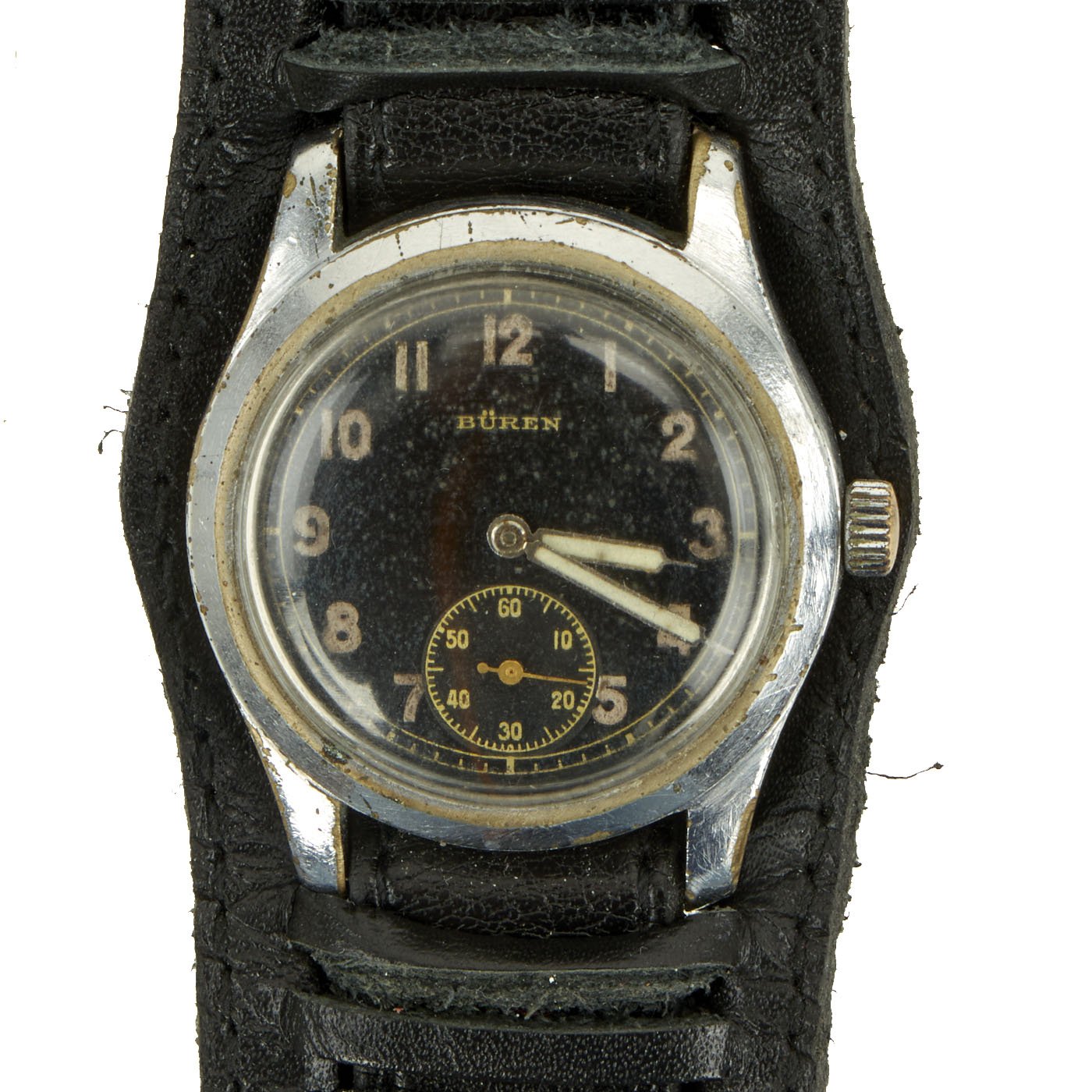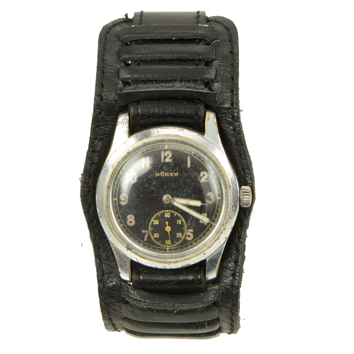 Original Item: Only One Available. This is a rare vintage 1939-1944 Swiss made, under military order for Germany, mechanical men's wrist watch by Büren. Known as a "D-H" service wristwatch of the German Army for Wehrmacht officers and soldiers during WWII. All of parts of watch are 100% original with the exception of the leather wristband, which is a high end replica.